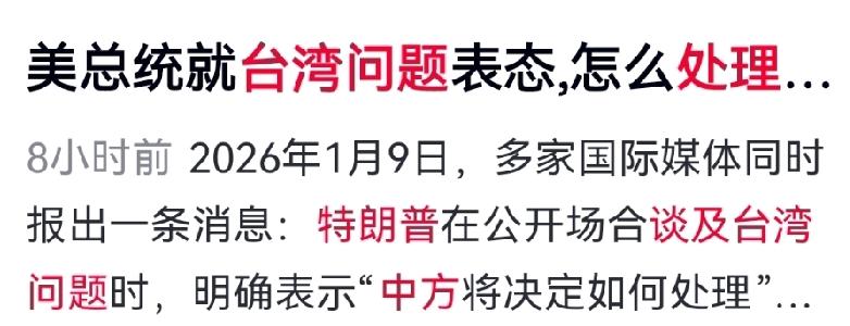 特朗普谈及台湾问题,表面称中方处理“自由”,实则暗藏算计。一句“不高兴”实为模糊威胁,试图不付成本干预台海,仍是商人博弈的旧把戏。 回顾其任内,对台政策反复无常:先限制高层往来,转身又批准巨额军售,暴露典型“两面派”面目。 中方果断反击,制裁美军工企业,强化围台军演,已实现常态化管控。美方若继续玩火,必遭更强力回击。 说到底,台湾问题的主导权,从来就不在华盛顿,也不在台北,而在两岸中国人自己手里。不管外部势力怎么折腾,怎么表态,这个根本事实都不会改变,统一大势,无可阻挡。 对此你怎么看?