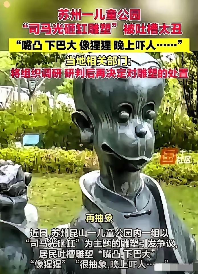 苏州公园雕塑惹争议,真相究竟如何? 昆山一个儿童公园里的“司马光砸缸”雕塑被人拍上网,结果火了,不是夸好看,是被吐槽长得像猴子。好多人带着孩子去玩,小孩一看直接吓哭,还有人说这哪是司马光,分明是黑猩猩。 这雕塑当初想走童趣风没毛病,但公共艺术总得先贴合大众认知吧?20年前没争议,不代表审美不过时,现在大家见多识广,自然容不下这种脱离文化内核的“抽象”。没必要扯什么故意丑化,大概率是创作没把握好度,忘了儿童公园的雕塑首先得亲切、有教育感。 官方要发问卷听民意的做法挺实在,公共艺术本就该服务大众,不是艺术家自嗨的工具。艺术可以创新,但不能创新到让人认不出主题、吓退受众。你觉得这雕塑该直接换掉,还是微调一下保留?来评论区说说你的看法~