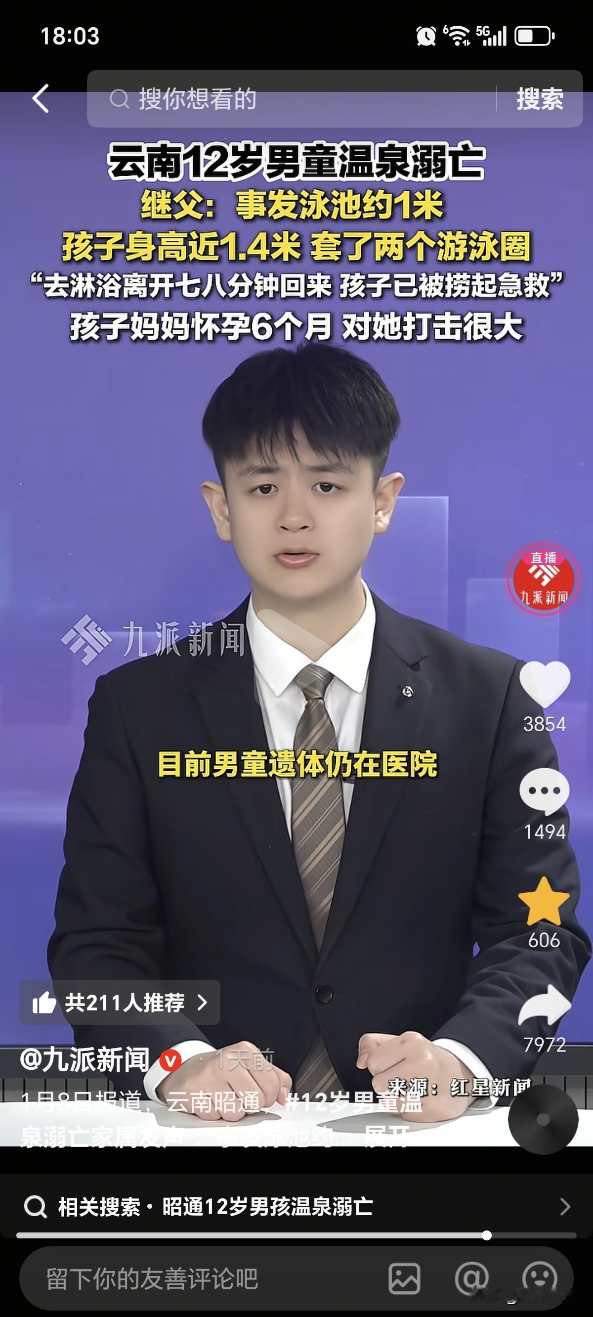 1月3号,云南12岁男孩泡温泉溺水去世,如今已经过去6天,遗体还停放在医院,因为双方还没协商好,而温泉老板愿意拿出20万,虽然有免责声明,可毕竟在自己地方出的事情,也算给予人道主义赔偿吧。 但被继父拒绝了,没有直接说要多少钱,总是一直对溺水事件产生怀疑,要真相,面对记者采访说了几点。 第一,孩子身高1米4,温泉水高1.1米。 第二,担心一个游泳圈浮力小,所以套了两个。 结合以上2点,内心判定非常安全,就算出去一会,不至于溺水呀。 个人感觉,继父认知有些低,水的高度基本在腋下附近,行走会很吃力,光着脚,很会光滑,完全有跌倒的可能性,两个游泳圈在这个时候,反而成为累赘,限制了自救活动。 勇敢承认自己过失,没什么大不了,总是揪着不放,让遗体在冰冷的停尸房,对于怀孕6个月的老婆会更加难受,毕竟,民间讲究,入土为安。 把对12岁继子的亏欠,转移到对老婆的疼爱吧,也要好好学习一下,日常生活中如何去照顾孩子[发怒]。