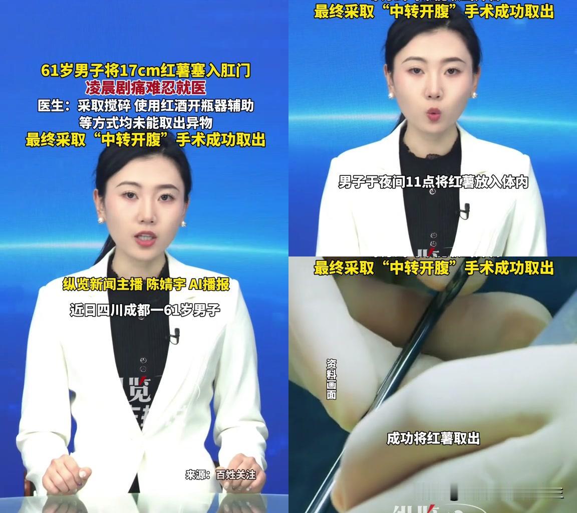 成都61岁大爷把17cm红薯塞肛门里,结果差点丢命! 凌晨剧痛到医院,医生先用搅碎、红酒开瓶器试了,没用!最后只能开腹,才把那根比小臂还长的红薯取出来。 留言里的脑洞我真是服了:有人说剪开屁股不就拿出来了,还有说把红薯煮熟的?我直接笑到括约肌发抖! 医生不是没尝试过经肛门取,可红薯直径6-7cm,距肛缘超过15cm,按照2024年消化外科标准,这已经是开腹的绝对指征!经肛门取并发症率才6.2%,但强行来的话,异物刺进肠壁会大出血;开腹虽然并发症率23.7%,可延迟开腹会让穿孔死亡率从3%飙到27%,这哪里是选麻烦,分明是选活着! 还有说剪开屁股的,肛肠科根本没这术式!你说的是肛裂的侧切吧?那切口才1cm,够塞红薯吗?煮熟?直肠是人体器官,不是焖烧杯!温度一高肠壁都烫烂了,还拿什么? 医生并非想开刀,只是有些脑洞真的会害死人!大爷这波操作是离谱,但留言里的民科建议更离谱,专业的事得听专业的,不然下次可能不是红薯,是命! 大家说,那些让剪开屁股的人,是不是把肛肠科当成裁缝铺了?