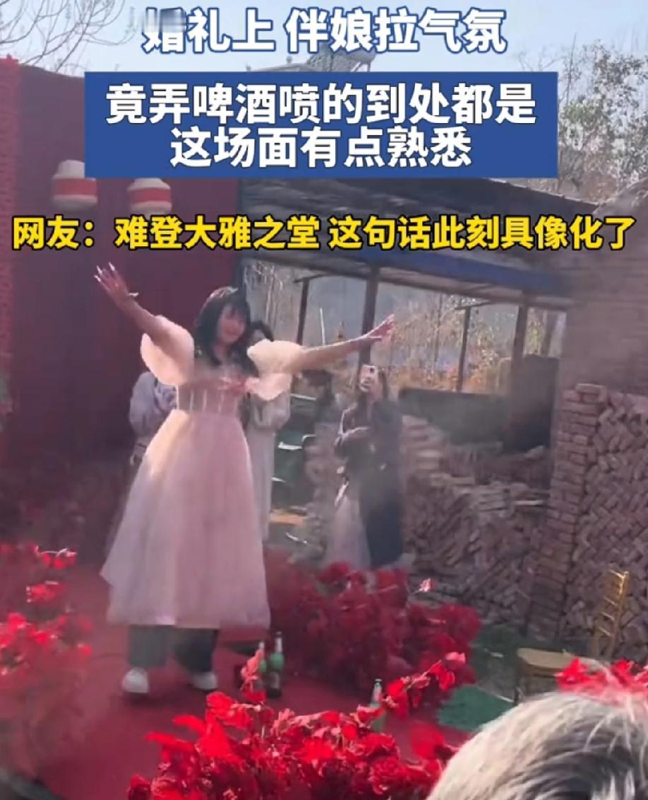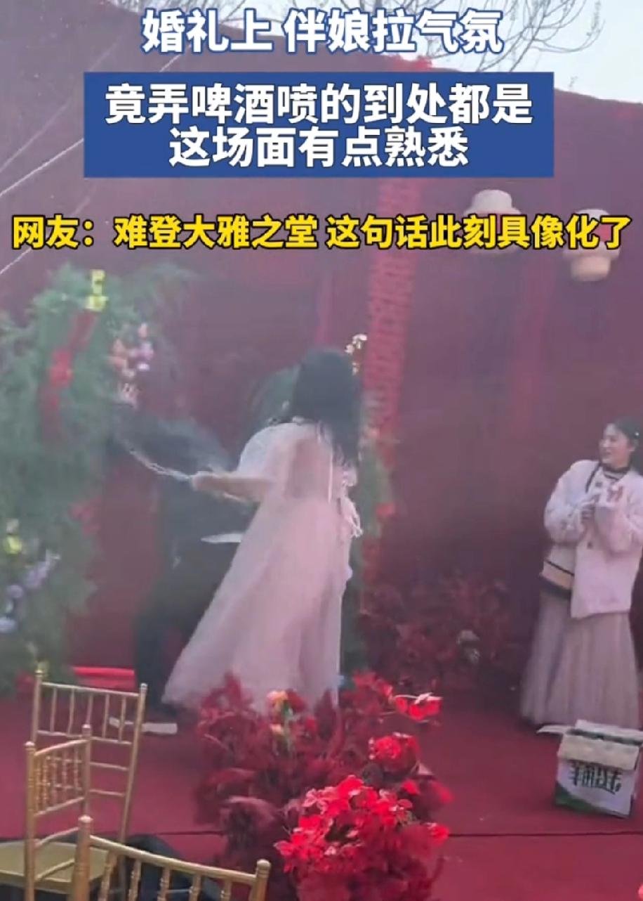 难登大雅之堂,在此刻具象化了! 婚礼上,一伴娘为了拉气氛,将啤酒喷得到处都是。就她一个人在那儿可劲得嗨,别人都不配合她,她竟然也不感觉到尴尬。或许她还觉得自己挺美的,是主角挺酷的。 看着穿着,好好的伴娘服,穿成这样。你说她冷吧,上半身就薄薄一层纱布,你说她不冷吧,下半身还穿个裤子。然后又蹦又跳的,整得自己跟小丑似的。 虽然说气氛烘托到这了,不整点花样出来实在说不过去,伴娘可以来首歌或者跳个舞,实在不行撒红包或者糖也行。 大冬天,伴娘在那喷啤酒,把婚礼整得跟酒吧似的,酒喷得到处都是,还喷到别人衣服上,黏糊糊的臭烘烘的。这不是来祝福,是来毁人家婚礼的吧。 人以类聚物以群分,男方家看到如此难登大雅之堂的行为,开始怀疑儿媳家庭教养问题了。女方这边,估计都想挖个洞把自己埋了,这脸算是丢尽了。 这场原本应该被铭记的美好婚礼,就因为一个人的不懂事,成了大家茶余饭后的谈资。