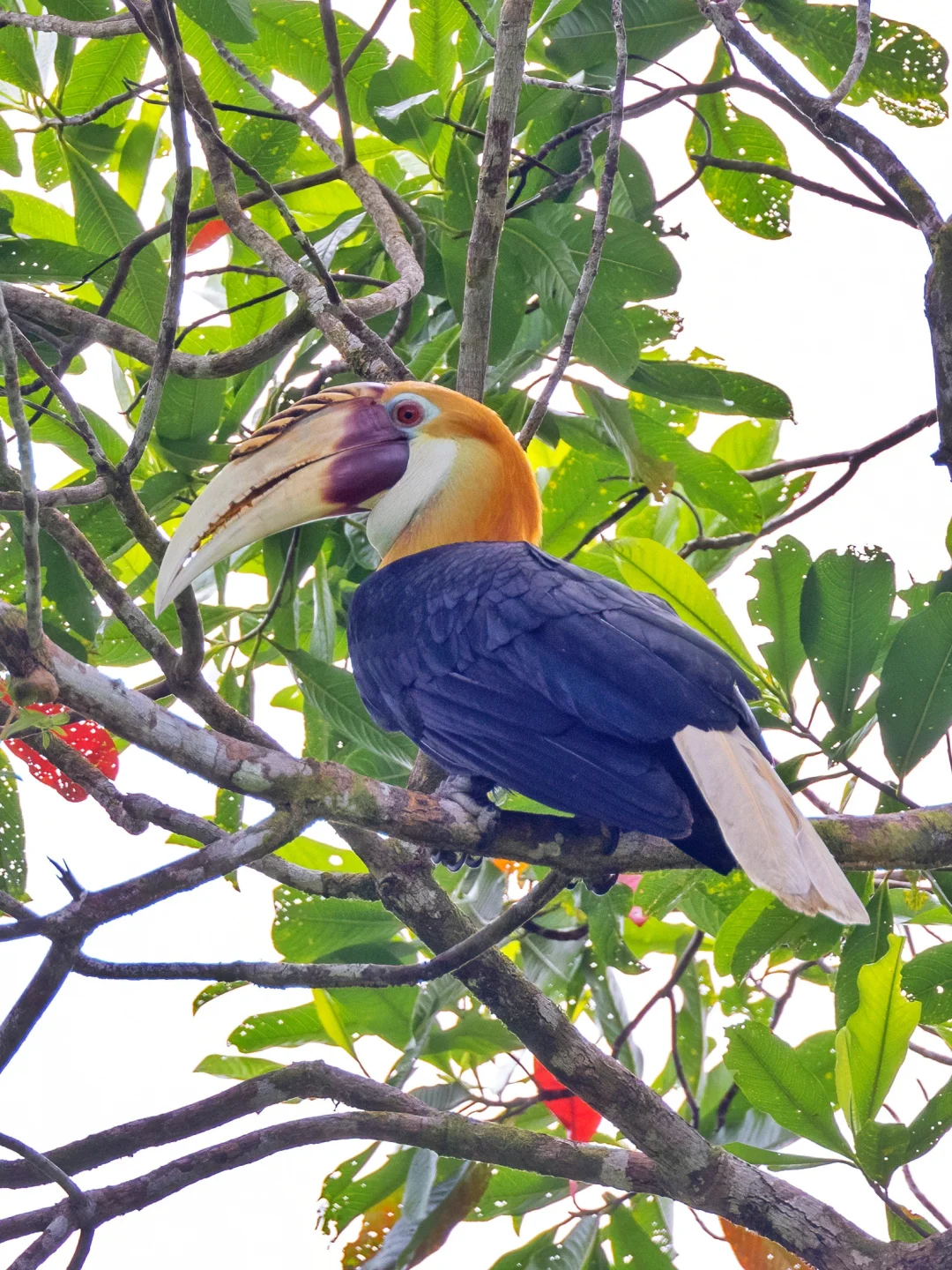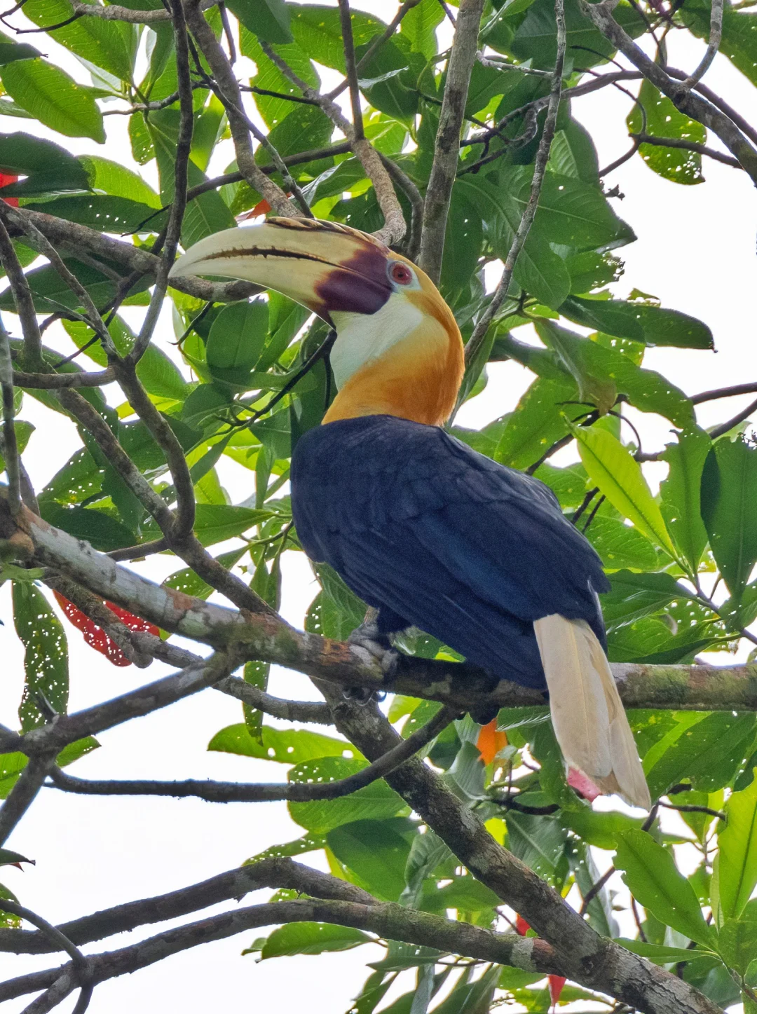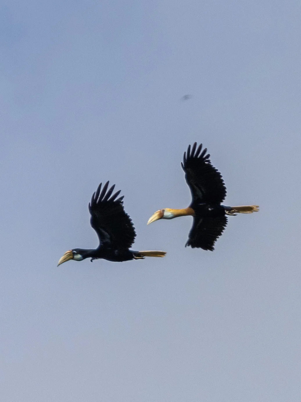 原创拍摄于2024.09 蓝喉皱盔犀鸟,犀鸟目犀鸟科花冠皱盔犀鸟属。 这是一只雄鸟弟弟,和雌鸟不同,主要黑色羽毛,但是头部呈金色或橙色,喉部带蓝色,尾部白色。眼睛周围裸露的皮肤为淡蓝色,同时具有大而象牙色的喙和带有褶皱的冠状突起。当然,同样,犀鸟飞行时翅膀发出的响亮而独特的呼啸声,类似于蒸汽机车释放蒸汽的声音。 这只犀鸟弟弟在树枝上等妹妹,等了半天,终于最后双宿双飞了。图4。