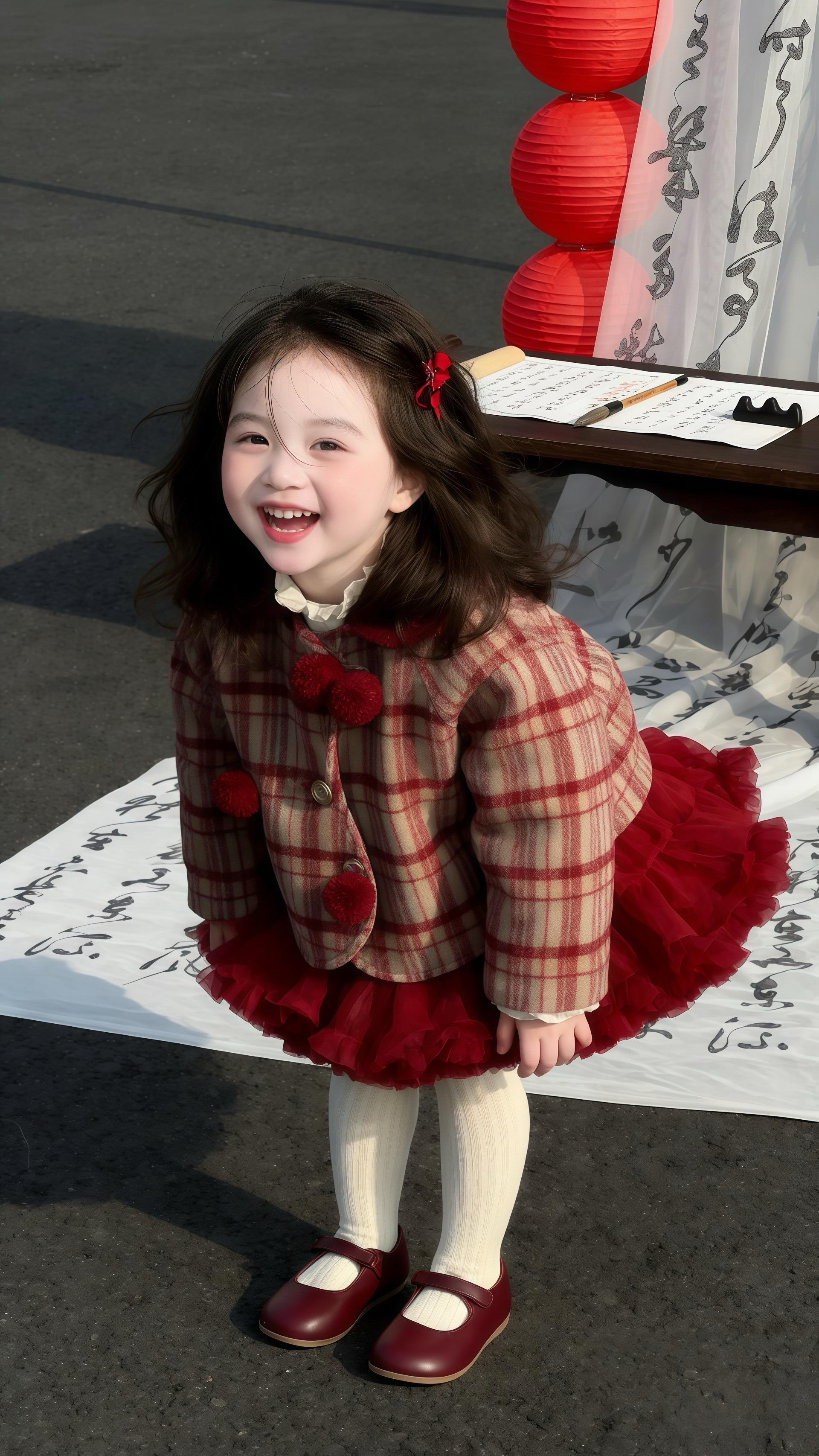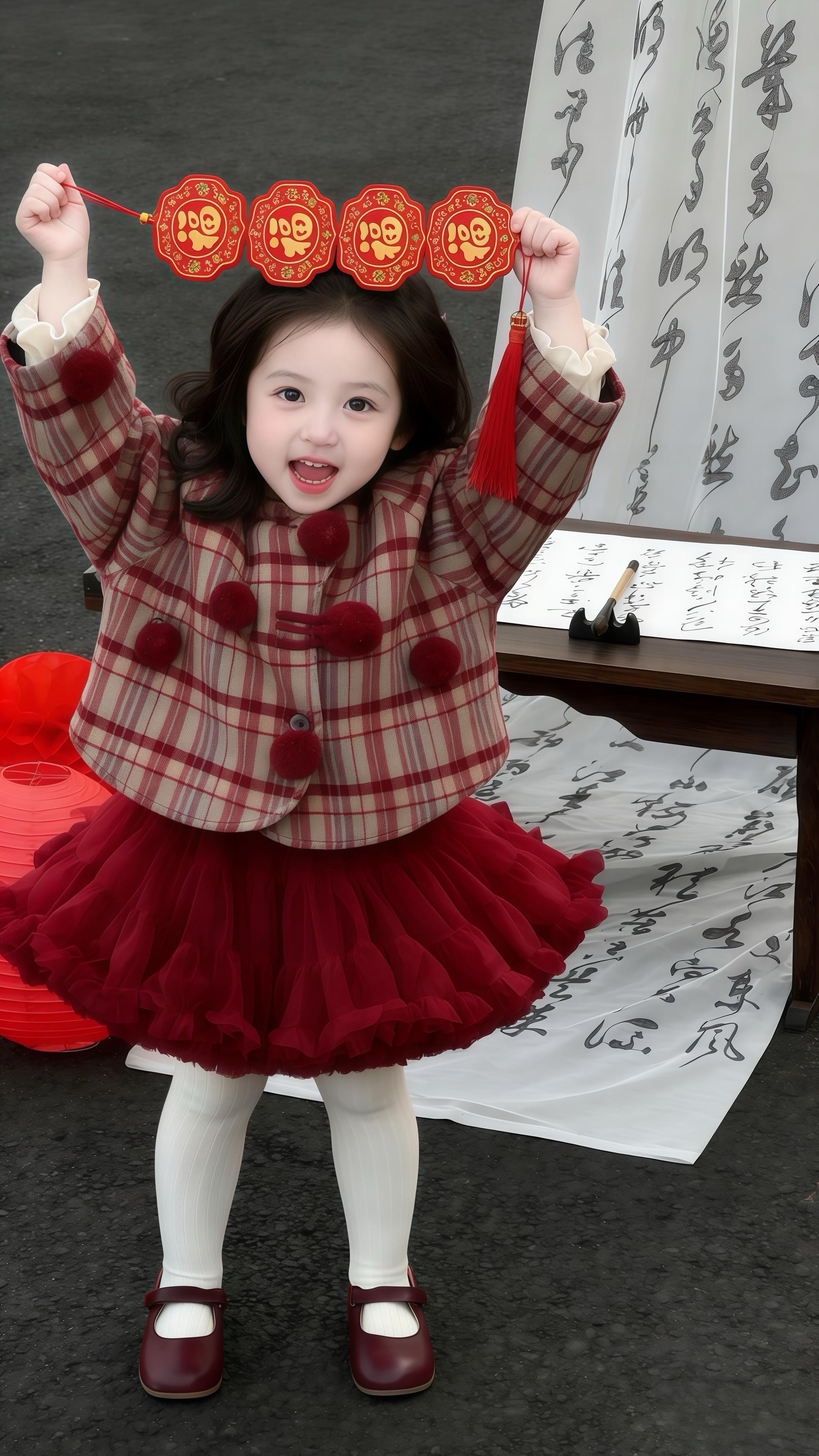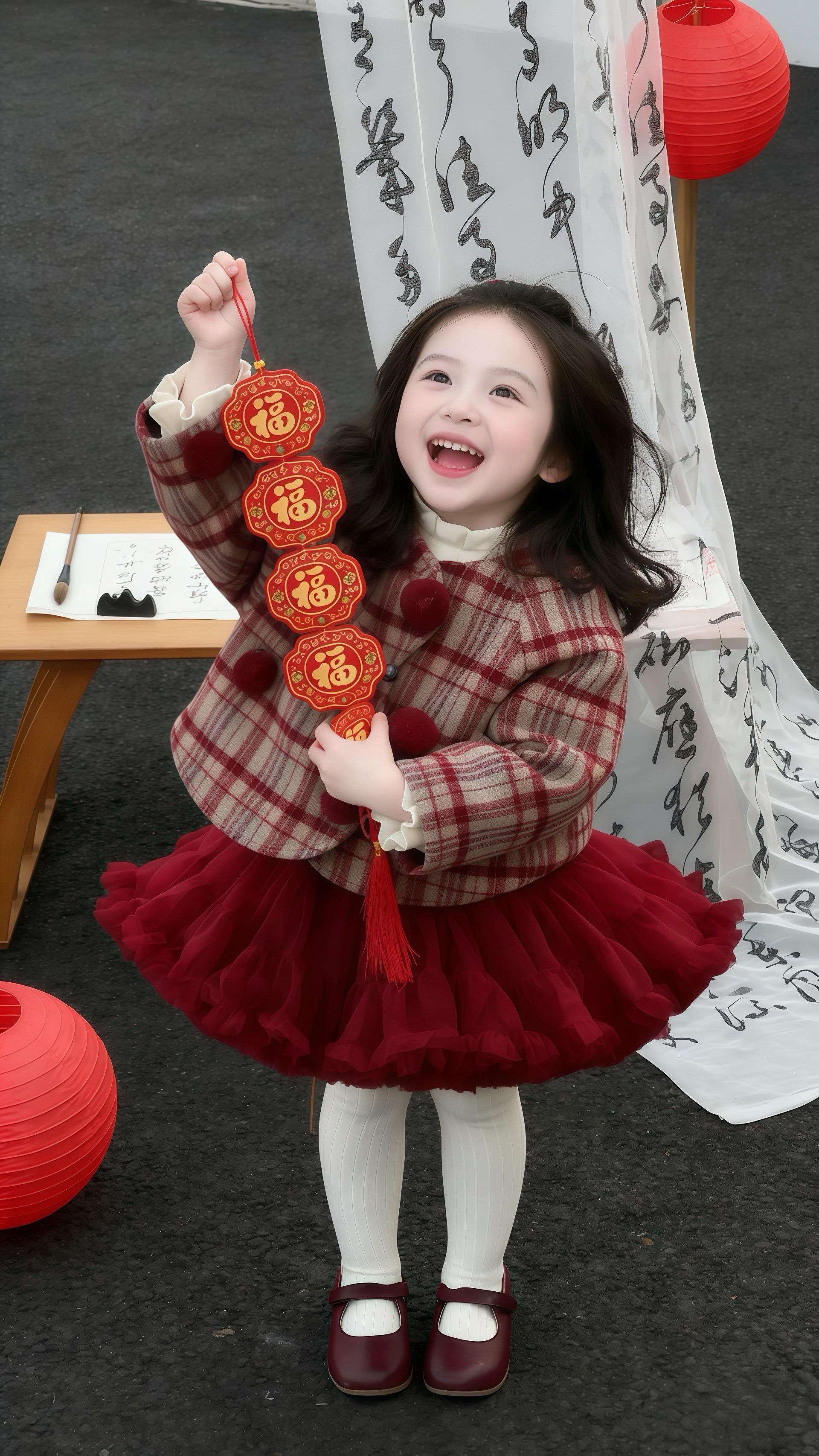 女童新年套装来啦!红棕格纹上衣柔软舒适,毛绒装饰增添童趣,酒红色网纱蓬蓬裙轻盈飘逸,孩子穿起来自在又好看,搭配酒红色玛丽珍鞋,整套造型喜庆又灵动