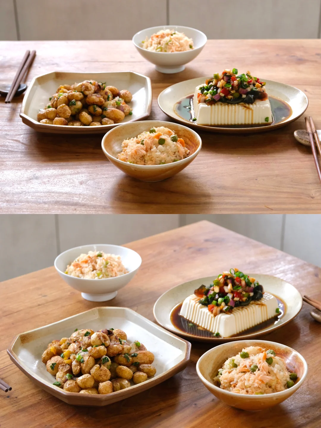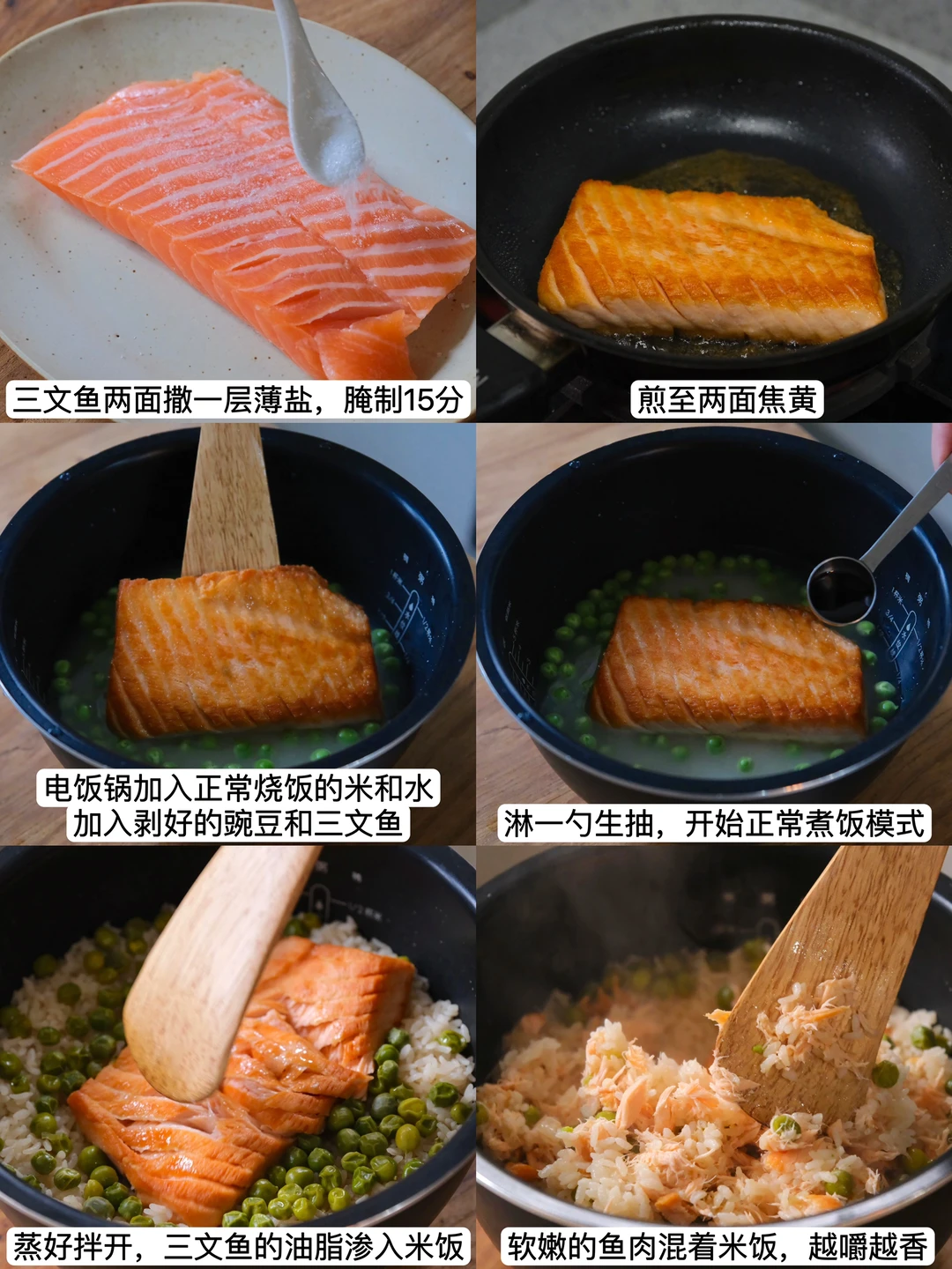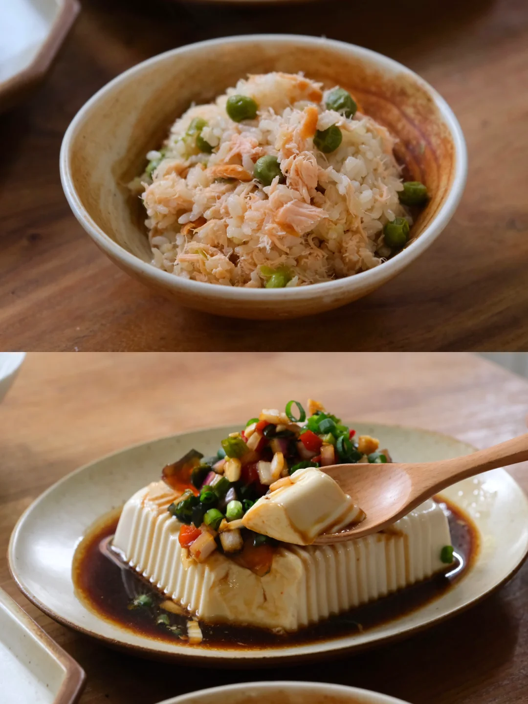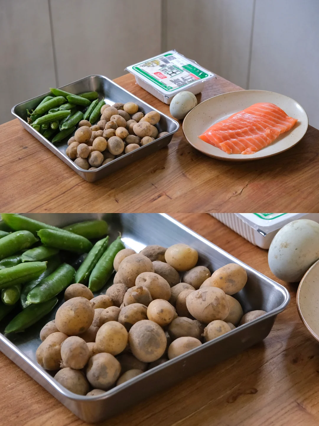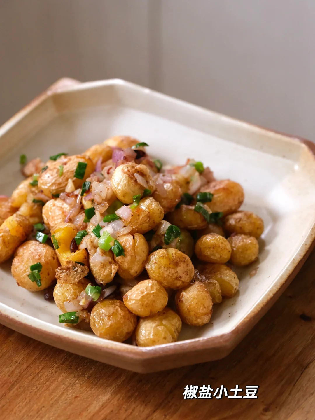 今日菜单: 1⃣️椒盐小土豆 2⃣️凉拌皮蛋豆腐 3⃣️三文鱼豌豆焖饭 昨晚的菜又留到今天发了,南方小土豆大量上市了,最近路边摊菜市场天天能买到自家种的小土豆,这次的土豆比较小,所以只蒸了十分钟,也不去皮了,个人感觉不去皮更香脆更好吃了! 这个凉拌豆腐的配料,简单好吃,被夸好多次。 最后就是,三文鱼焖饭真的太好吃了,吸饱鱼脂的米饭油润鲜香,三文鱼一戳就碎超软嫩,加了新鲜现剥的豌豆,口感很不错。
