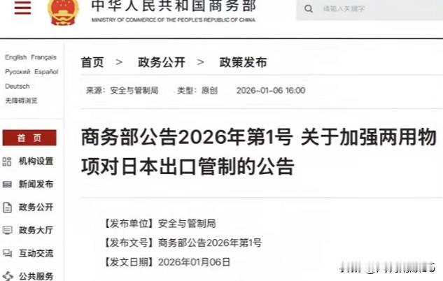 以高市早苗为代表的日本右翼势力越发猖狂,先是放话“日本有事就是台湾有事!”直接挑衅中国,一方面粗暴干涉中国内政,一方面暴露日本军国主义死灰复燃的春秋大梦! 日本不顾中方以及国际的反对呼声,不仅拒绝收回错误言论,拒绝道歉,反而变本加厉鼓吹修订“安保文件”,妄想增加防卫费,更是敢冒天下之大不韪提出拥有核武器的念头。 真是不自量力,日本高市早苗及右翼势力以为抱着美国大腿就可以肆意妄为,妄想用181亿美元就可以拉拢中国周边亚洲小国,以此围堵中国。 既然日本选择执迷不悟,我们也不惯着。新年伊始中国商务部直接发布对日本出口的两用物项进行出口管制,发布三个禁止:禁止所有两用物项出口日本军事用户;禁止对日本军事用途出口;禁止一切对于有助于提升日本军实力其他最终用途出口。精准打击日本要害,切断日本军事发展。大蛇要打七寸,否则会一直冒头!