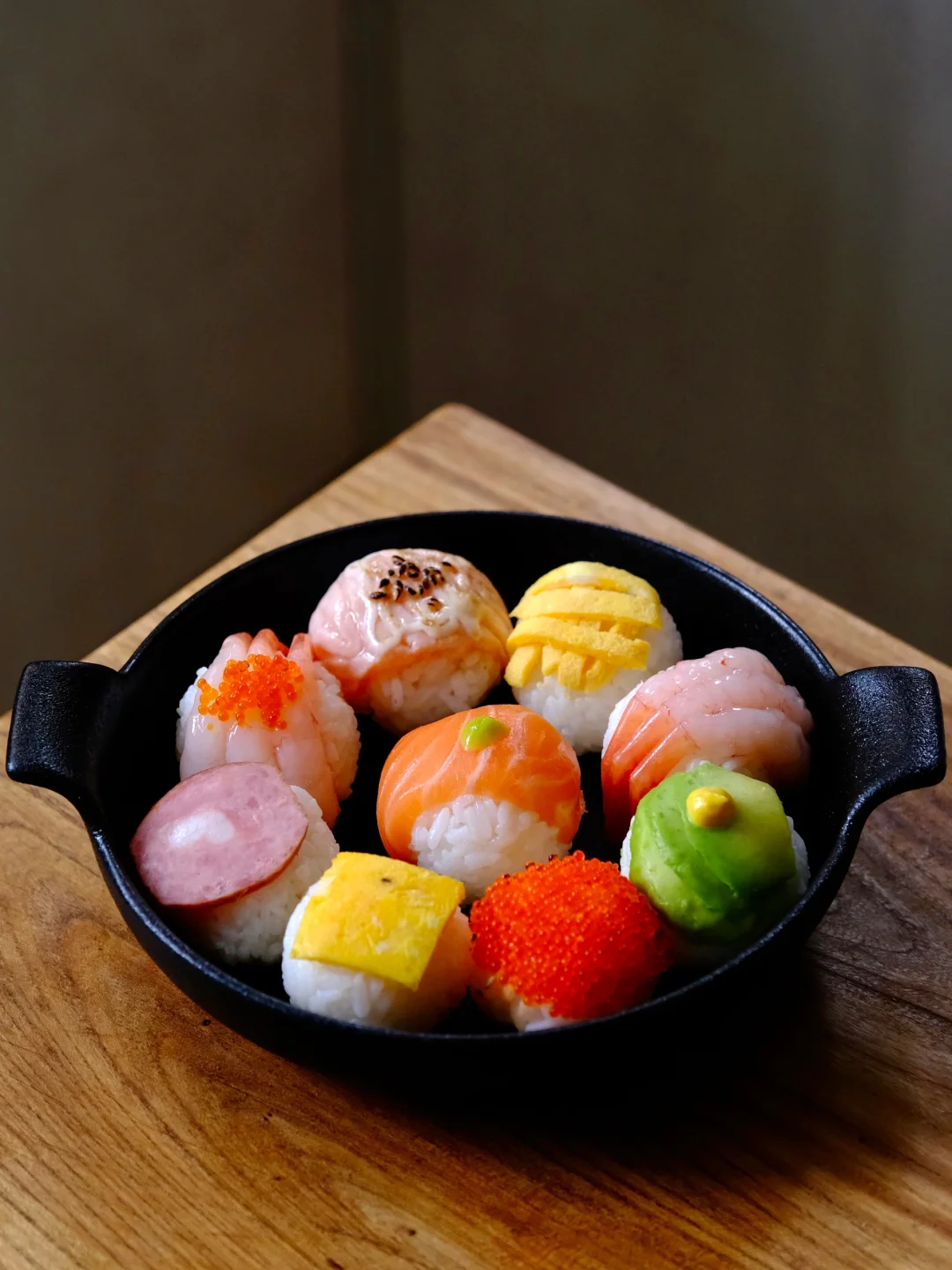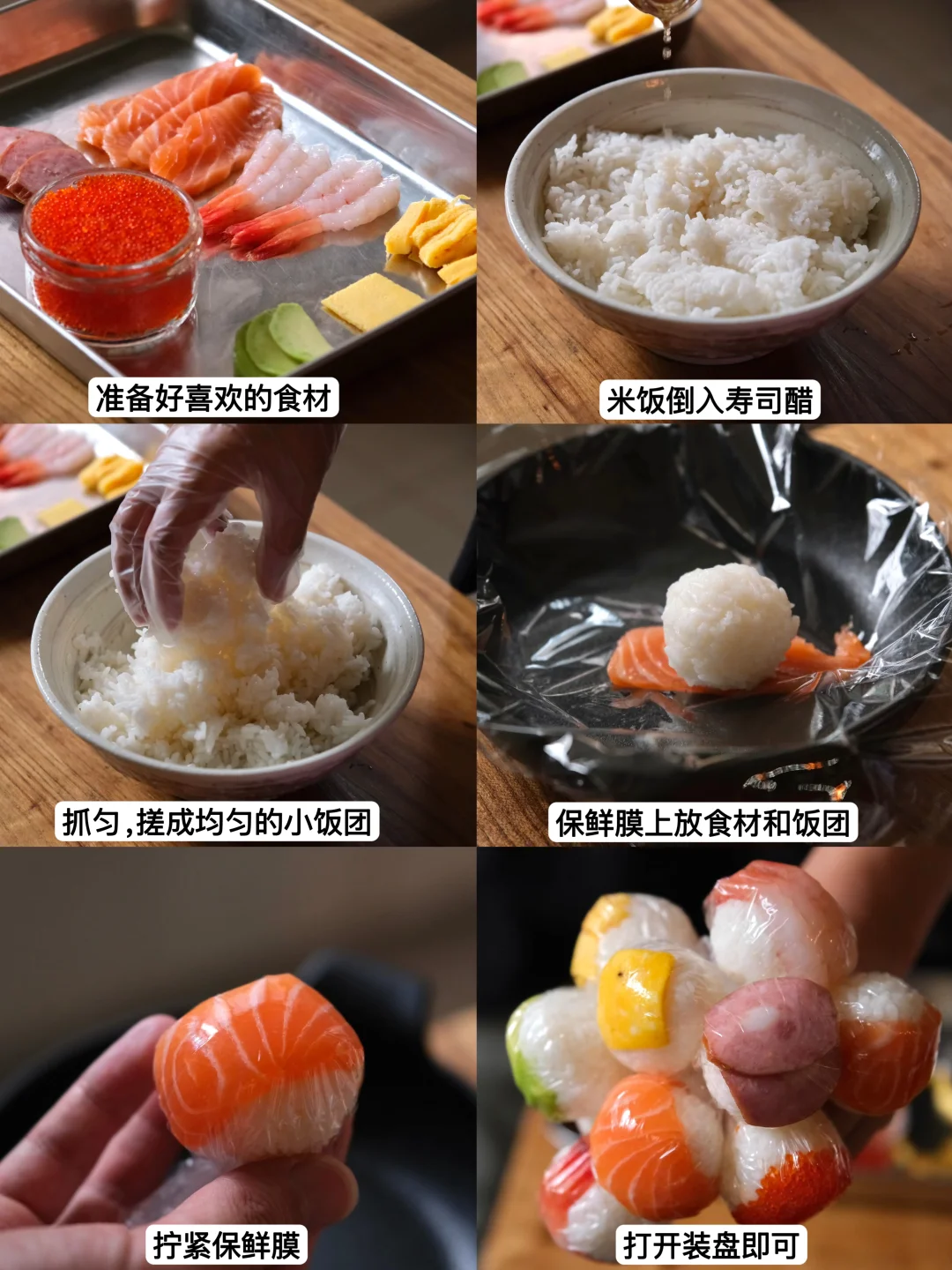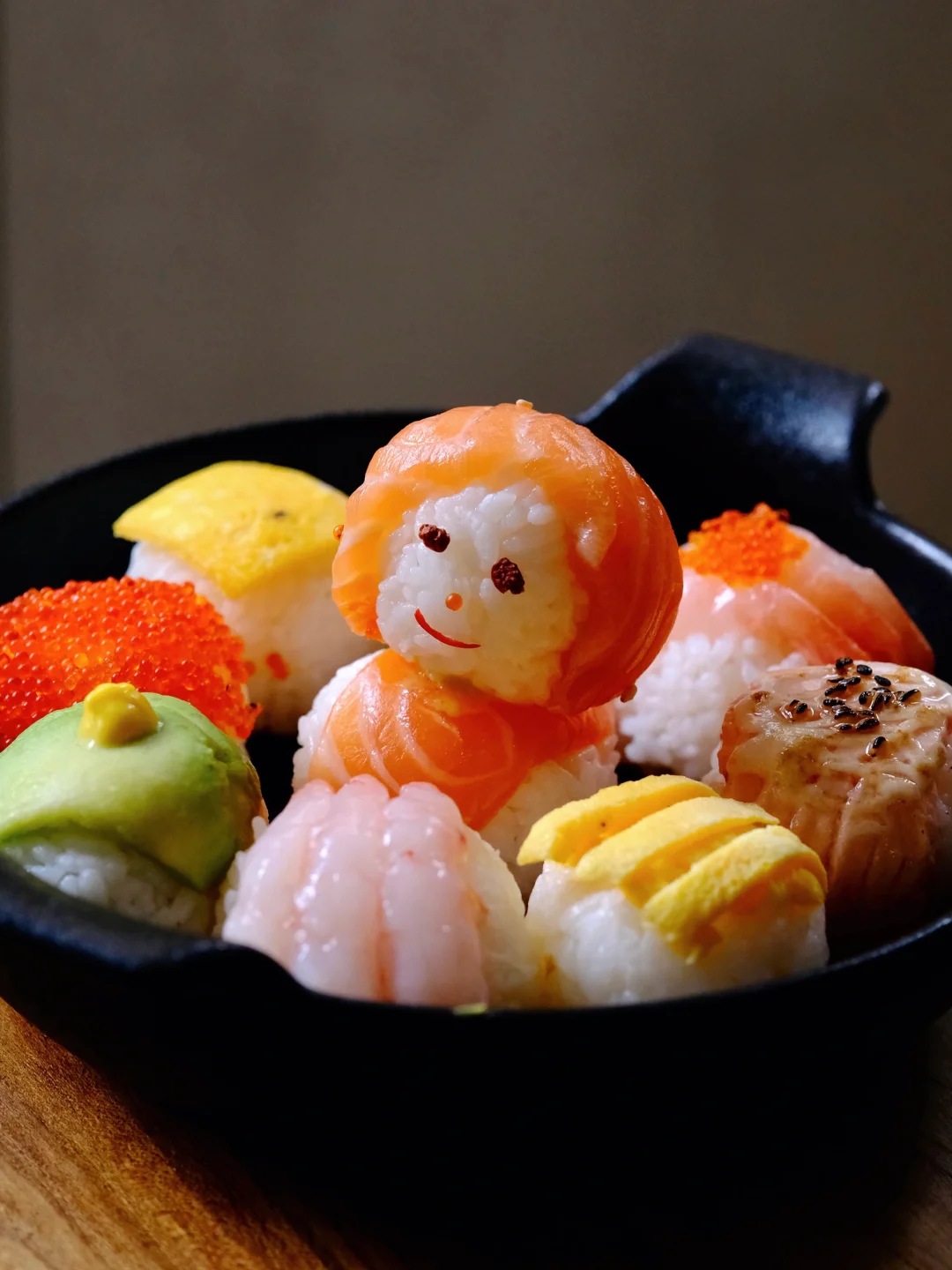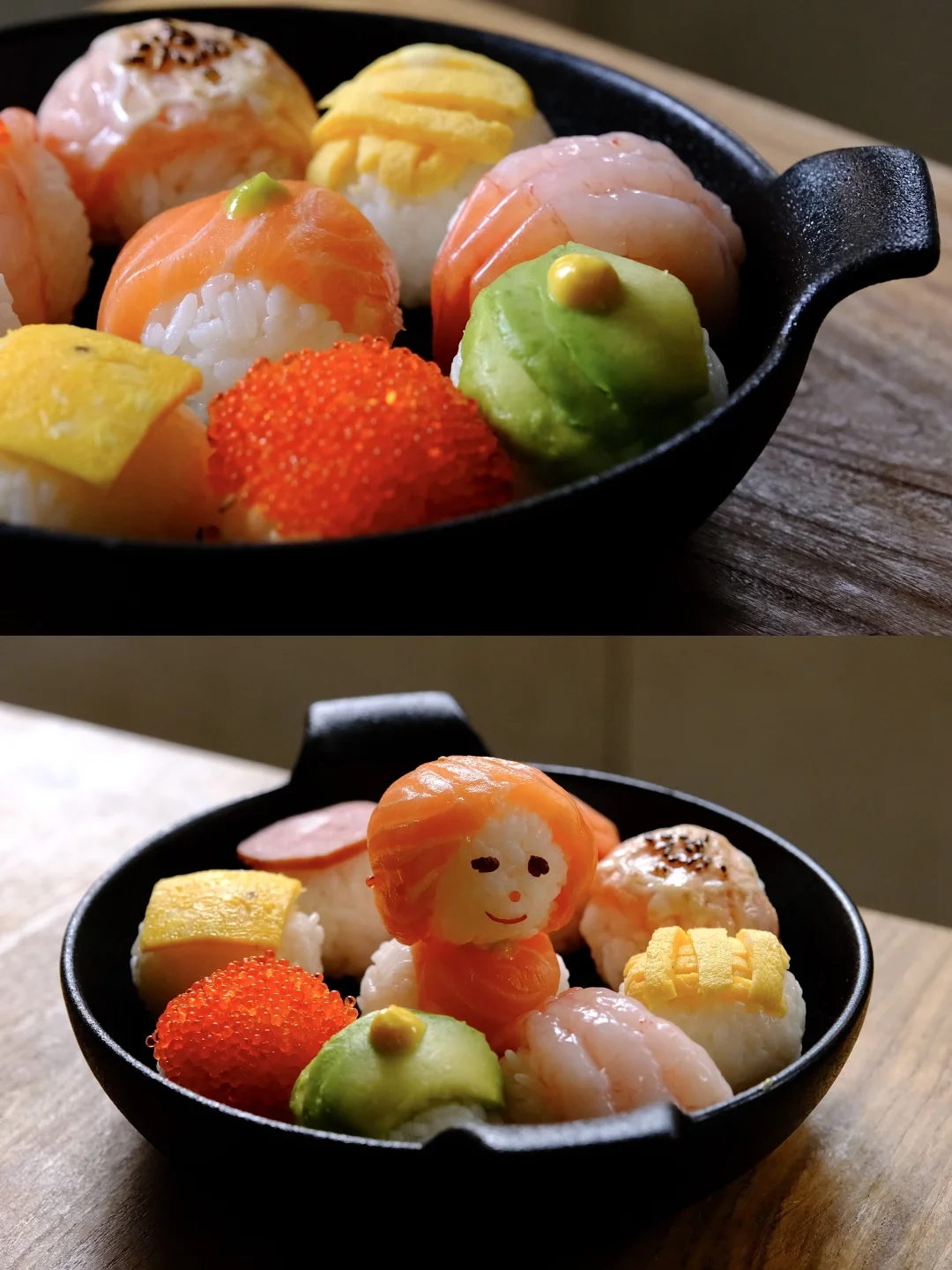 超简单又适合夏天,食材根据自己喜好就行。 我用了三文鱼、甜虾、飞鱼籽、牛油果、红肠、蛋皮。 第一次做,寿司饭我是温热的时候加醋拌匀,捏的时候差不多接近体温。 捏三文鱼的时候,发现有点像发型,没忍住给它安排上了眼睛鼻子嘴巴。