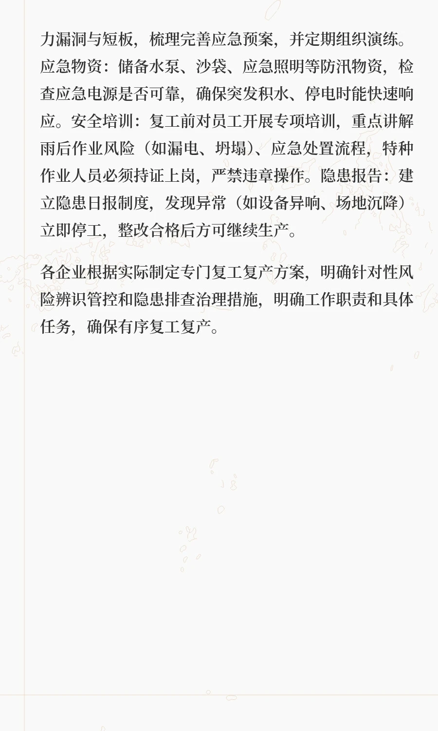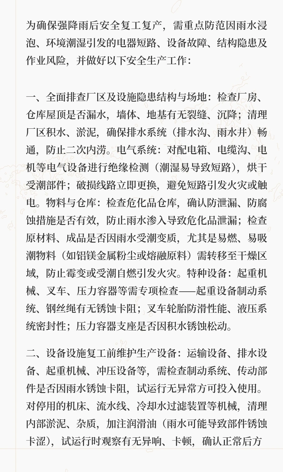 强降雨后企业复工复产需重点防范电器短路、设备故障和结构隐患。全面排查隐患,维护设备,确保排水系统畅通,检查电气、物料和特种设备,加强作业现场安全管控,完善应急预案,确保有序复工复产。