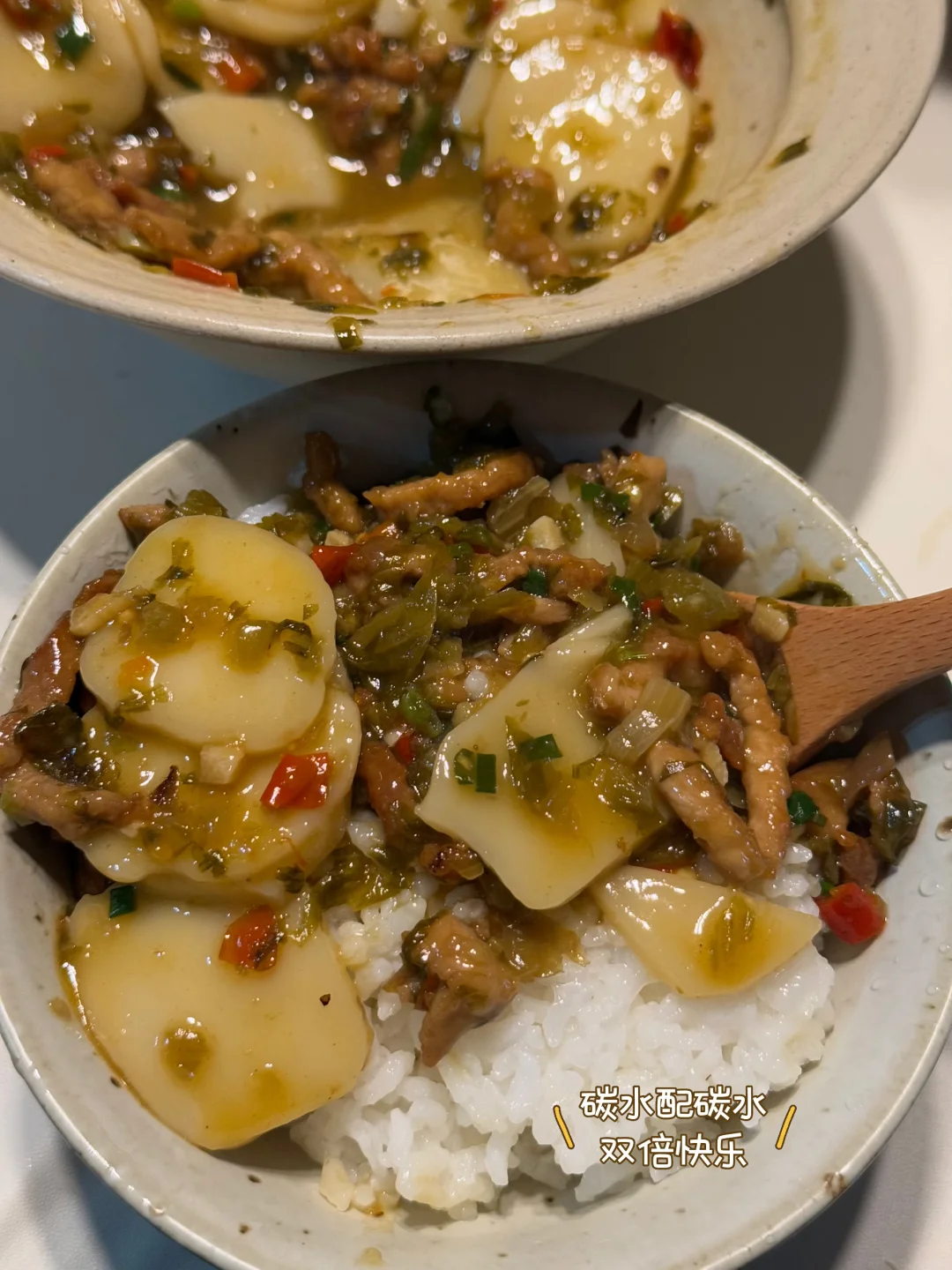 又到了狂炫年糕的季节(虽然我们这两位年糕爱好者一年四季都在吃年糕[暗中观察R]) 首战拿出最爱的酸菜肉丝汤年糕 做法巨简单,食材也巨简单,味道绝不简单 食材:肉丝、酸菜、年糕、小葱、蒜末、剁椒 做法:偷懒写在图片上了 太香了,最后忍不住拿来拌饭,年糕配米饭,双倍快乐。