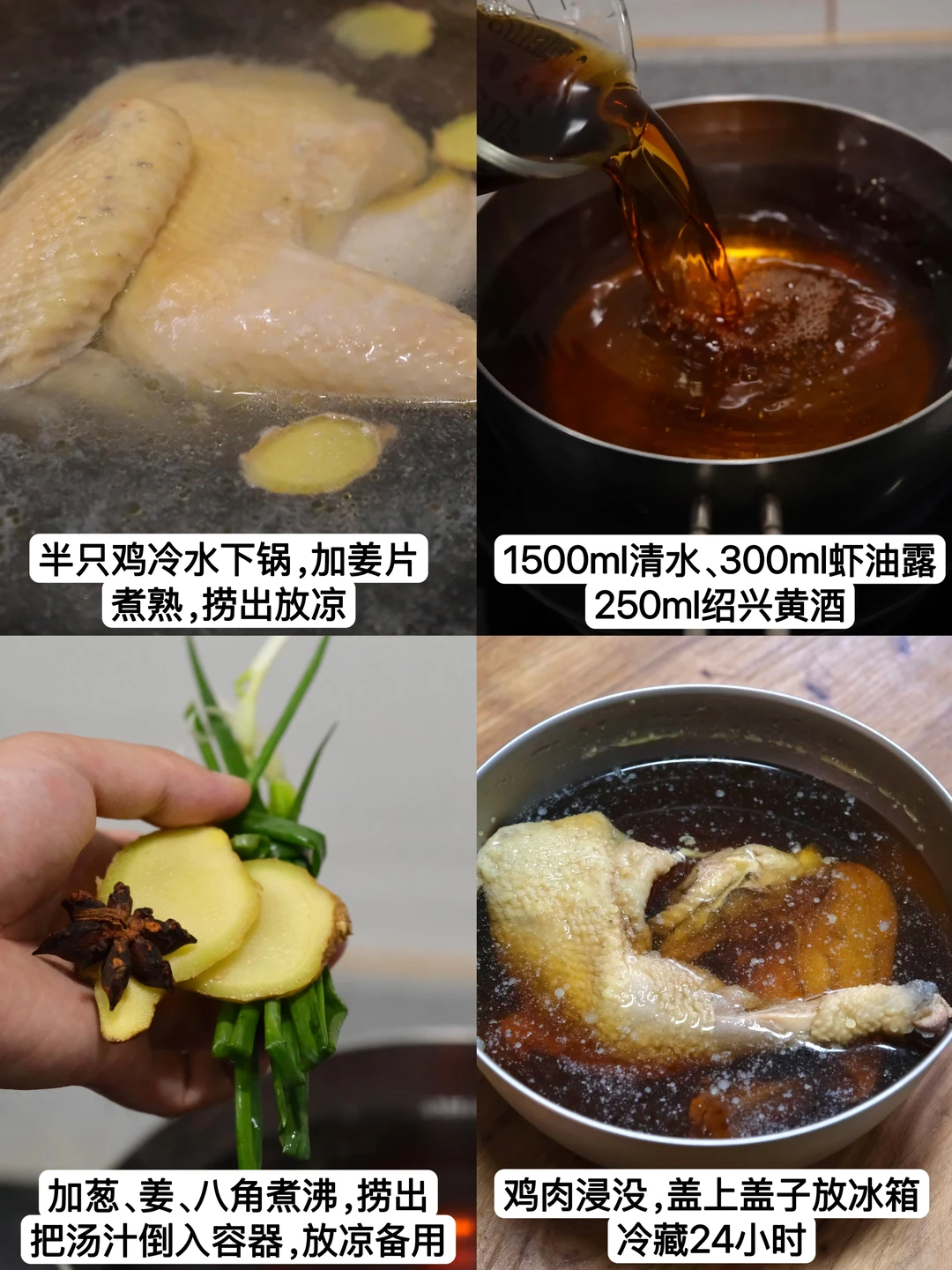 前几天买了一只鸡,半只炖了鸡汤,还剩半只吃不完,正好做成虾油鸡,夏天清爽解腻,可下饭。 简单来说就是,鸡煮熟、料汁煮熟,把鸡和料汁都放凉,鸡肉泡在料汁里冷藏24小时以上。 这个料汁很万能,一般我用两次再倒掉,浸毛豆、猪肚、鸡爪、鸭爪之类的也很好吃。