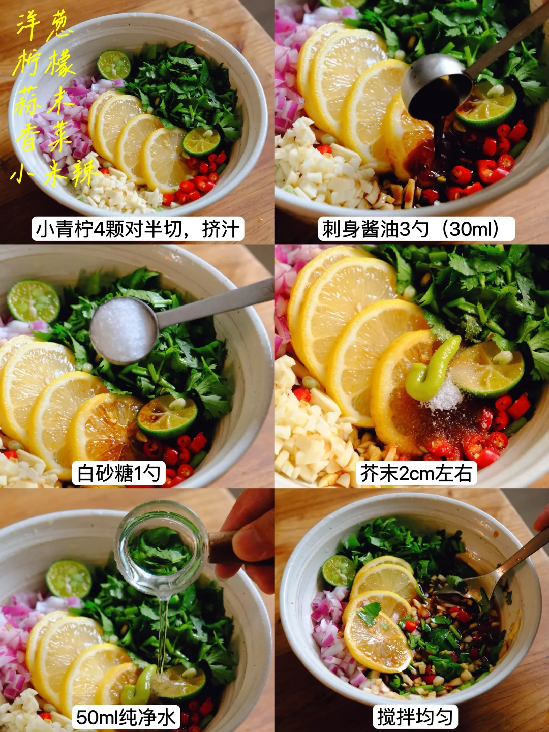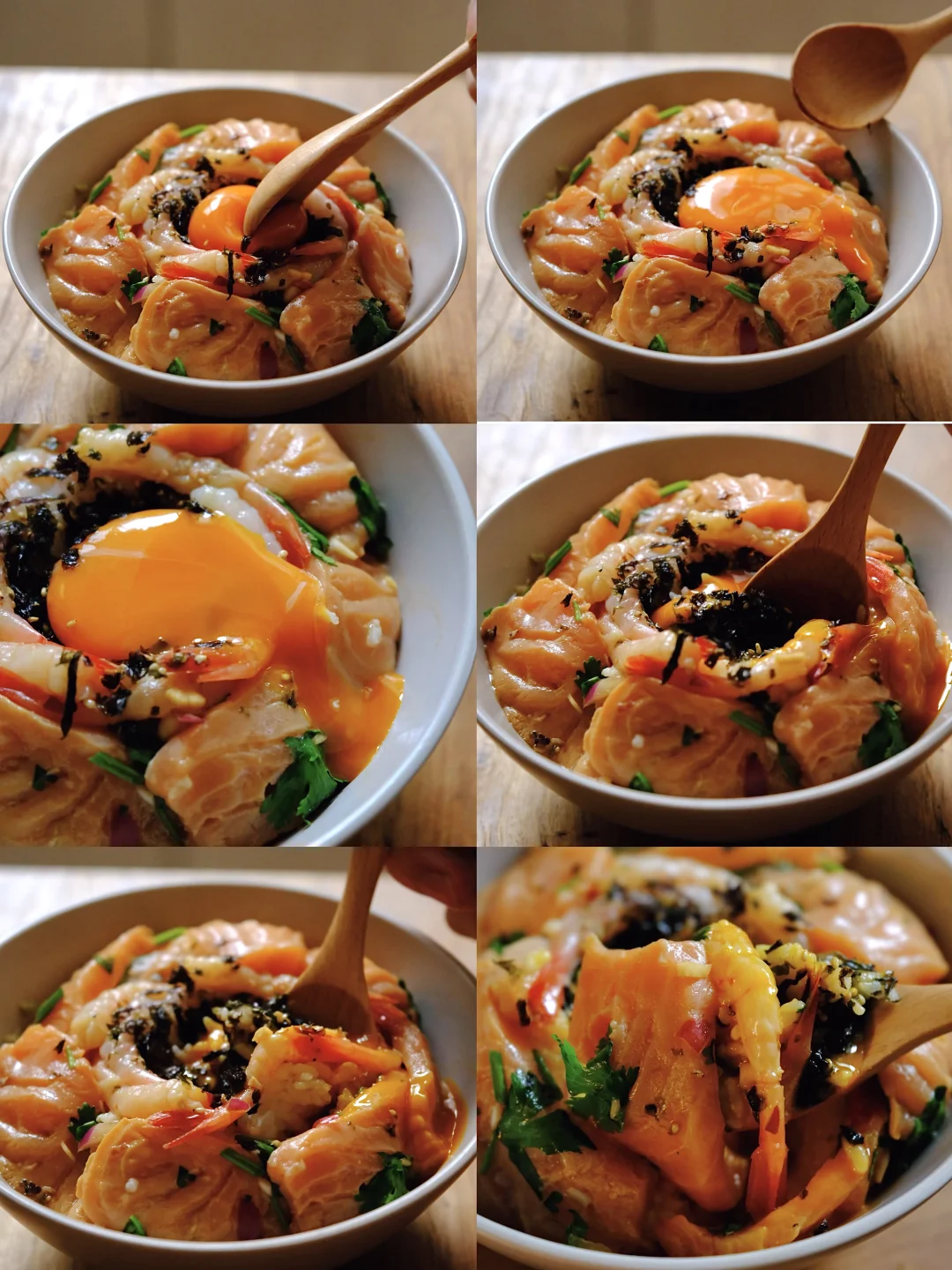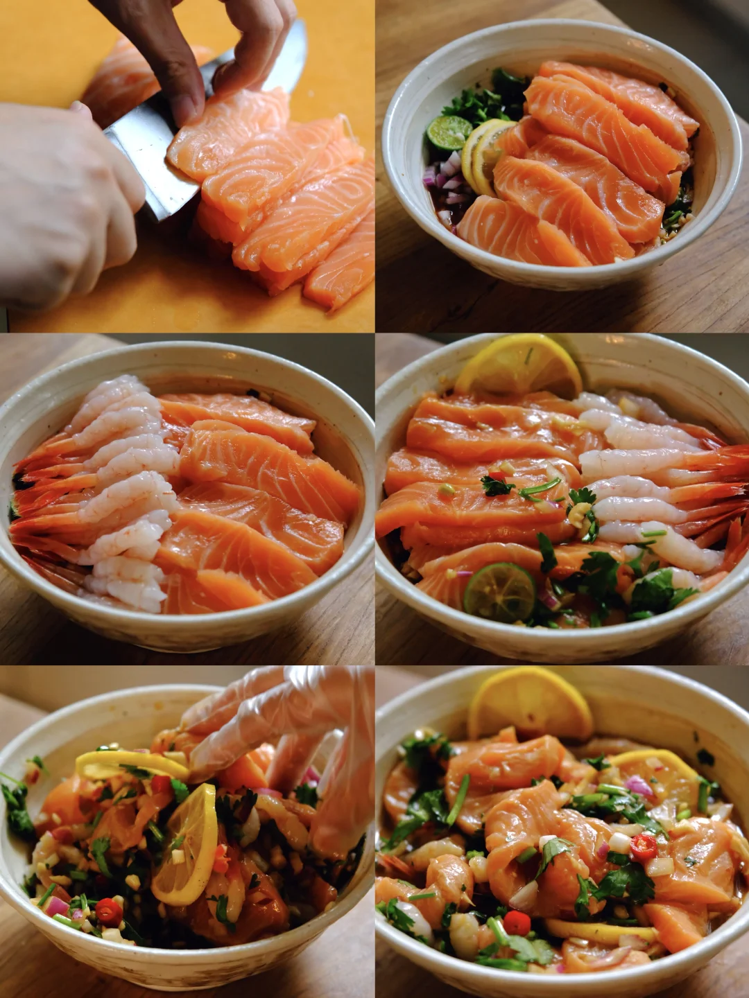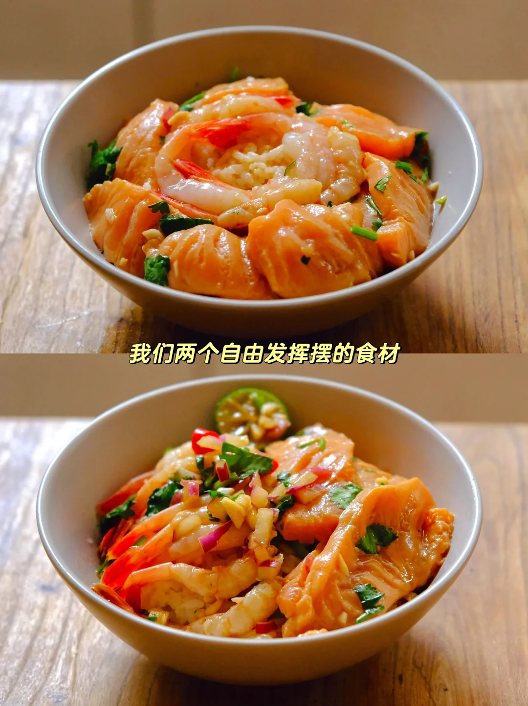 梅雨季的厨房,秒变桑拿房,还是来道不开火的生腌三文鱼甜虾拌饭吧。 做法很简单,重点就在料汁了。 (我的勺是10ml量勺) 料汁:香菜、柠檬片、蒜末、洋葱末、小米辣、小青柠;4颗小青柠挤汁、3勺刺身酱油、1勺白糖、2cm芥末、50ml纯净水。 三文鱼切片,甜虾我直接买的去好壳的,一起放入腌汁中,抓拌均匀裹上料汁,盖上保鲜膜冷藏15-20分钟即可。 后面就是简单把食材摆在米饭上,撒了点拌饭海苔碎,再来一颗可生食鸡蛋,简直太美味了!摆的造型我俩自由发挥了,能猜出哪个是我摆的吗?[偷笑R]