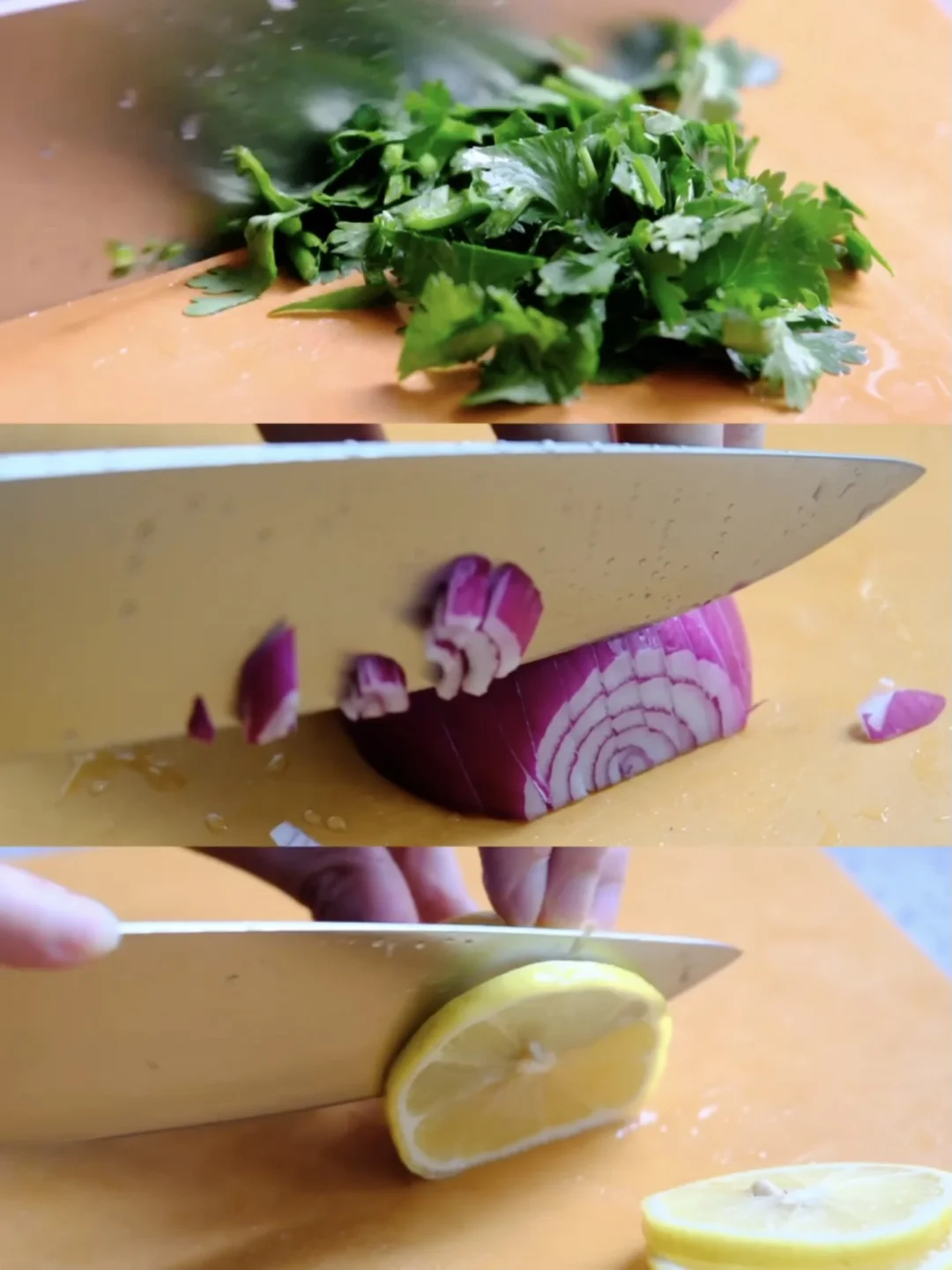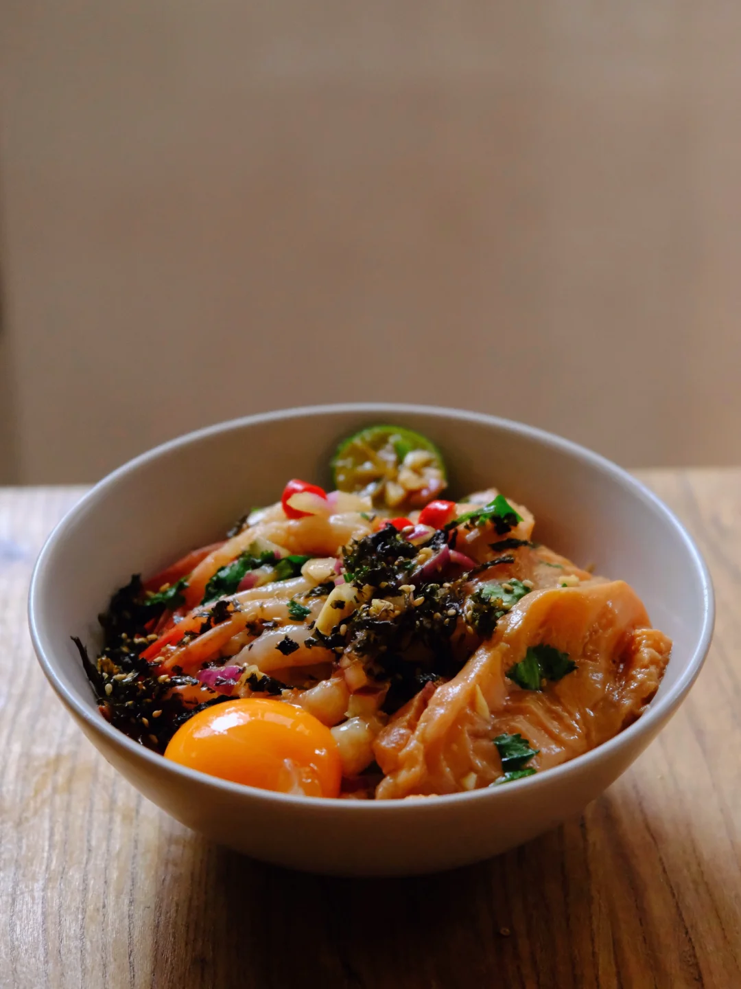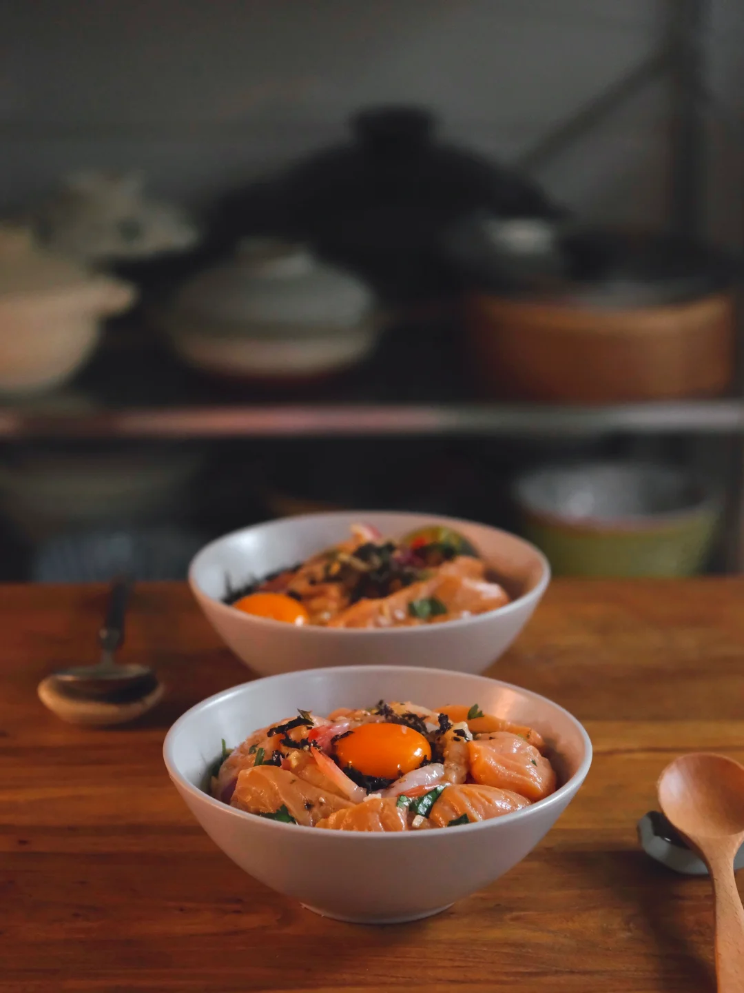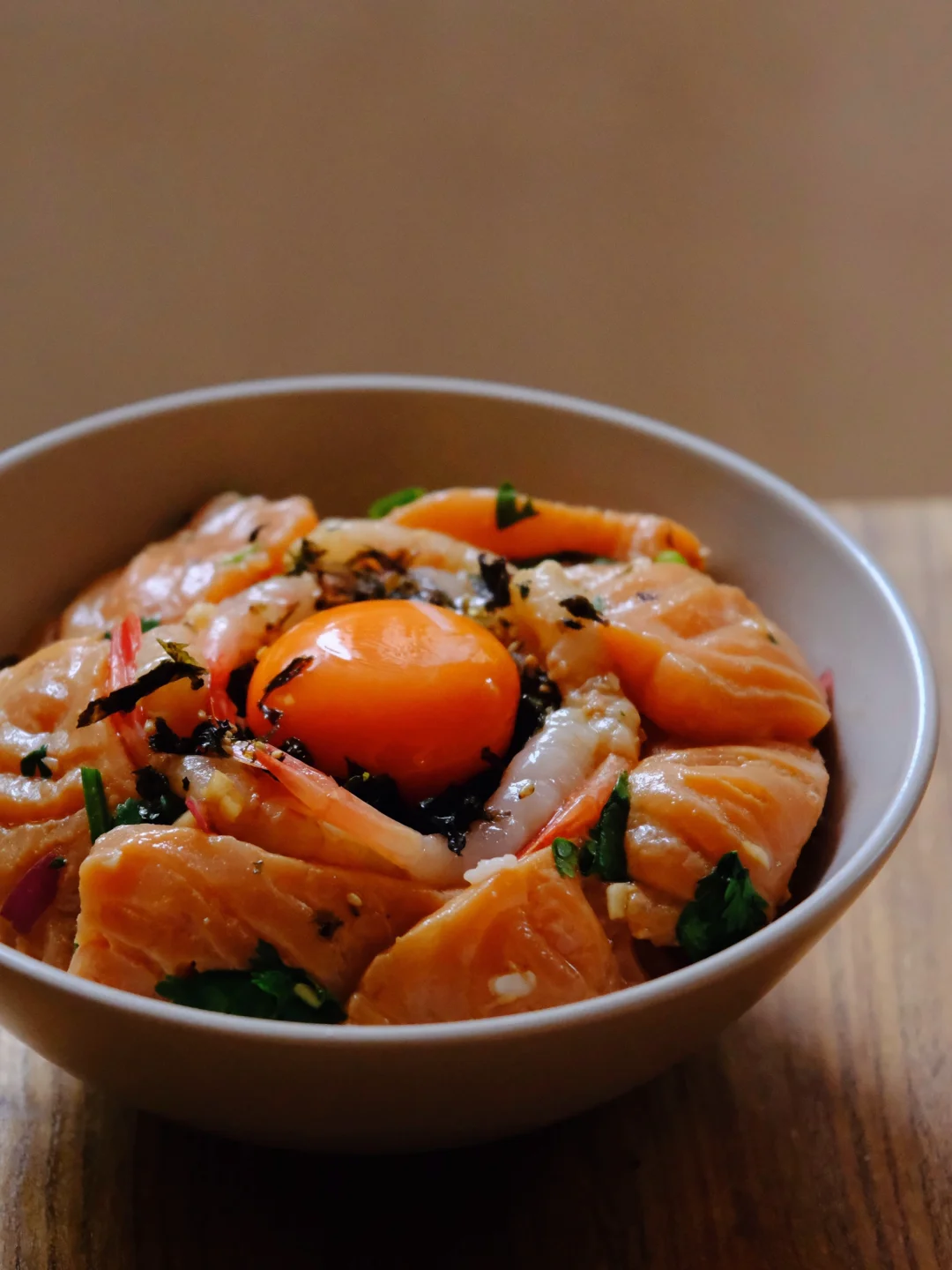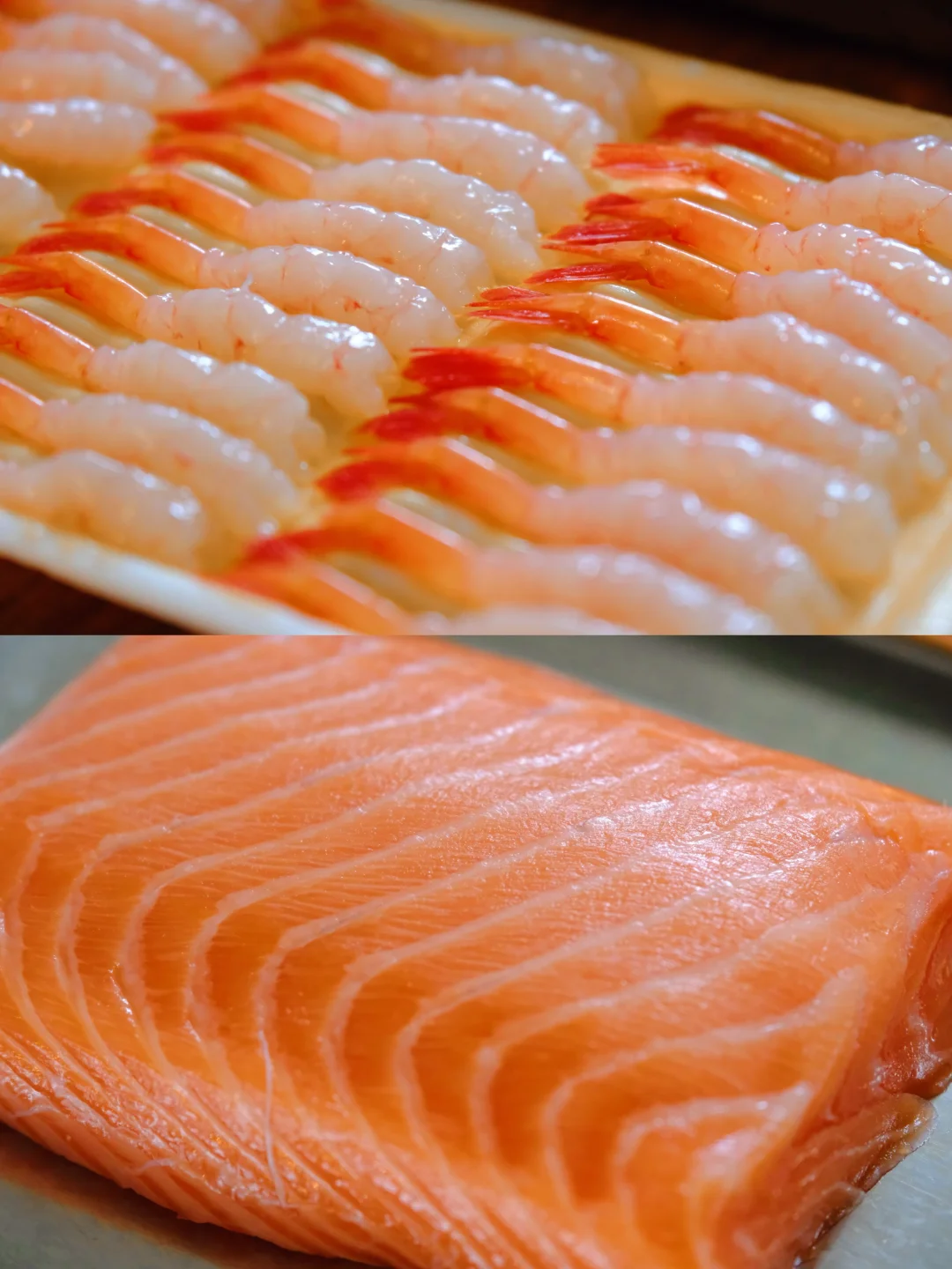梅雨季的厨房,秒变桑拿房,还是来道不开火的生腌三文鱼甜虾拌饭吧。 做法很简单,重点就在料汁了。 (我的勺是10ml量勺) 料汁:香菜、柠檬片、蒜末、洋葱末、小米辣、小青柠;4颗小青柠挤汁、3勺刺身酱油、1勺白糖、2cm芥末、50ml纯净水。 三文鱼切片,甜虾我直接买的去好壳的,一起放入腌汁中,抓拌均匀裹上料汁,盖上保鲜膜冷藏15-20分钟即可。 后面就是简单把食材摆在米饭上,撒了点拌饭海苔碎,再来一颗可生食鸡蛋,简直太美味了!摆的造型我俩自由发挥了,能猜出哪个是我摆的吗?[偷笑R]