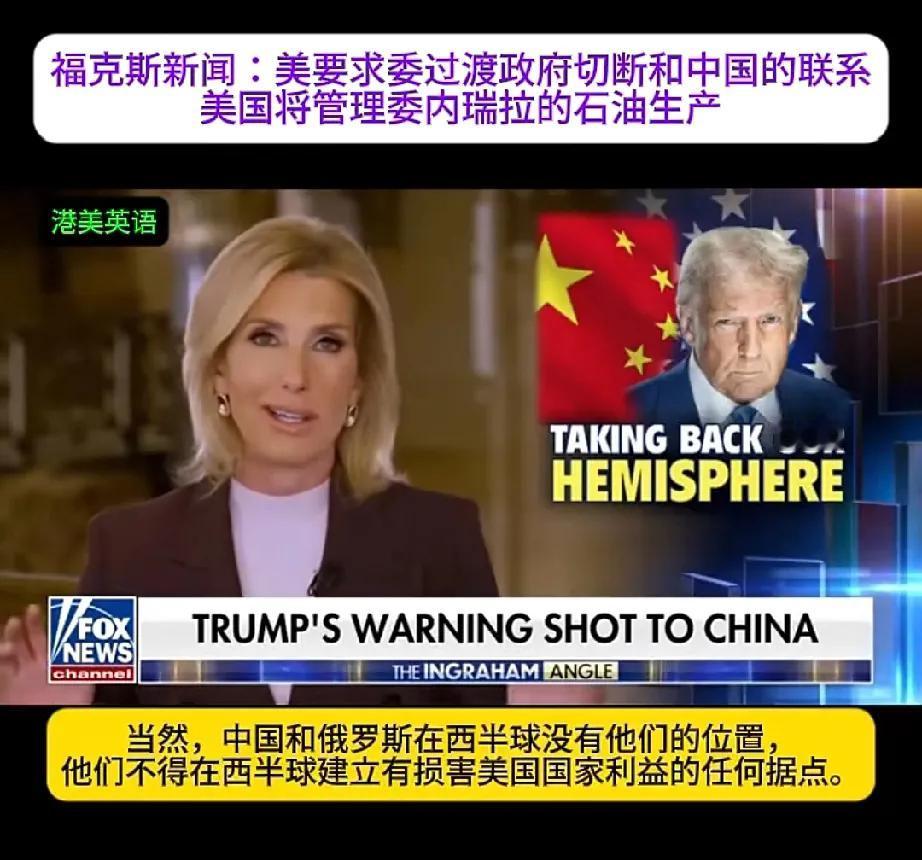 幸灾乐祸! 1月10日,美国狐狸台主持人公开宣称: -中国将再也不是委内瑞拉最大的石油买家了。 -西半球再也没有中国和俄罗斯位置了。 -中国和俄罗斯再也不能在西半球建立他们的据点了。 ——特朗普的策略就是既然正面交锋不利,那就在外围上对中俄下手,暂时来说特朗普确实做到了。
