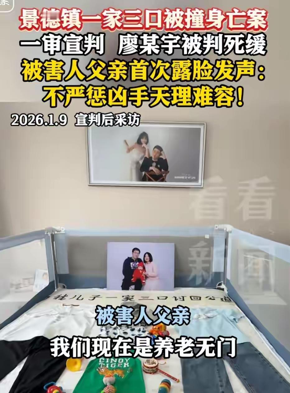 景德镇灭门案,廖某宇他爹现在估计肠子都悔青了!他后悔的不是儿子撞死三个人,而是自己在法庭上那一冲,亲手把儿子的活路给堵死了。 1月9日,景德镇中院的判决是死缓。说白了,就是给了凶手廖某宇一块免死金牌,只要两年内安分守己,大概率就能从死刑改判无期,命是保住了。 可就在宣判后,他爹竟然当庭失控,想冲过去打被害人的律师。这一下,性质彻底变了,等于是在全国人民面前,把“我们家不仅不悔罪,还觉得判重了”这几个大字,狠狠刻在了脸上。 回顾这起惨案,根本不是什么简单的交通事故。就因为和女友吵架,廖某宇把近两吨重的特斯拉当成了发泄工具,在市区主干道上把油门踩到底,速度飙到128.9公里每小时。 这是什么概念?这是把马路当赛道,把无辜的路人当成游戏里的NPC。胡先生夫妇抱着不满周岁的孩子,就这样在斑马线上被瞬间清零,一个完整的家,灰飞烟灭。 从案发到庭审,廖某宇连一句道歉都没有,态度冷漠得让人心寒。被害人家属自始至终只有一个诉求,不要一分钱赔偿,只要凶手偿命。 这种坚决的态度,换来的却是死缓。可笑的是,这个结果,凶手家属都不满意。他父亲在法庭上的咆哮和冲撞,暴露了一个可怕的事实:在这家人眼里,三条人命,可能真的不算什么。 之前就有消息说,他爹放过狠话,称儿子撞死人是“天灾”,家属追责是“人祸”。这种颠倒黑白的逻辑,已经不是简单的护犊子了,而是一种根植于骨子里的冷血和傲慢。 法律讲究证据和程序,给了死缓或许考虑了自首等情节。但法律同样不能脱离社会最朴素的情感和正义观。凶手父亲的这一闹,恰恰提供了最生动的“证据”,证明了这一家人毫无悔改之心,对社会具有极大的潜在威胁。 他这一冲动,等于亲手把检方抗诉的理由,送到了人家手里。原本可能还有一丝回旋余地的案子,现在民愤被彻底点燃。大家愤怒的,已经不仅仅是那三条逝去的生命,是这种视人命如草芥,藐视法律和人伦的嚣张态度。 这已经不是一个家庭的悲剧,而是对社会底线的一次公然挑战。如果这样的行为都不能换来最严厉的惩罚,那我们该如何教育下一代,生命是神圣不可侵犯的?