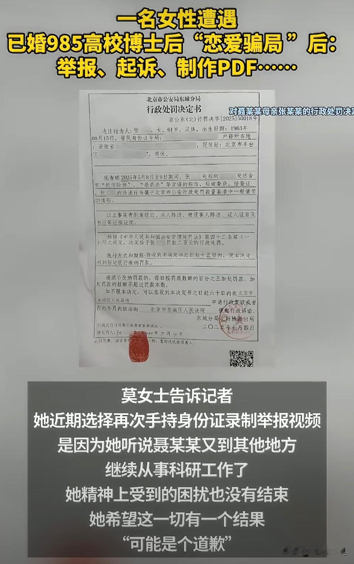实在让人无语,一个985高校的博士后,老婆怀着孕,他竟然管不住自己,在相亲平台假装单身去骗女生谈恋爱。被骗女生发现后,整个人都崩溃了,然后便进行了实名举报。 学校收到了举报,学校对男子进行记过及退站处理。可男子的母亲气不过了,居然发短信威胁人家,最后被罚了200块钱。 现在该男子可能要前往香港继续搞科研工作了,但女生却因此事患上了抑郁焦虑,只想要个道歉,或者法院一纸判决来给自己讨个说法。 妻子怀孕期间,出去乱聊,这本身就已经突破了做人的基本底线,是一个不能原谅的行为。竟然还能以结婚为幌子继续欺骗和伤害无辜的人。事后也没有悔意,挺让人愤怒。 支持姑娘拿起法律武器为自己讨回公道,让更多人看到这种欺骗行为应付出的代价。这不仅仅是为她自己,也是为了给社会上那些有类似不轨之心的人敲响警钟。