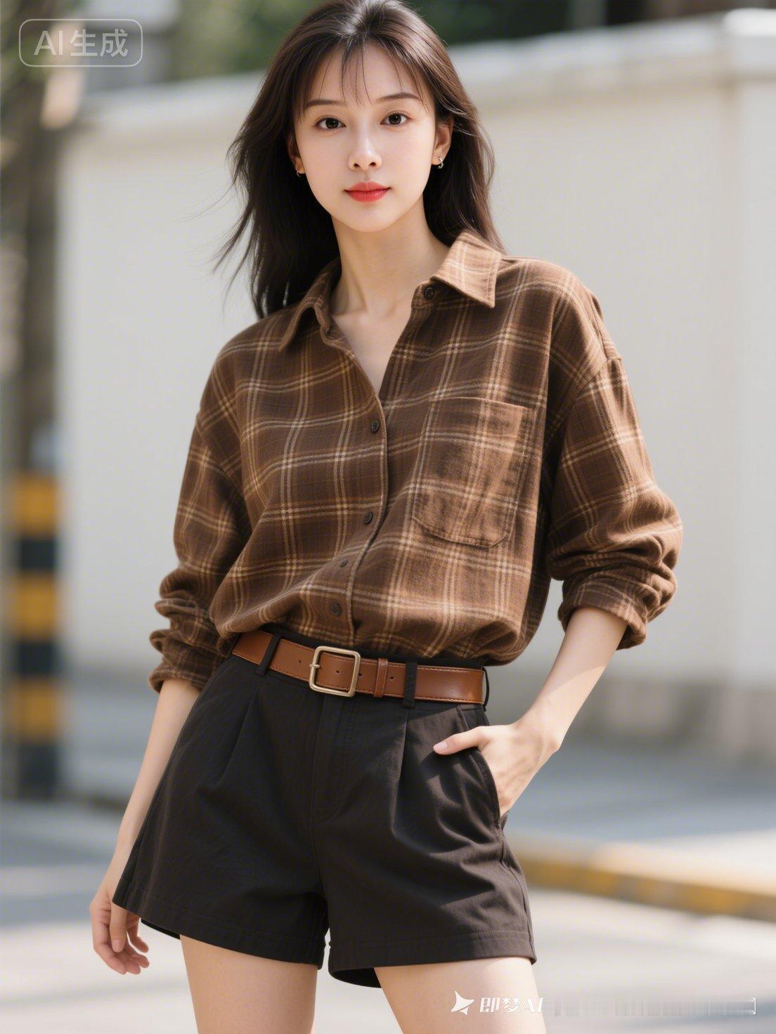 都市女孩穿搭指南:棕色格子衬衫+黑色短裤,时尚又舒适!