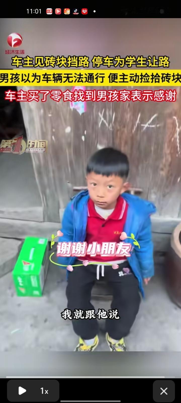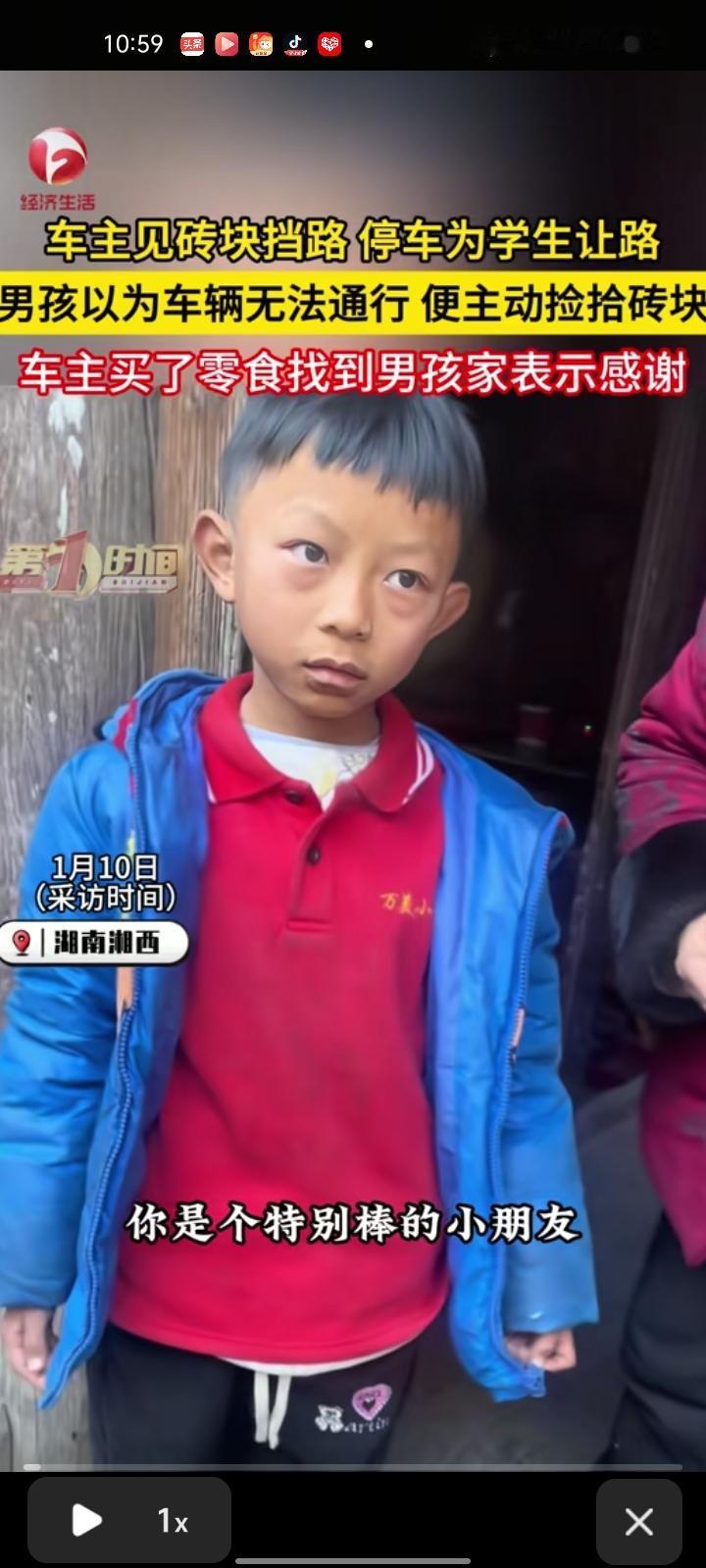近日,湘西州泸溪县。女子开车看见砖块挡路,停车为学生让路,这些路边的砖头是当地修砌花坛临时堆放的。因为是村道,路窄,所以有些砖头滑到了路中间。别的学生都过去了,而路过的小男便主动捡拾砖块,感觉这个小朋友挺有爱心。 之后,女子买一些牛奶和零食找到男孩家,对他以示感谢。