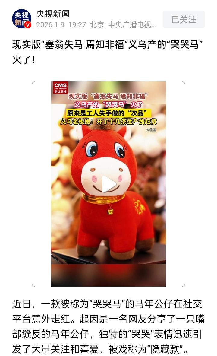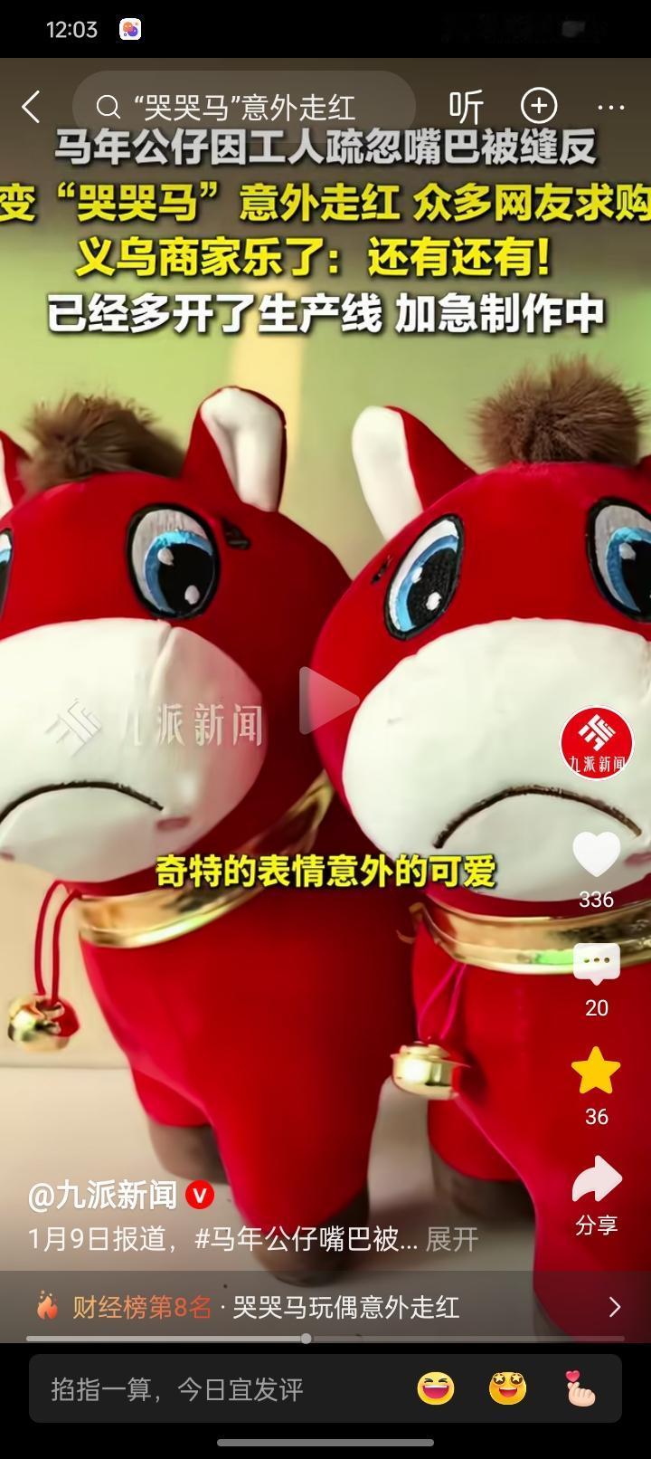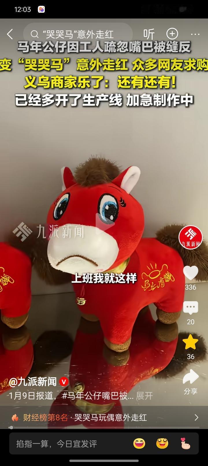 命里有时终须有,命里无时莫强求! 本来是一个“次品”的笑笑马,意外失误变成了萌萌的“哭哭马”,想不到竟然成了一个“大爆款”! 这位义乌的老板娘是怎么也想不到这波泼天的流量会有一天有降临到自己的头上啊。甚至连央视新闻也上来报道了“哭哭马”,萌萌的表情也确实可爱爆棚! 也难怪老板娘笑的那么开心,马上加大生产线生产,还特别提到了价格不会有变化! 有人说,“次品”成“爆品”,需要感谢两个人,一个是那个操作失误的员工,另外一个是那个下单购买的顾客的分享啊。大家觉得呢?