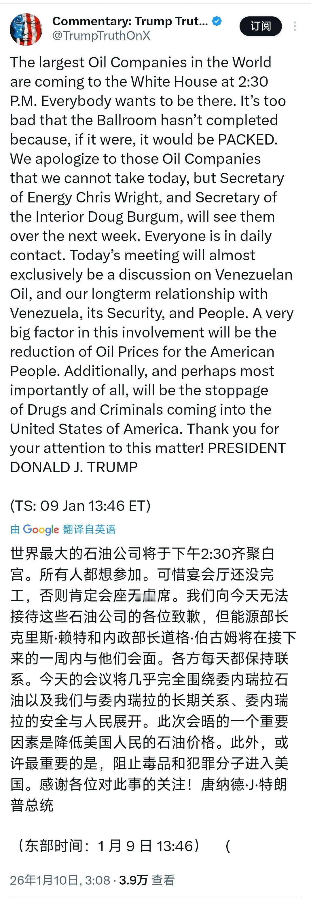 特朗普今天(北京时间1月10日)写道:“世界最大的石油公司将于下午2:30齐聚白