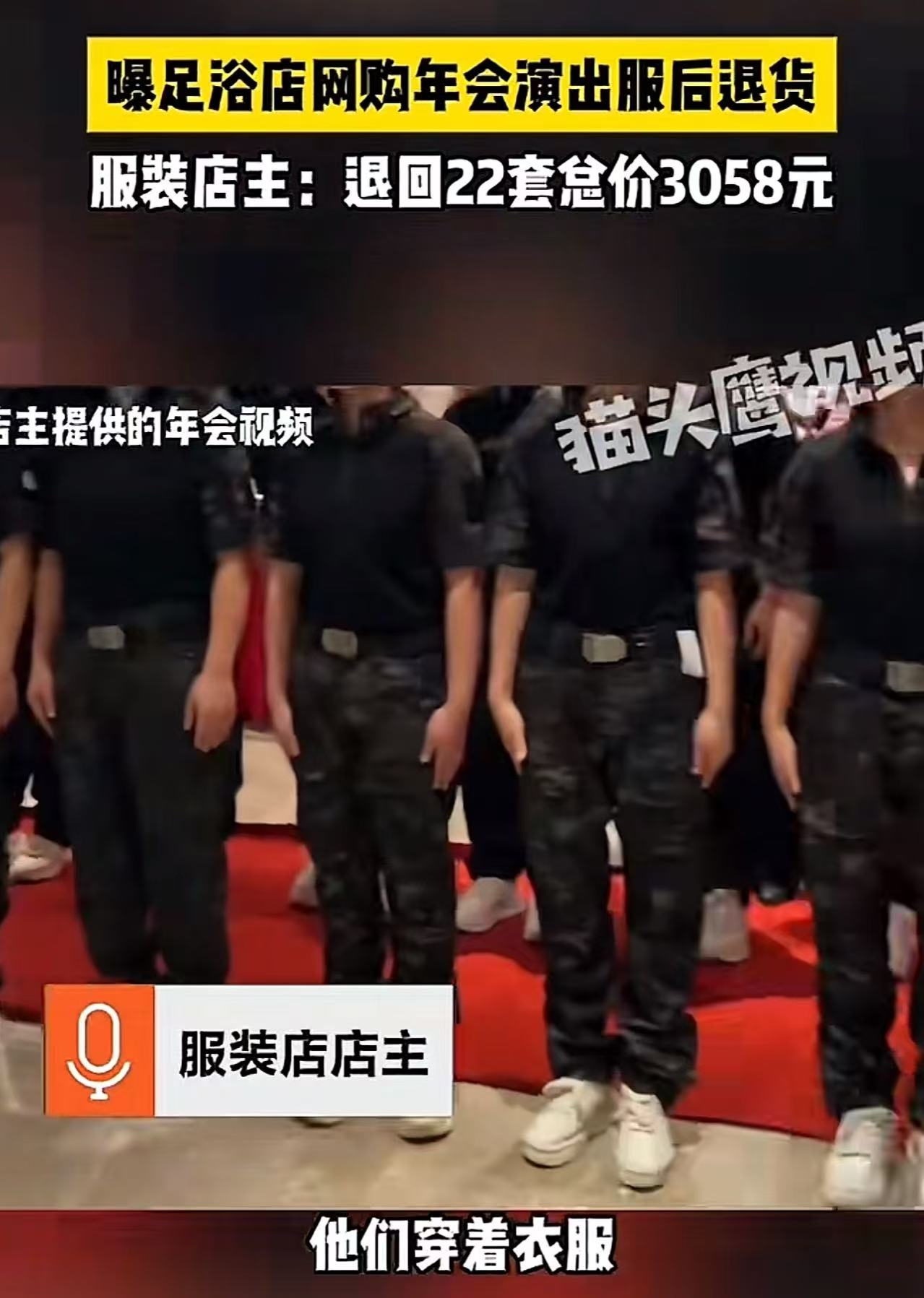 但事情就是这么巧合,12月31日下午,马先生在短视频平台上无意间刷到了这家足浴店的年会表演视频。画面中,多名登台表演的人员身上穿的,正是从他店铺购买的那批服装。