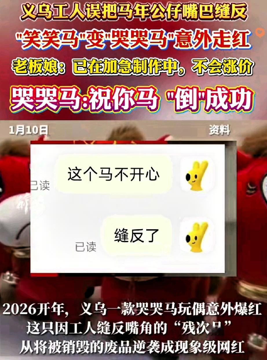 工人一个失误,竟造出年度顶流!缝反嘴巴的“哭哭马”爆火全网,工人上午被扣钱下午就加班赶工,这剧情比电视剧还魔幻。 谁能想到,本该销毁的“次品”,却凭着委屈巴巴的歪嘴表情戳中年轻人。 它不像其他玩偶强行装开心,那耷拉的嘴角,活脱脱是周一上班、加班改方案的我们,成了最好的情绪出口。 这事儿最妙的是,它证明完美早已不稀罕,真实的不完美才最打动人。 义乌商家快速转身把失误变商机,也藏着生活的小智慧:所谓意外,换个角度可能就是惊喜。 你被这只“丧萌”小马戳中了吗?会不会也想入手一只当情绪搭子?