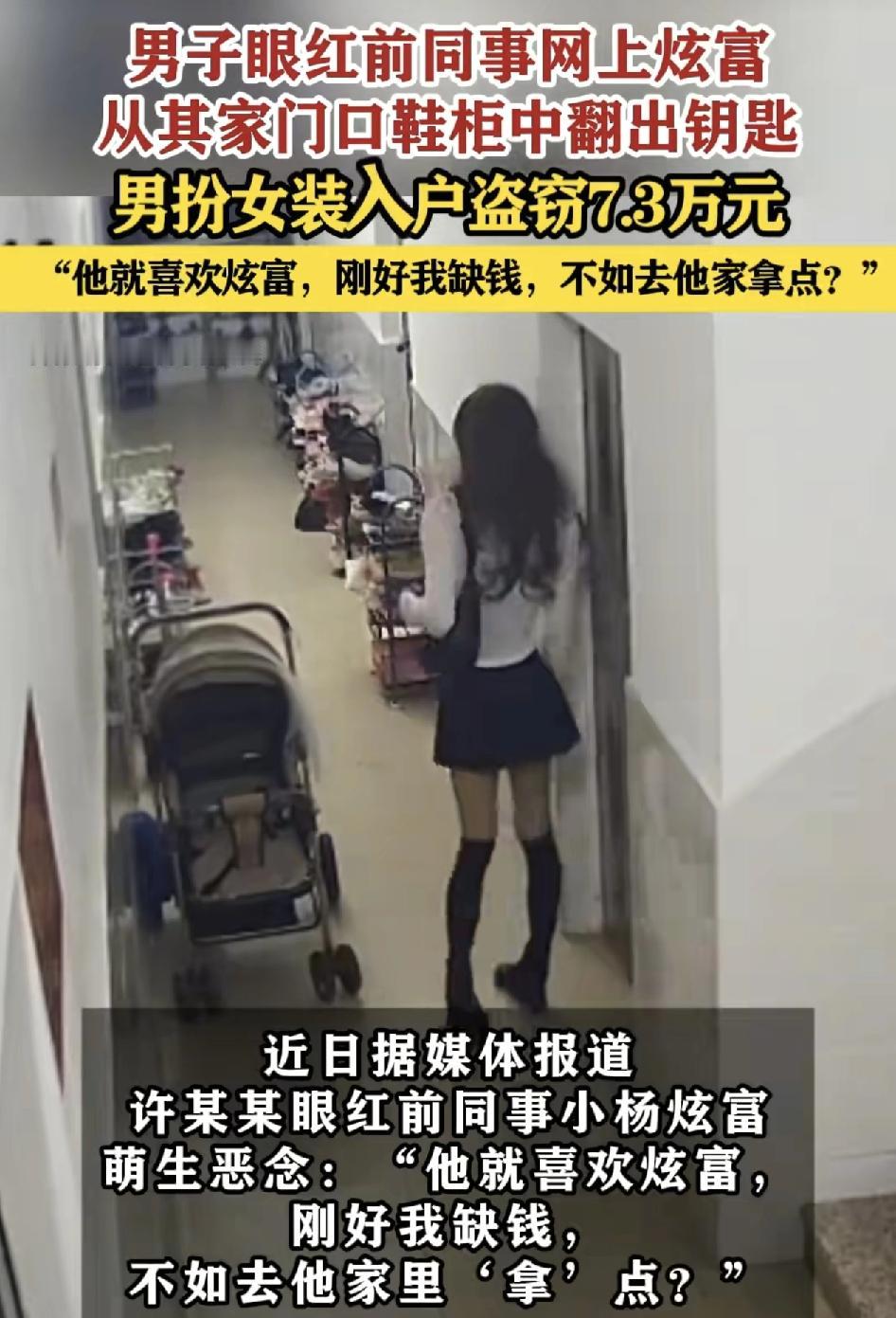 一男子眼红前同事整天在他面前炫富,想着自己近段时间也缺钱,不如就到对方家里道歉,自己网上购买了女生的短裙假发在前同事家门口的鞋柜里找到钥匙之后入室盗窃7.3万元现金,刚好前同事午睡的时候发现黑色的鞋盒里的钱不见了。幸亏是门前的监控拍下了一切。都说钱不可以外露,炫富有时候真的会给自己惹上不必要的麻烦。