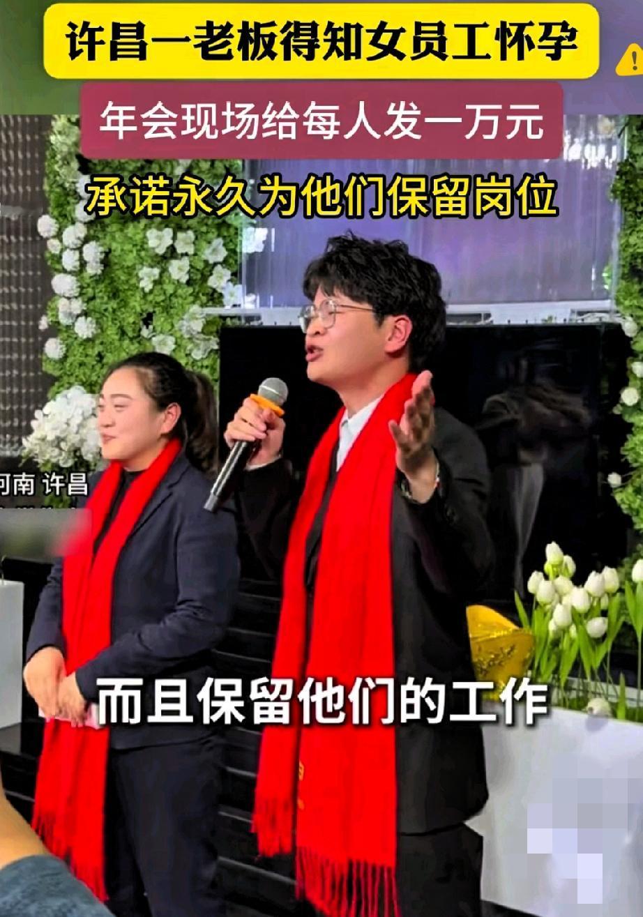 21岁金店老板的操作太圈粉! 许昌这场年会,两位怀孕员工的心跳从忐忑到狂喜,只因为老板一句暖心的奖励承诺,这样的职场温度,才是最珍贵的财富。 当两位准妈妈惴惴不安地走上台,以为要面临职场危机时,等待她们的却是生育奖励:生一个奖1万,生两个奖2万,日常还有金钞、黄金福利。 在不少职场还在隐性排斥孕期员工的当下,这位年轻老板用行动打破了偏见。 他的格局,远不止于物质奖励,更是读懂了员工的顾虑与需求。 真正的企业凝聚力,从来不是严苛的制度,而是将心比心的关怀。 这也让我们明白,年轻创业者的成功,靠的不是算计,而是真诚。 你在职场中,遇到过哪些让你倍感温暖的瞬间呢?