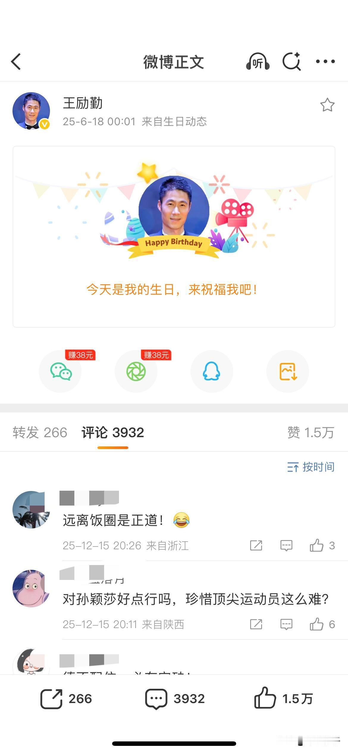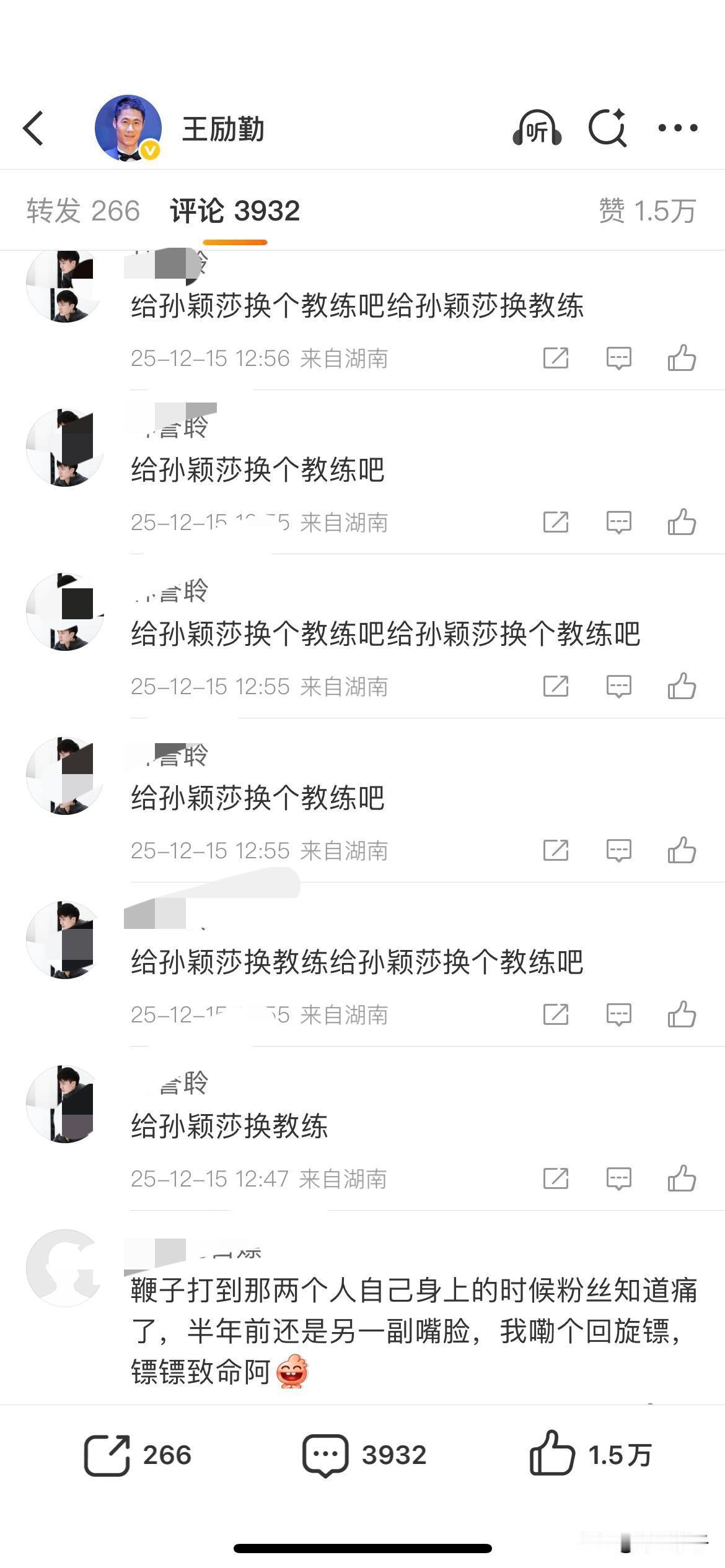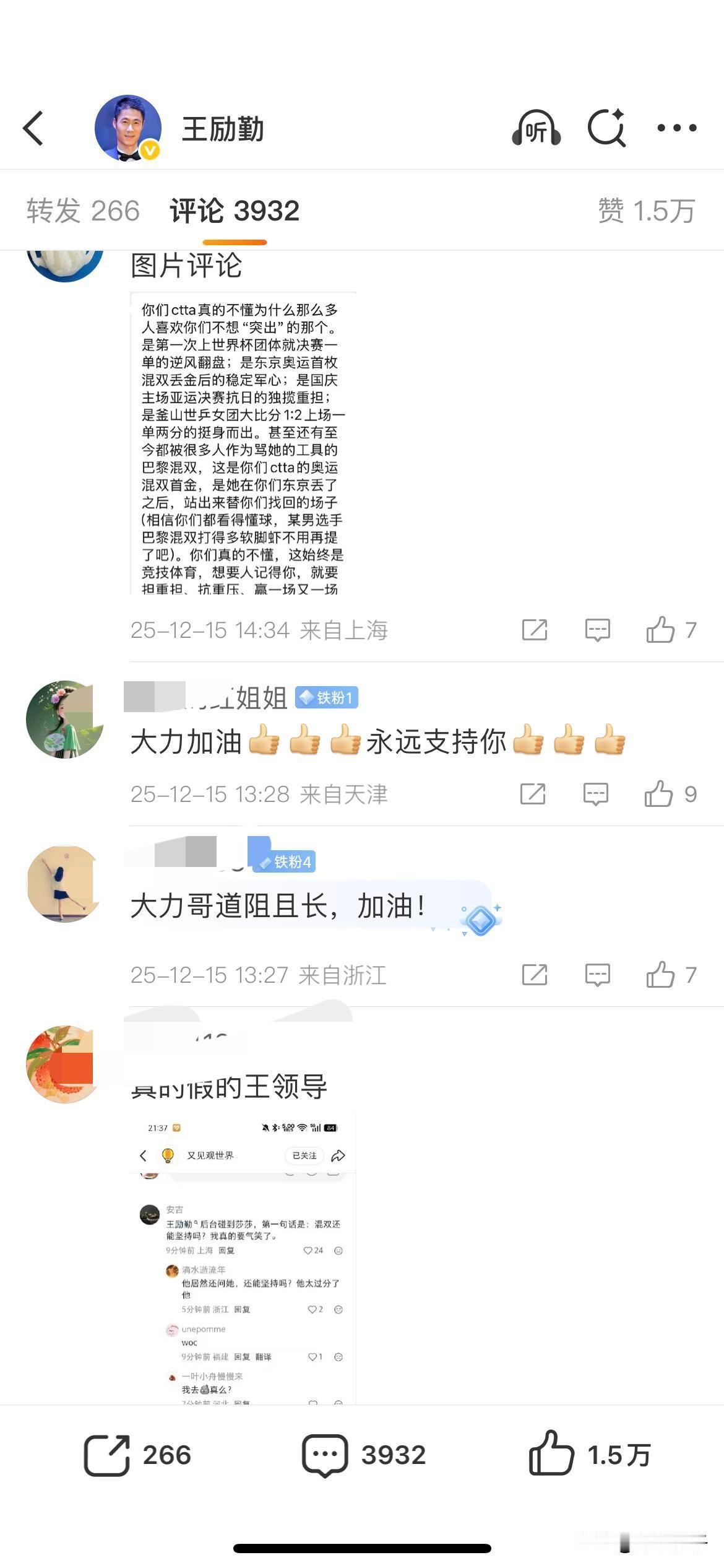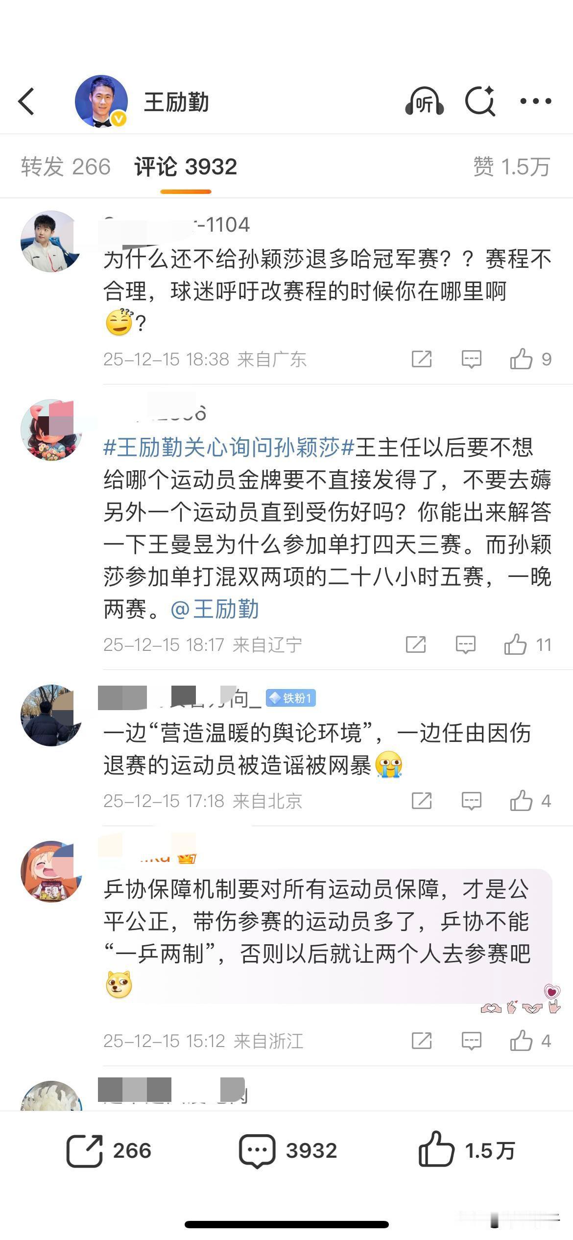 今天是刘国梁的生日,微博给我推送阅读,怀着好奇心,我点击打开了页面,虽然点赞数量不多,但是送祝福的也是还有不少的。 王励勤现今顶替了刘国梁在乒协主席的位置,我打开他的微博主页,也看了看最近的最新评论,也是2025年12月15日的了,嗯嗯,评论区留言大部分都是孙颖莎迷丝责问王励勤并要求王励勤对孙颖莎提供保障之类的。 看来,某些人的粉丝还是非常怀念刘国梁的。 刘国梁