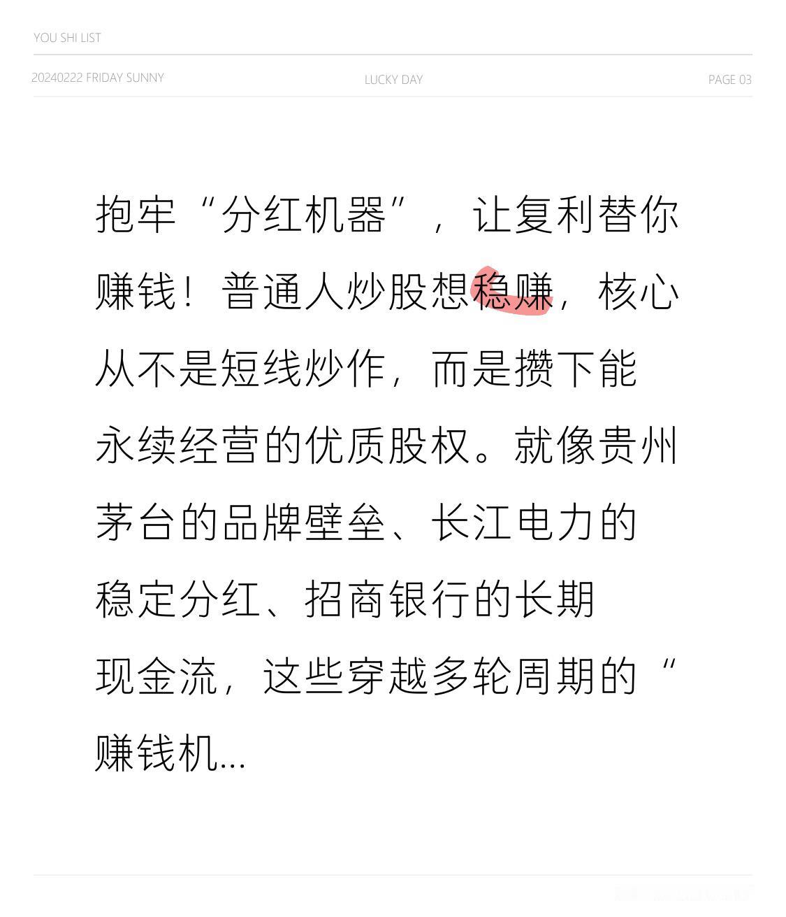 抱牢“分红机器”,让复利替你赚钱! 普通人炒股想稳赚,核心从不是短线炒作,而是攒下能永续经营的优质股权。 就像贵州茅台的品牌壁垒、长江电力的稳定分红、招商银行的长期现金流,这些穿越多轮周期的“赚钱机器”,才是投资之根。 正复利从不是空想:企业盈利增长打底,分红复投滚雪球,再借股市周期高低轮动加仓。摒弃频繁交易,守住股权思维、周期思维与复利思维三大基石,赚企业长期现金流的钱,才能真正实现财富的稳稳增长!