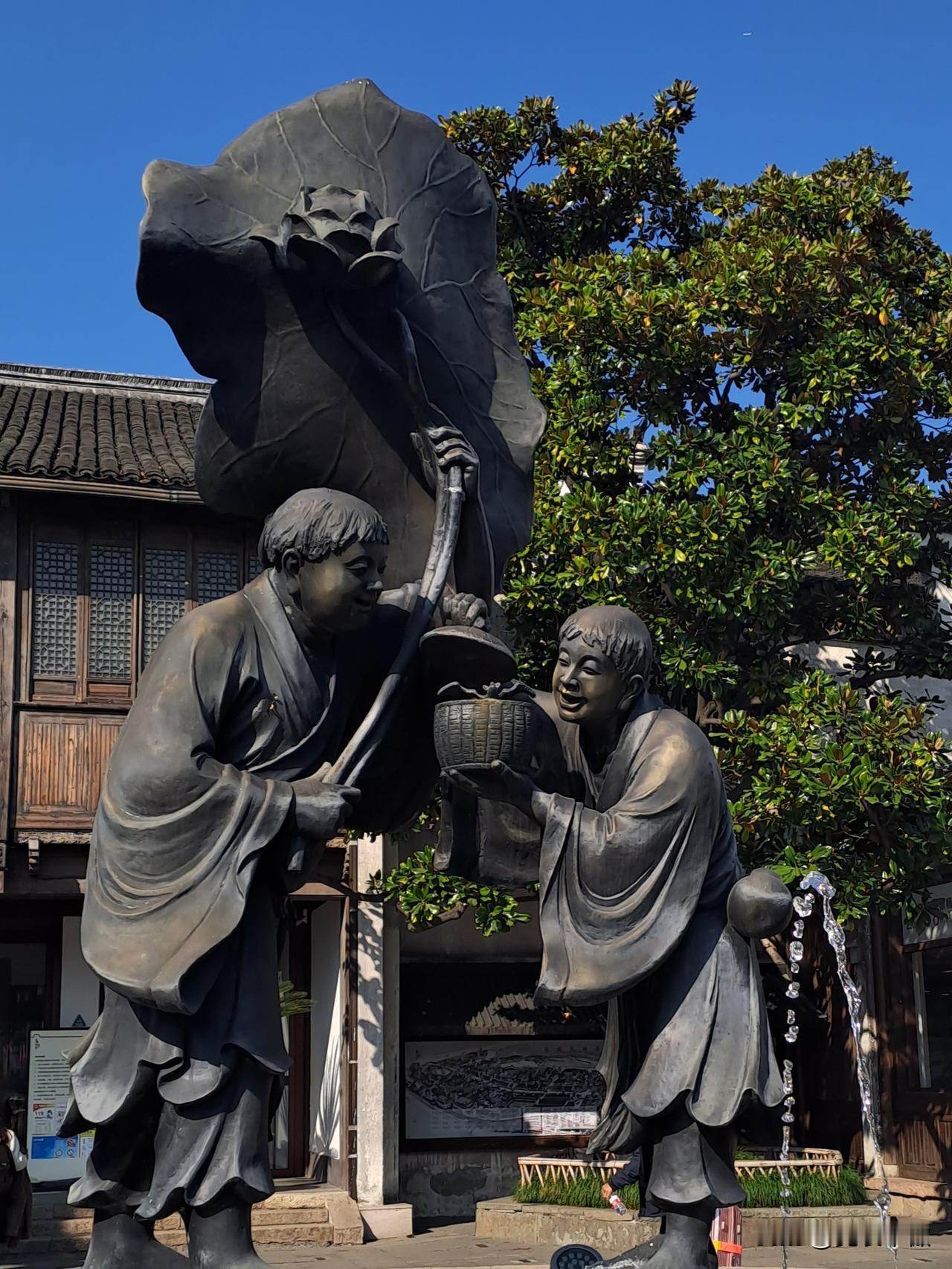 和合二仙记 在乌镇车站前的广场遇见他们的。两个石雕的人儿,挨着肩膀,站在假山石上,喷泉喷在他们身上,像披着粼粼水光。他们笑得那样开心,眉眼弯成了月,嘴角的弧度像是被几百年的好日子酿出来的。左边的举着一支荷叶,像打着伞遮雨;右边的捧着个食盒,盒盖儿微微掀着,让人猜里头是不是还温着旧时的茶点。水绿绿的,从他们脚下流过,影子就在涟漪里一荡一荡的,像两滴化开的墨,要融进这水乡的底色里去。 这便是和合二仙了。此刻他们不再是庙堂里正襟危坐的神祇,倒成了两位悠然的“老住客”。那荷叶与食盒,也褪去了符号的严肃,成了他们在这幅水墨长卷里最自然的点缀。一对年轻的情侣携手走过,女的忽地瞥见了,轻扯伴侣的衣袖,朝雕像努努嘴。两人相视一笑,那笑里有种不言而喻的甜,仿佛从石像那儿借来了一点光和暖,镀在自己的未来上。原来这“和合”,不必是庄严的祈愿,它就在恋人交握的指间,在寻常的一瞥里。 跟着人群慢慢走,回头看,他们还在那儿,身后的粉墙斑斑驳驳,是岁月写的信;头顶的蓝天被桥洞裁成一弯明净的弧。水声、橹声、隐约的吴语,丝丝缕缕地缠过来,空气里浮动着草木与旧木的温润气息。这气息是有重量的,沉淀着无数个这般安详的午后。 我想,这便是江南的好了。它将最朴素的愿望——人与人之间的亲厚、相聚的欢欣——物化成这般可亲的模样,安放在寻常巷陌、流水桥头。你不必专程去朝拜,只是在漫步的途中,便能与这古老的慰藉打个照面,心便像被那流水洗过一遍,忽然就静了,也软了。神仙在此,亦不过是这人间烟火里,最温暖的一段注解罢了。