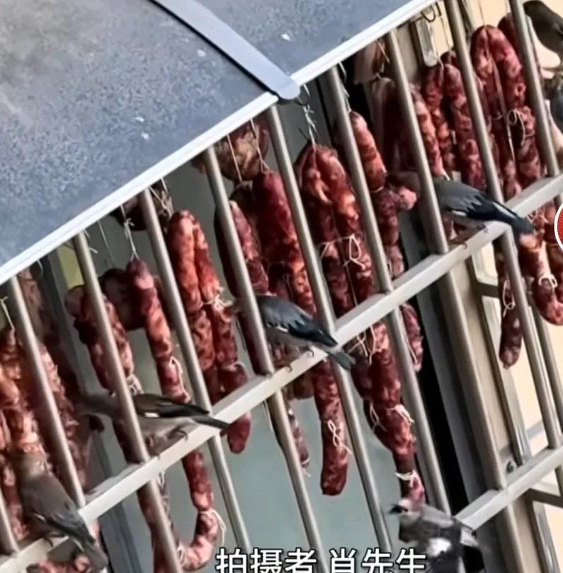小鸟集体聚餐偷吃腊肠,可能是怕被主人发现, 一只鸟放哨很认真的观察四周, 或者说他们吃了半个多小时,户主还不知道腊肠已经被偷吃很久了。 网友说, 防了猫也防了狗, 防了小偷下黑手, 小鸟一看没人在, 叫了一群好朋友, 我放哨来你来揪, 飞着来的飞着走。 这些小鸟只偷吃肥肉, 瘦肉扯不动。