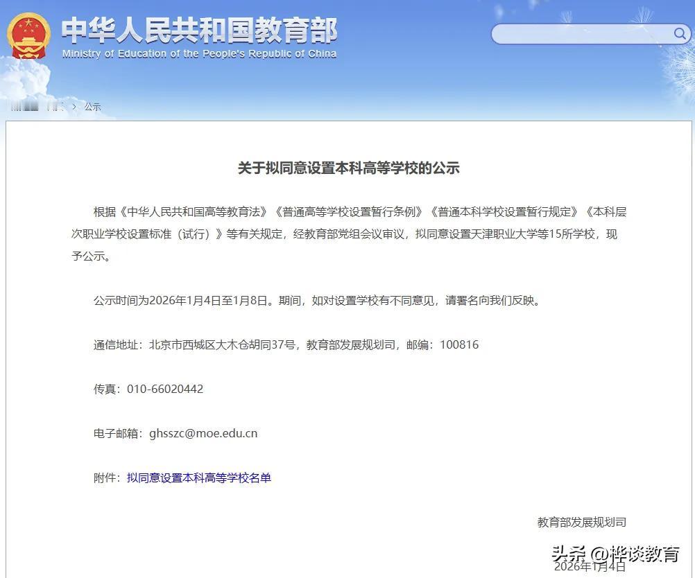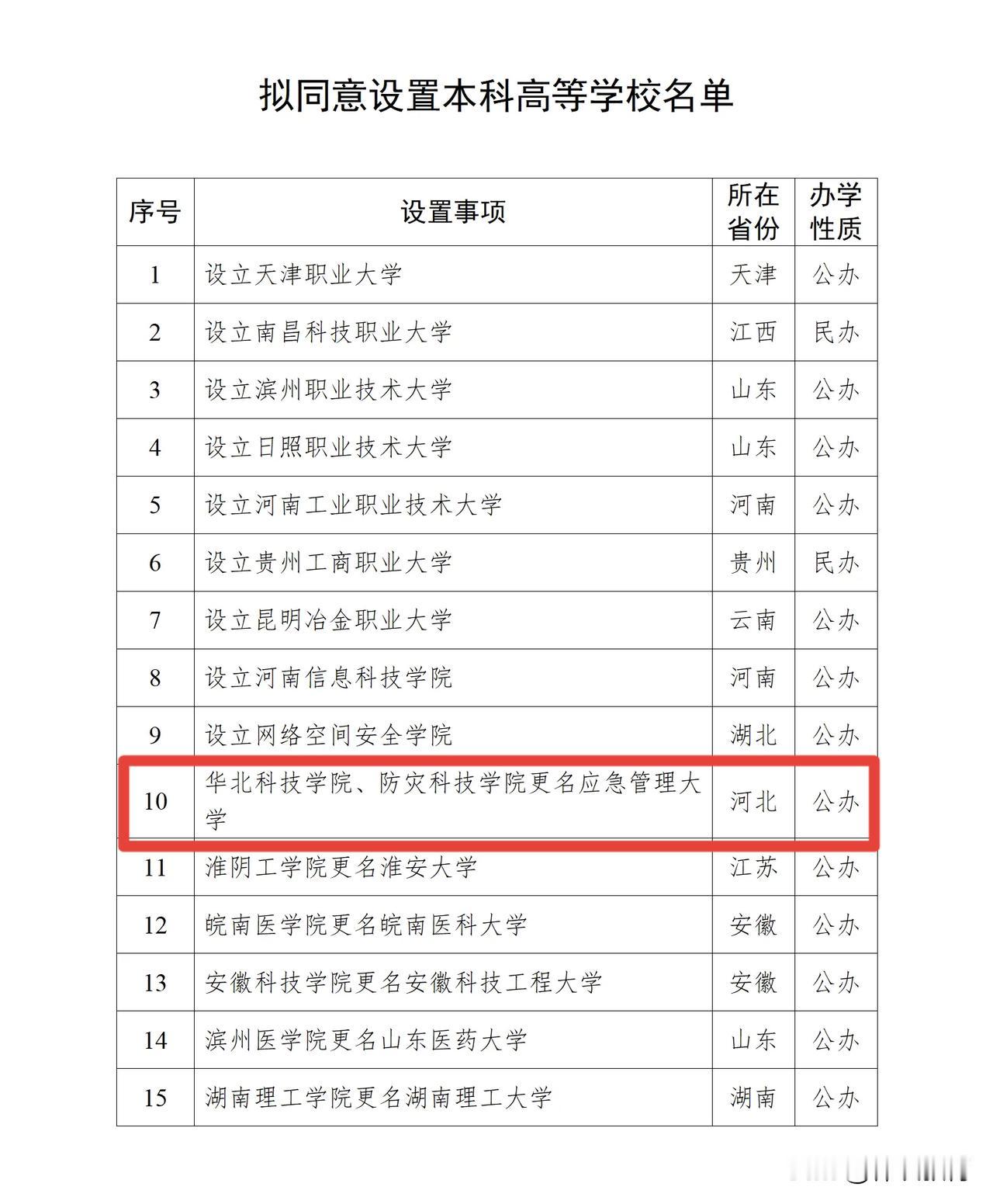 2026考生关注:“应急管理大学”真的来了![庆祝][庆祝] 1月4日,教育部发布《关于拟同意设置本科高等学校的公示》。拟同意华北科技学院、防灾科技学院更名为应急管理大学、设置天津职业大学等15所学校,现予公示。[给力][赞][赞] 其实,早在2020年12月,应急管理部就致函教育部,申请合并华北科技学院、防灾科技学院组建应急管理大学。 2021年1月,教育部复函应急管理部,同意合并华北科技学院、防灾科技学院,筹建应急管理类大学。同年5月,华北科技学院、防灾科技学院界墙拆除,实现校园一体。 从2020年到2026年,经过几年的筹建,“应急管理大学”终于来了!如果2026年考生要报考这所学校,多数省份录取分数可能都会有所上涨![庆祝][庆祝] 首先,2所学校地理位置优越,学校位于河北省廊坊市三河市燕郊高新区,2校只一墙之隔,而与北京只有一河之隔,毗邻北京副中心。 原“防灾科技学院”是由中国地震局主管,前身是1975年在甘肃天水创办的国家地震局天水地震学校;学校立足防灾减灾行业,已为地震系统和社会培养了近5万名毕业生,全国地震系统70%的地震监测一线人员,80%的地震台(站)长都毕业于此校,学校也因此被誉为是“地震系统的黄埔军校”。地球物理学、勘查技术与工程是学校的王牌专业。 原“华北科技学院”是应急管理部直属高校,前身是1950年创建的中央燃料工业部干部学校;学校把服务支撑大国应急管理事业作为第一面向,坚持立足应急管理、面向公共安全、服务经济社会,着力打造服务应急管理事业需要的人才培养高地,安全工程、采矿工程、自动化等都是学校的王牌专业。