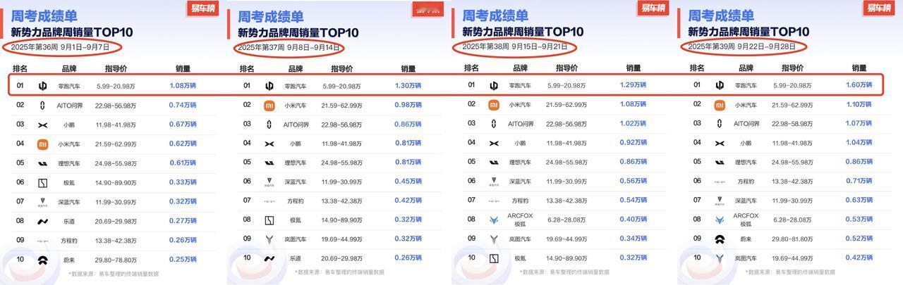 月销首次破6万,中国新势力新篇章要来了? 今天,又到了各大厂相继公布9月份销量成绩的日子,当然,最有看点的还是新势力,比如零跑再次强势拿下第一,达成了月销7连冠,并且它的月销量首次破6万,达66657台,1-9月累计交付395516台,刷新了国内造车新势力月销纪录。而且在上周,零跑同样以理想两倍的交付量,也就是1.6万台新车创下了周销9连冠。 在9月底,零跑其实还达成了一项记录,那就是它实现了百万台整车的下线,成为造车新势力唯二达成该成绩的品牌,另一个品牌就是理想。不过,从50万台至100万台的下线所用的时间来看,零跑比理想快得多,用时仅343天,而理想则用时一年多的时间。 零跑的销量能够持续增长,离不开旗下多个爆款车型的支持,比如C11,它就是零跑销量的中流砥柱,上市至今交付量超28万台。今年新推出的B10也做到了上市就热销,从4月份上市至今销量超5.6万台,月均万台以上,有这么多热销车的鼎力支持,零跑能不拿下新势力第一吗? 当然了,我更看好零跑未来的表现,因为接下来还有爆款新车推出,比如在慕尼黑车展大火的Lafa5,以及即将在10月16日首秀的D19,这些车都有望成为零跑新的销量增长点,尤其是D19到来后会大幅提升零跑的品牌影响力。所以,我觉得零跑今年大概率将拿下新势力年度销冠了! 零跑月销突破6万台 零跑汽车科技普惠