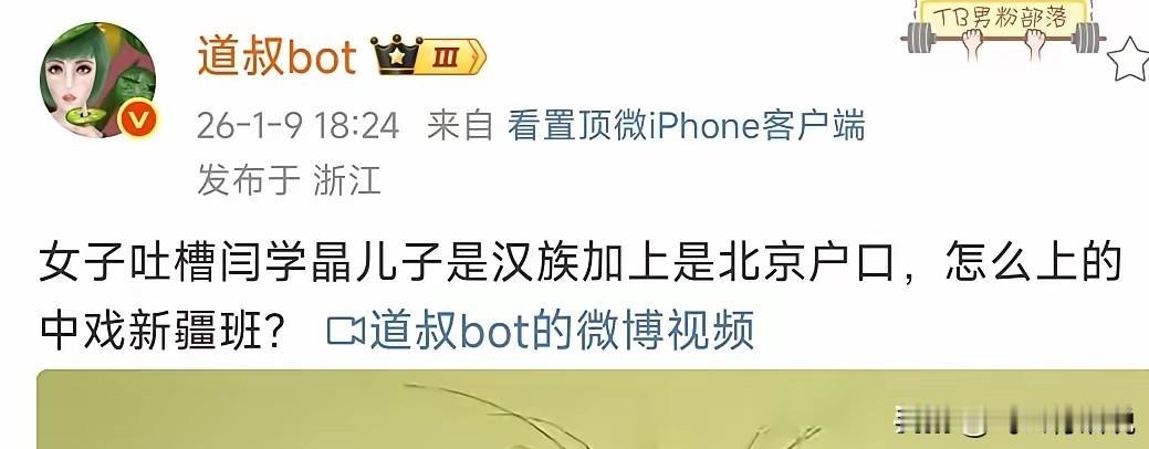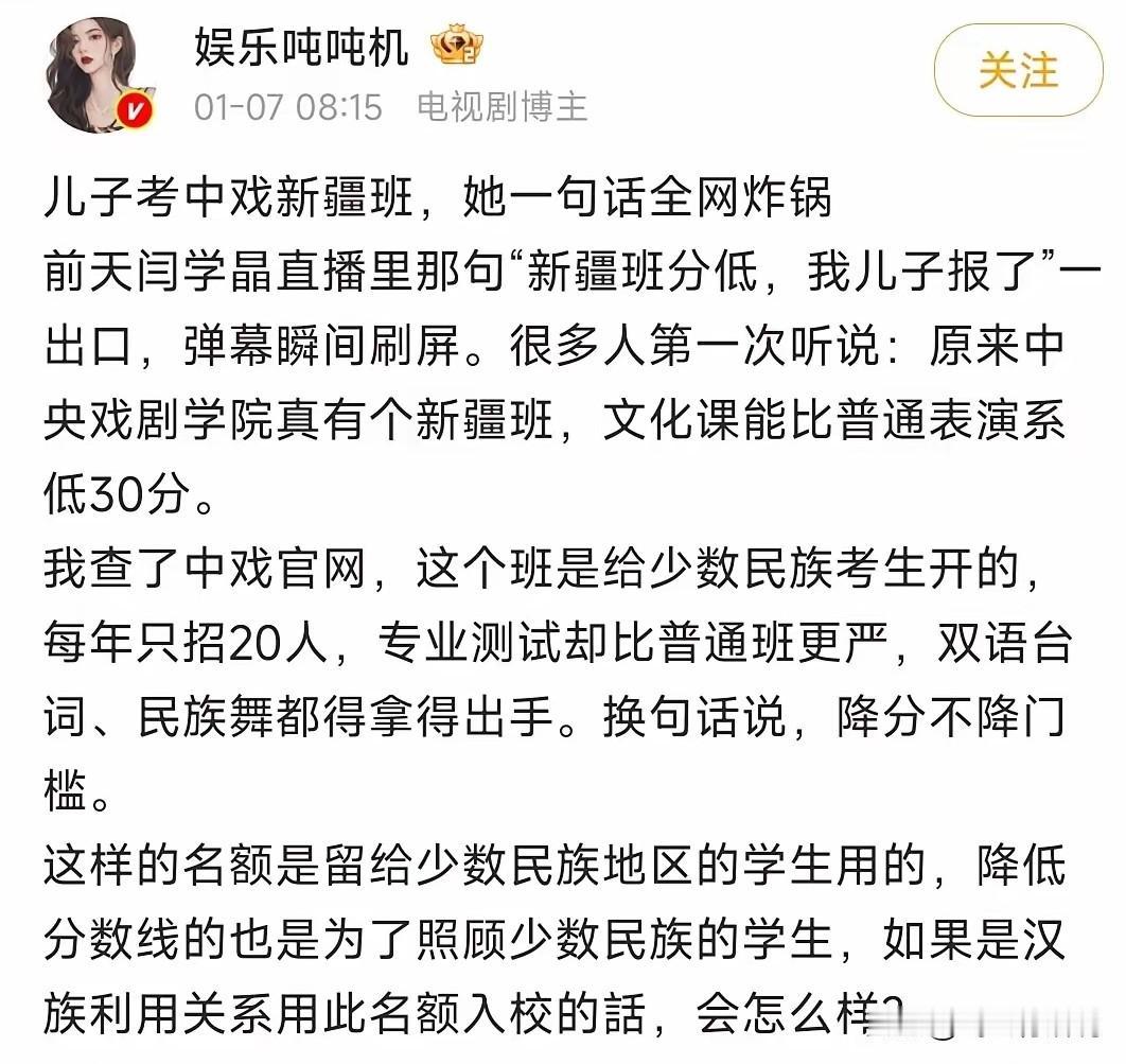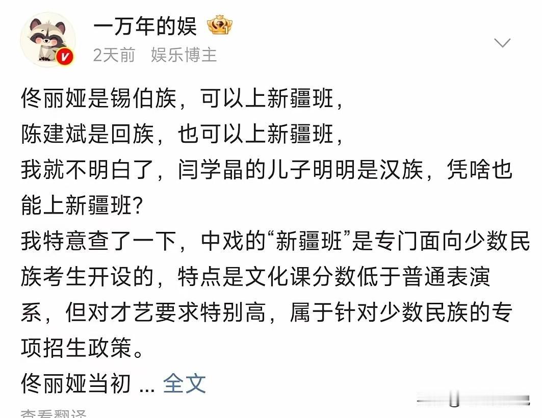 闫学晶的儿子是汉族, 而且有北京户口,是如何上的中戏新疆班 针对网友的质疑,作为知名人物,闫学晶必须要给出正式回应 经网友披露,在直播中,闫学晶无疑说出了中戏新疆班录取分比较低,就让细心的网友爆出了闫学晶的儿子是汉族,且有北京户口,但是却上了中戏新疆班 按照规定,中戏新疆班只招少数民族,对此有严格的规定 这到底是网友搞错了情况,还是事情里面有什么猫腻 闫学晶都不应该保持沉默 毕竟,这件事情应该有一个公开公正的说辞