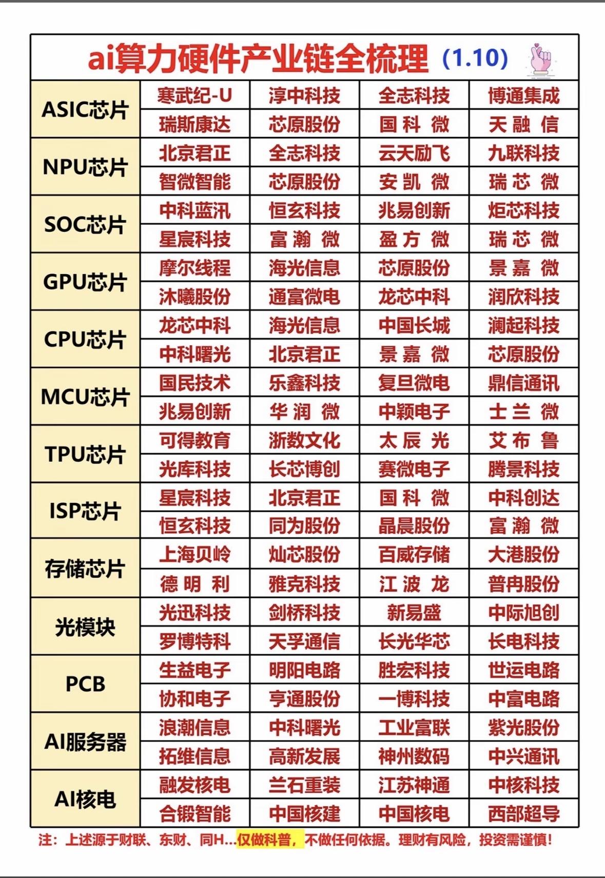 AI硬件产业链全梳理,一图看懂! AI算力硬件产业链全景:芯片、存储、光模块、服务器等核心环节企业梳理,投资需理性。 AI算力硬件产业链全景:涵盖芯片设计、制造、服务器及核电应用,涉及多家科技企业。投资需谨慎。