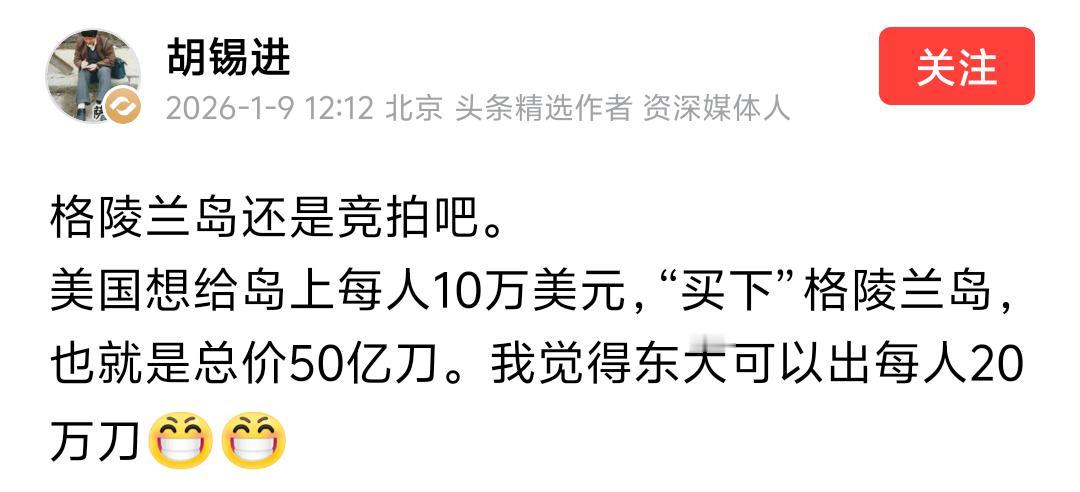 胡锡进提出一个解决格陵兰岛问题的新思路:竞拍!初听觉得极不可思议,毕竟美国对格陵兰岛虎视眈眈,何能让别国从中得利?细细一想,不免大为叹服:咱们还有6000多亿美债,哪怕甩出二分之一,也可以说是诚意满满吧?其中一半给美国,四分之一给丹麦,四分之一给格陵兰人,岂不皆大欢喜?