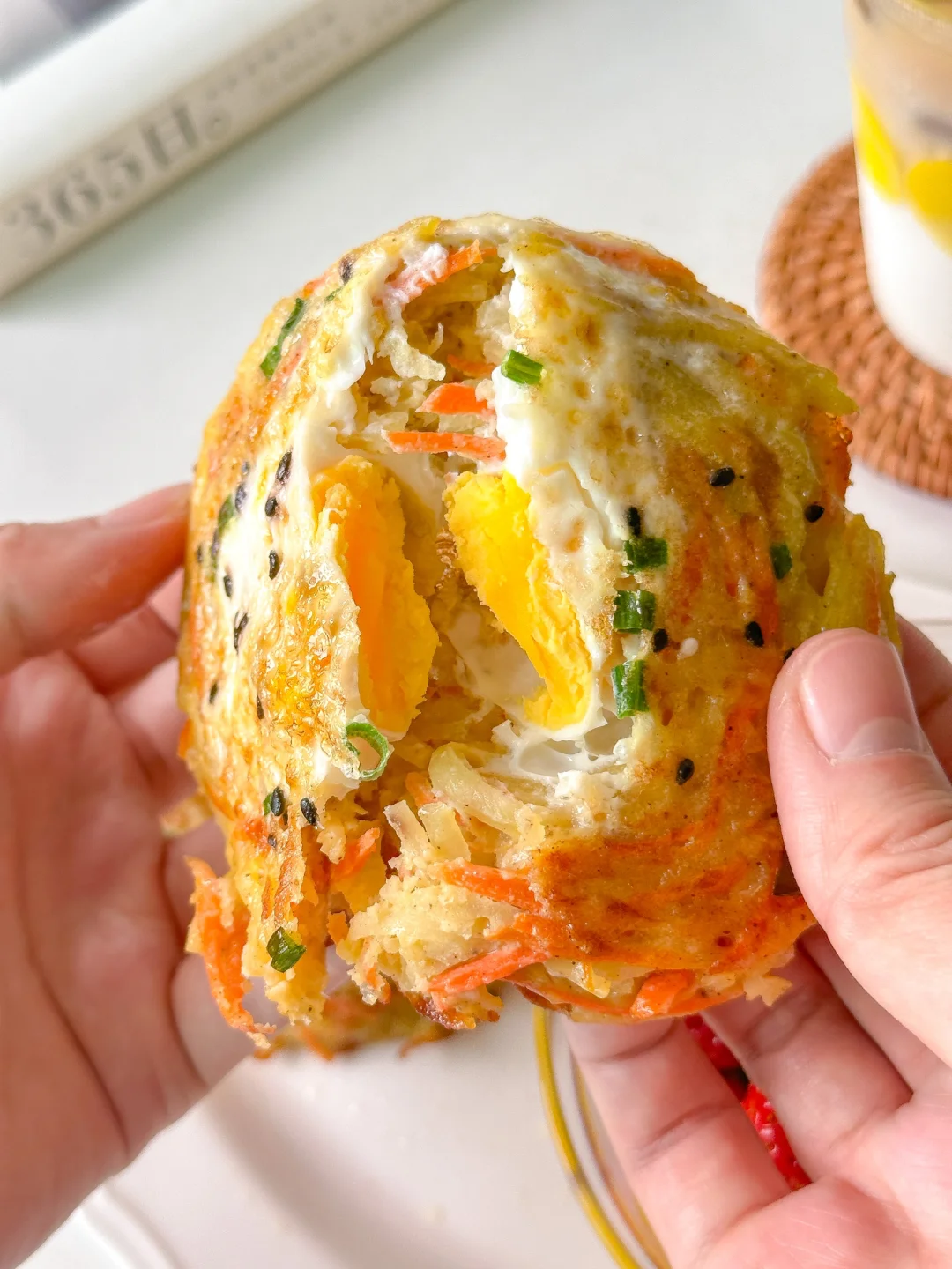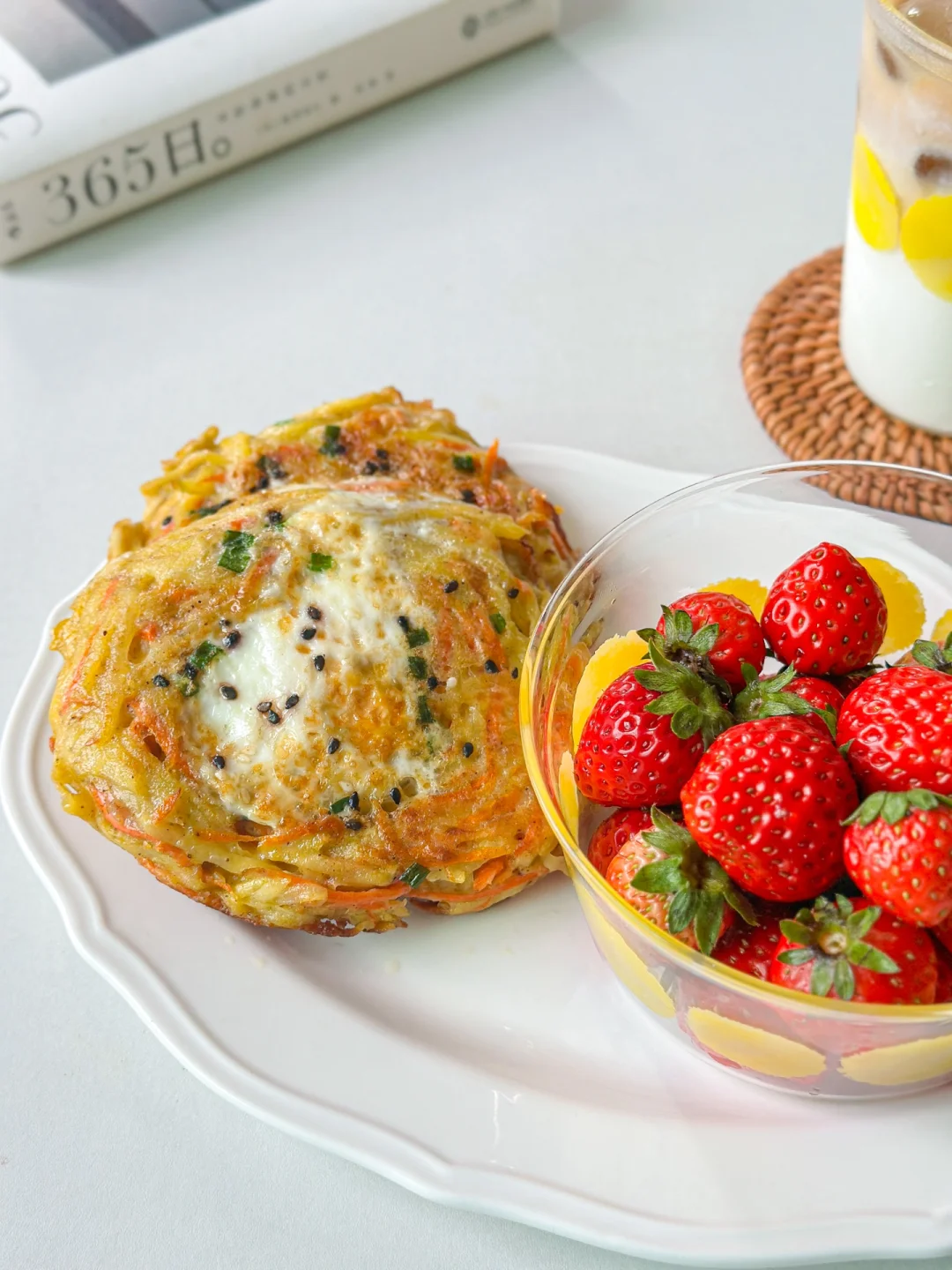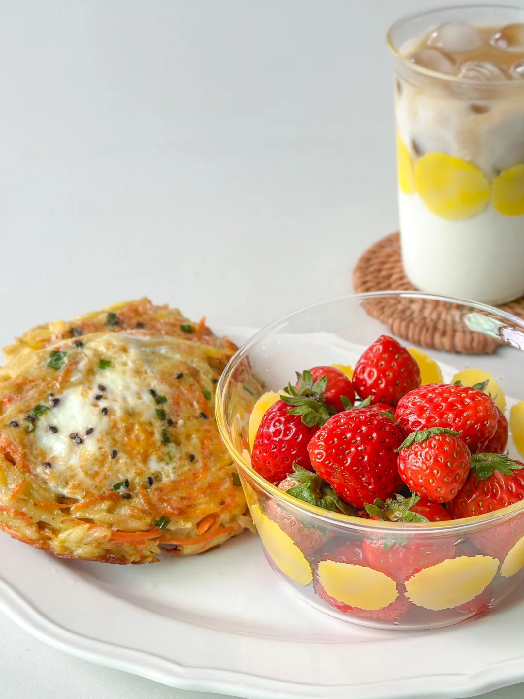 煎好的土豆丝鸡蛋饼当早餐可香了,再搭配一小碗水果和一杯拿铁开启元气满满的一天!🍽️