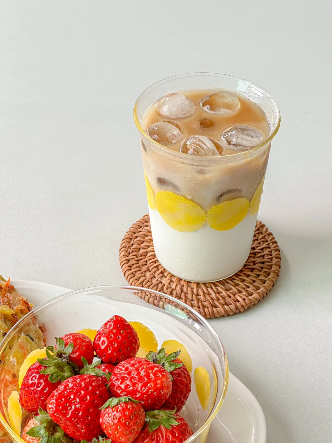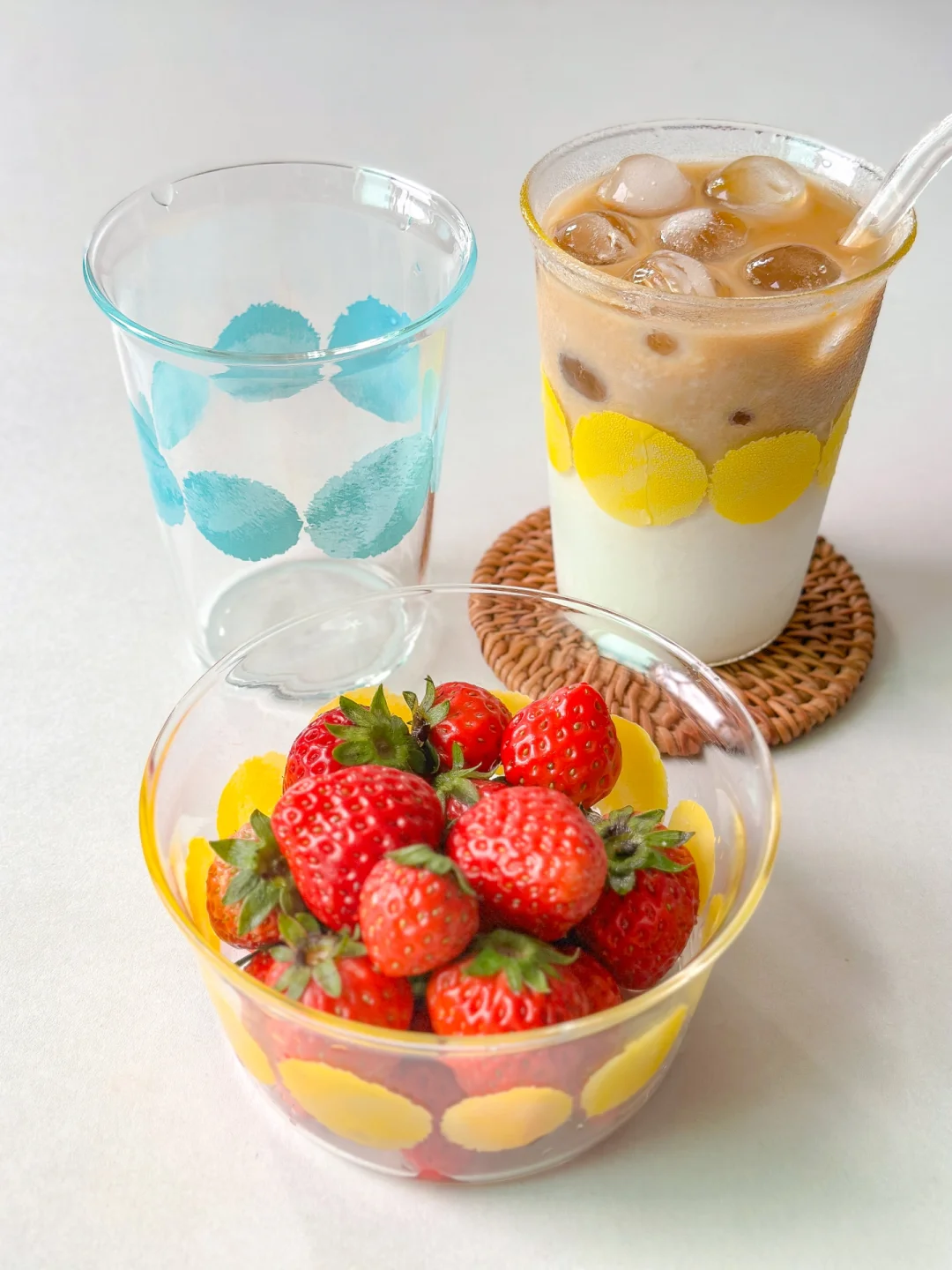 今天用的玻璃碗和杯子来自昔原商店哦~绕了一圈的小圆球好喜欢!还有蓝色的都好好看🫧