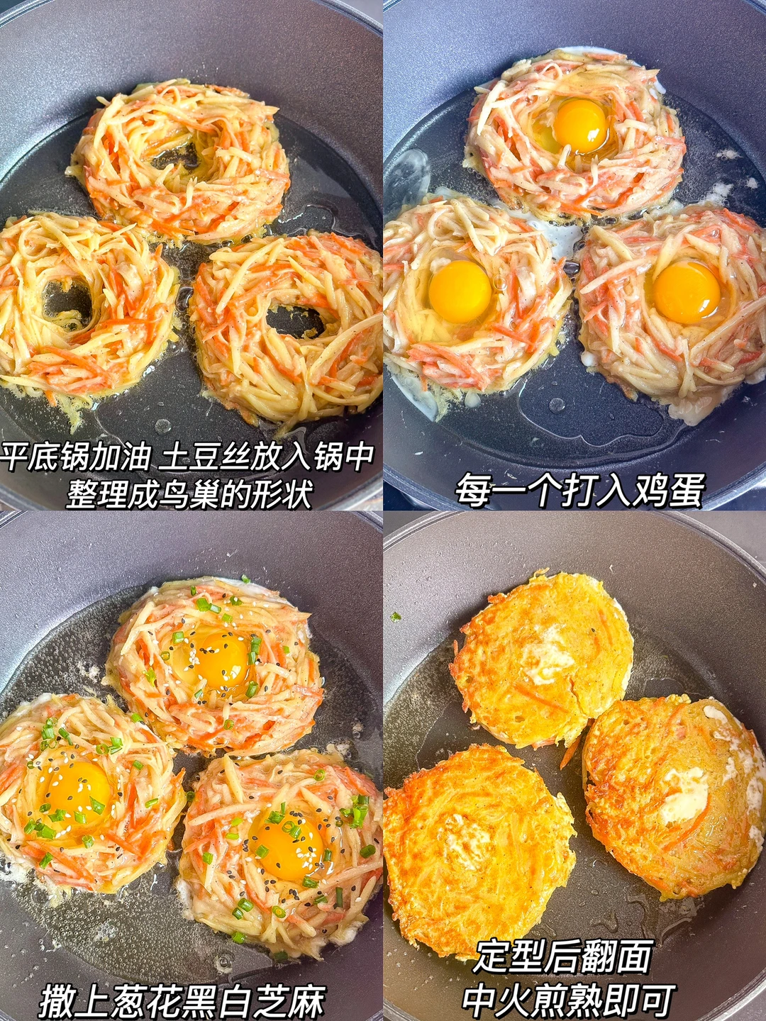 2️⃣平底锅加油,土豆丝放入锅中,整理成鸟巢的形状,打入鸡蛋,撒上葱花黑白芝麻,定型后翻面,中火煎熟即可