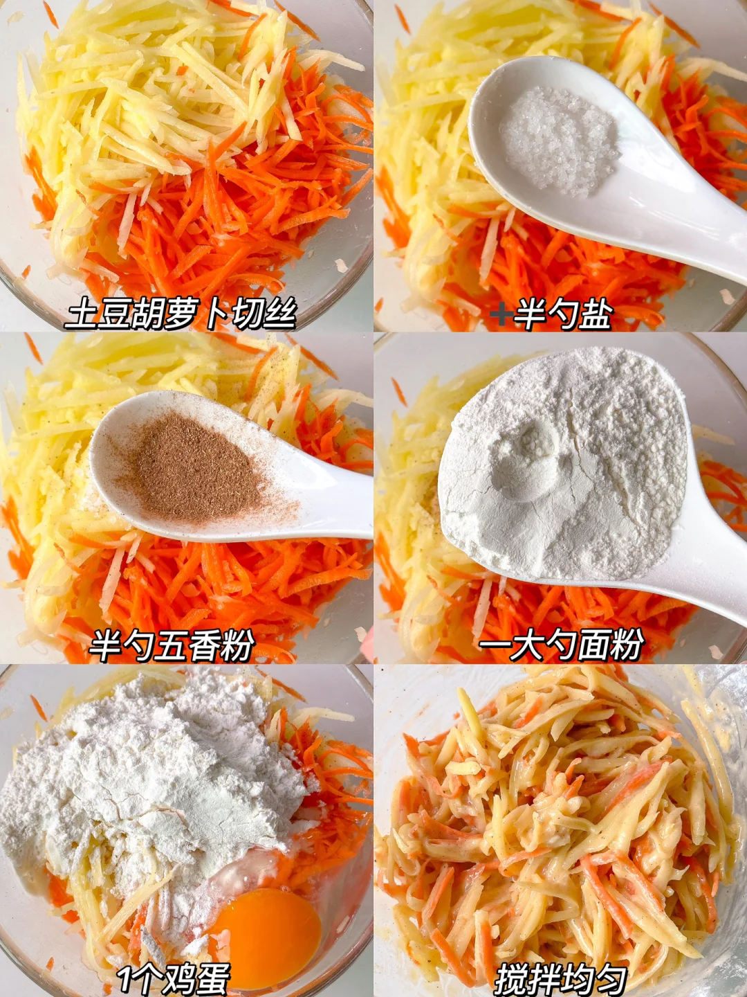 1️⃣土豆胡萝卜切丝➕半勺盐➕半勺五香粉➕1大勺子面粉➕1个鸡蛋搅拌均匀