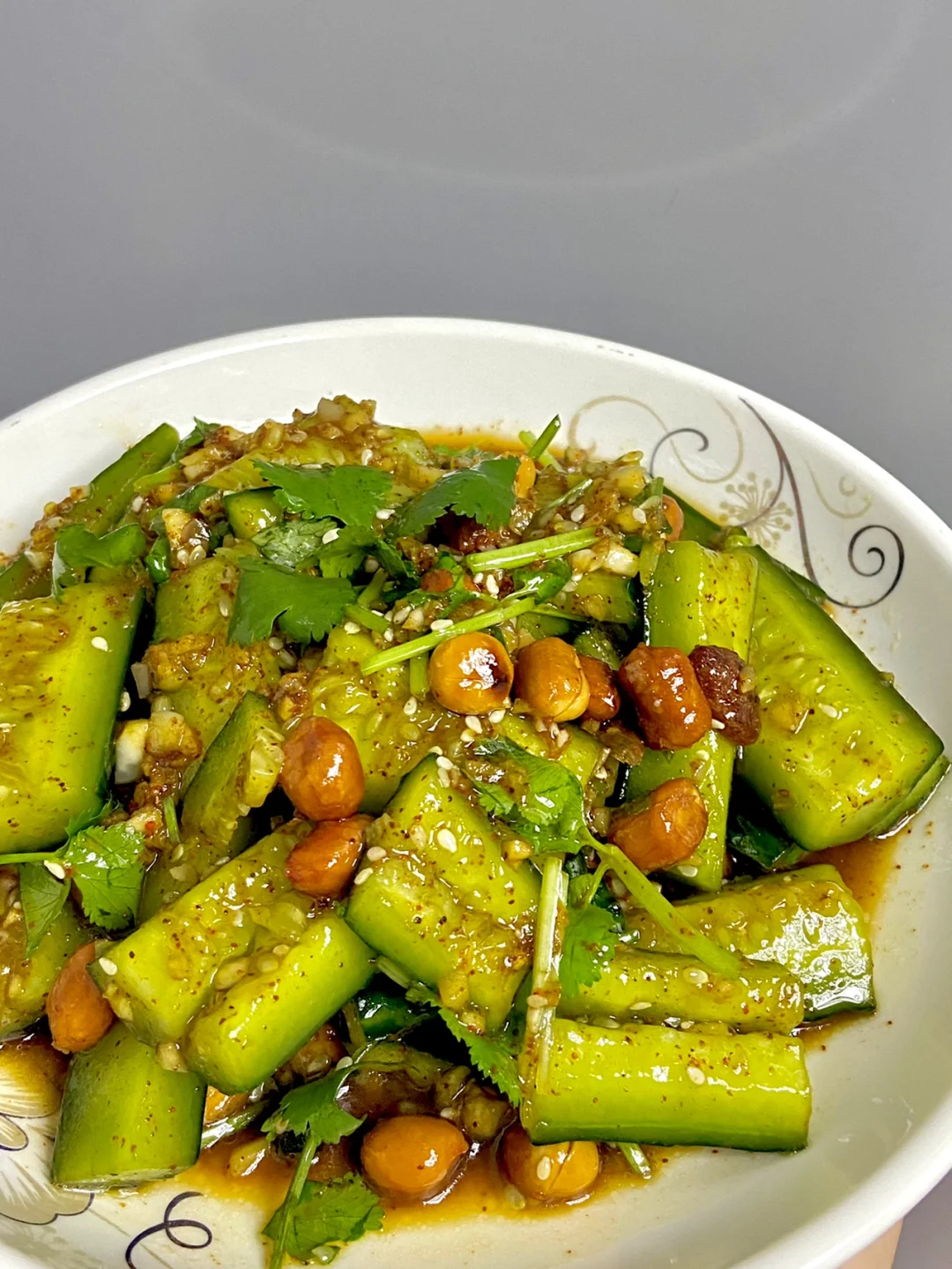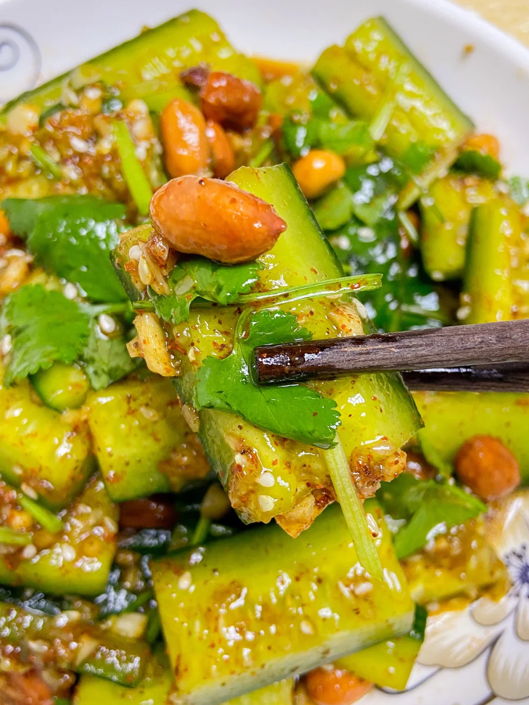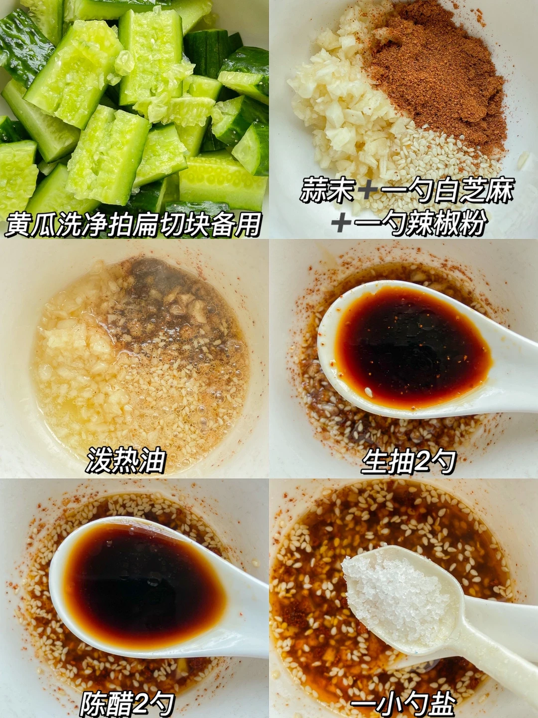 天气转热后我们家每天换着凉拌菜吃🐷今天做了份拍黄瓜上桌就秒光 开胃又下饭😘 准备食材✨✨✨✨✨ 黄瓜一根 花生米 香菜 辣椒粉 蒜末 白芝麻 生抽 陈醋 做法✨✨✨✨✨ 1️⃣黄瓜洗净拍扁切块备用 2️⃣蒜末➕一勺白芝麻➕一勺辣椒粉 泼热油➕两勺生抽➕两勺陈醋➕一小勺盐➕一小勺糖搅拌均匀 3️⃣调好的凉拌汁倒入黄瓜中 加入花生米 香菜 混合均匀即可 简单又好吃 味道跟店里的一样 喜欢的宝宝们可以试试✌🏻