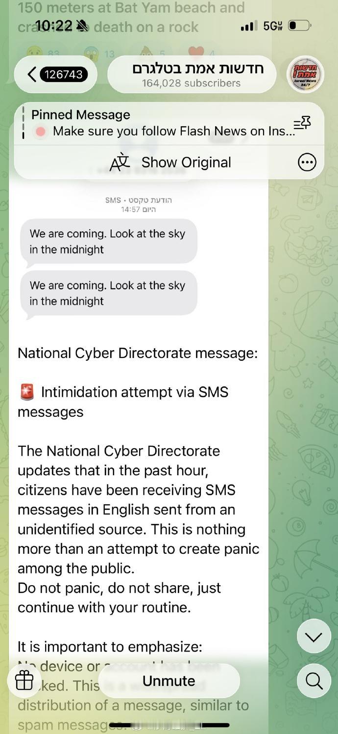 据媒体报道,今天有许多以色列人收到骚扰短信,内容是:“我们来了,午夜抬头望天”。 对此以色列网络管理部门很快进行了回应,称这是有人试图在以色列民间制造恐慌,呼吁民众不要相信也不要转发。