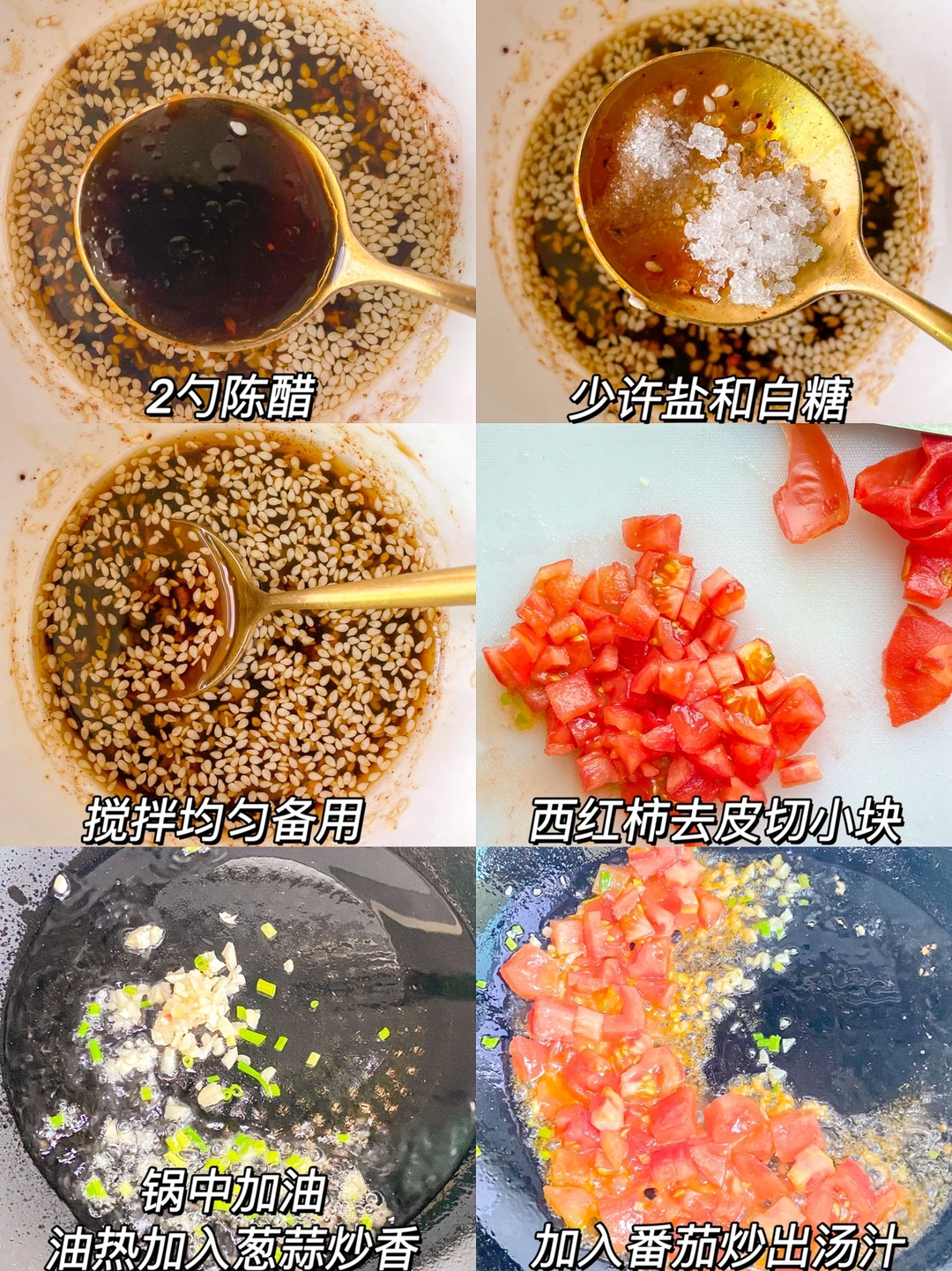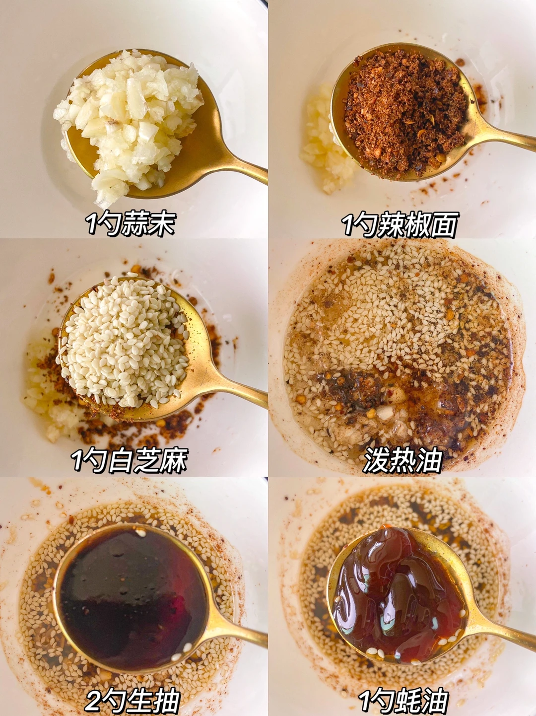 1⃣调酱料:1勺蒜末➕1勺辣椒面➕1勺白芝麻 泼热油➕2勺生抽➕1勺蚝油➕2勺陈醋 少许盐糖搅拌均匀备用