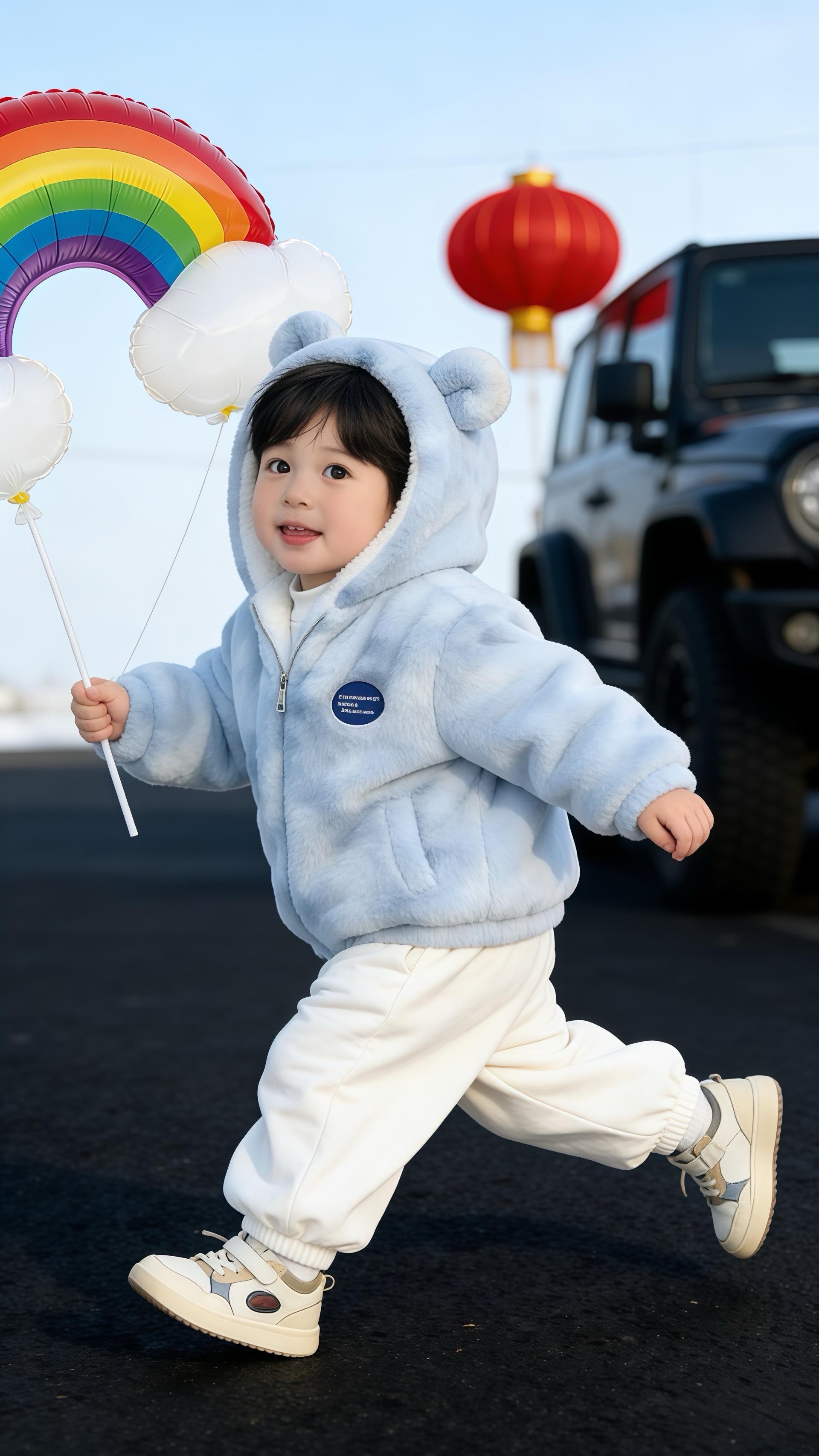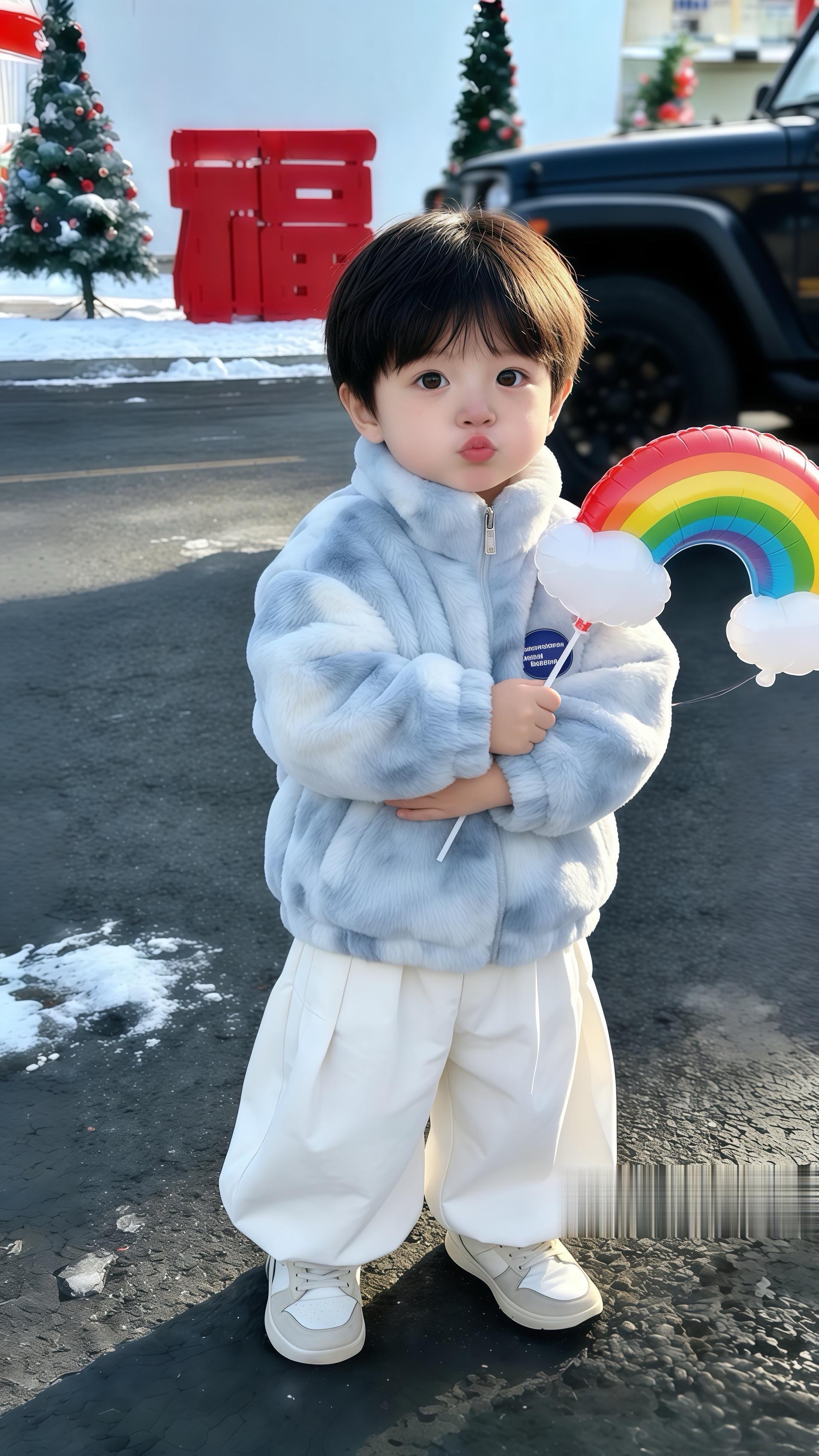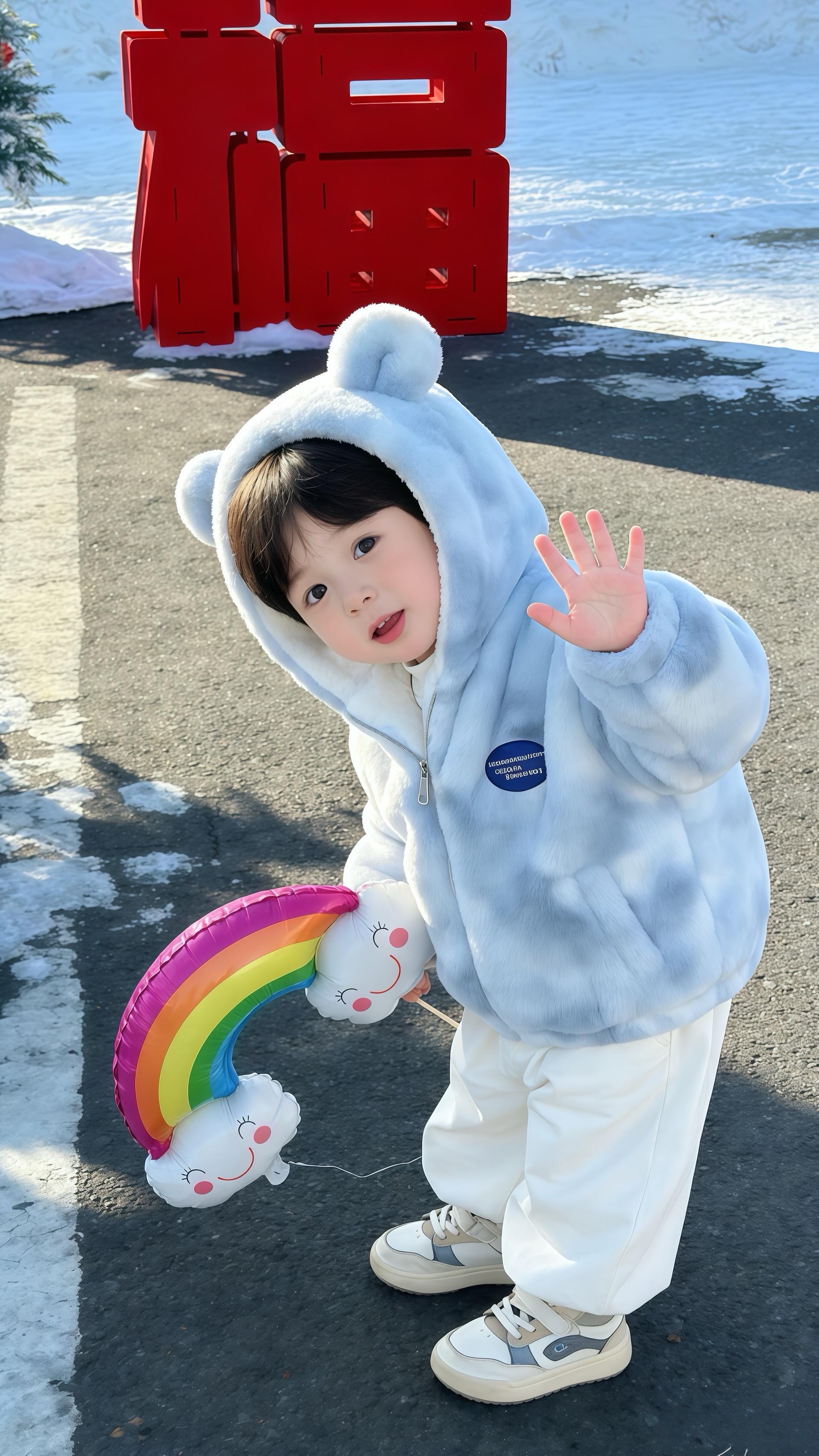 男宝冬日穿搭选这款雾霾蓝毛绒外套准没错!软乎乎的仿兔毛材质超保暖,连帽小熊耳朵设计萌趣值拉满,搭配白色休闲裤清爽又可爱!❤️