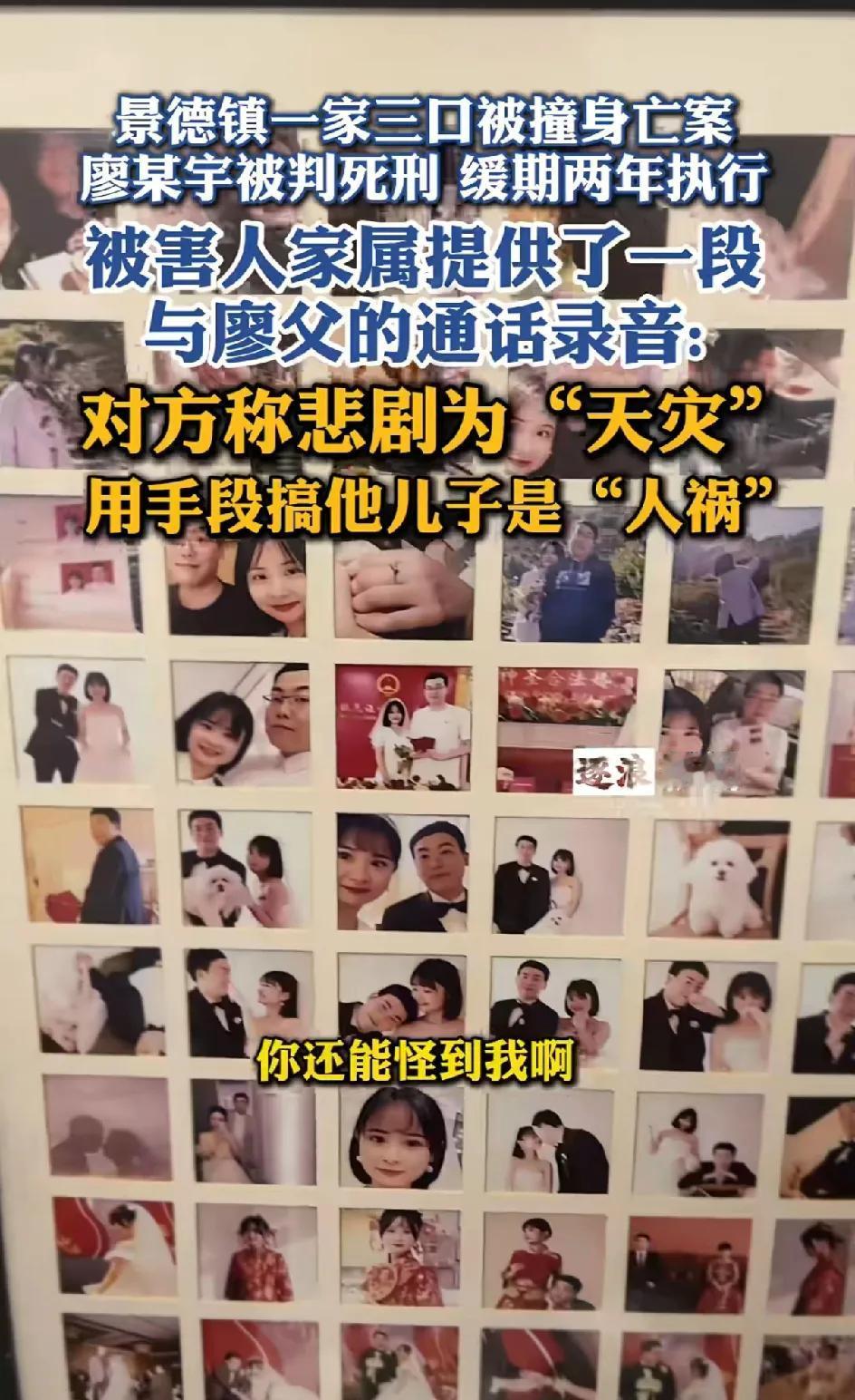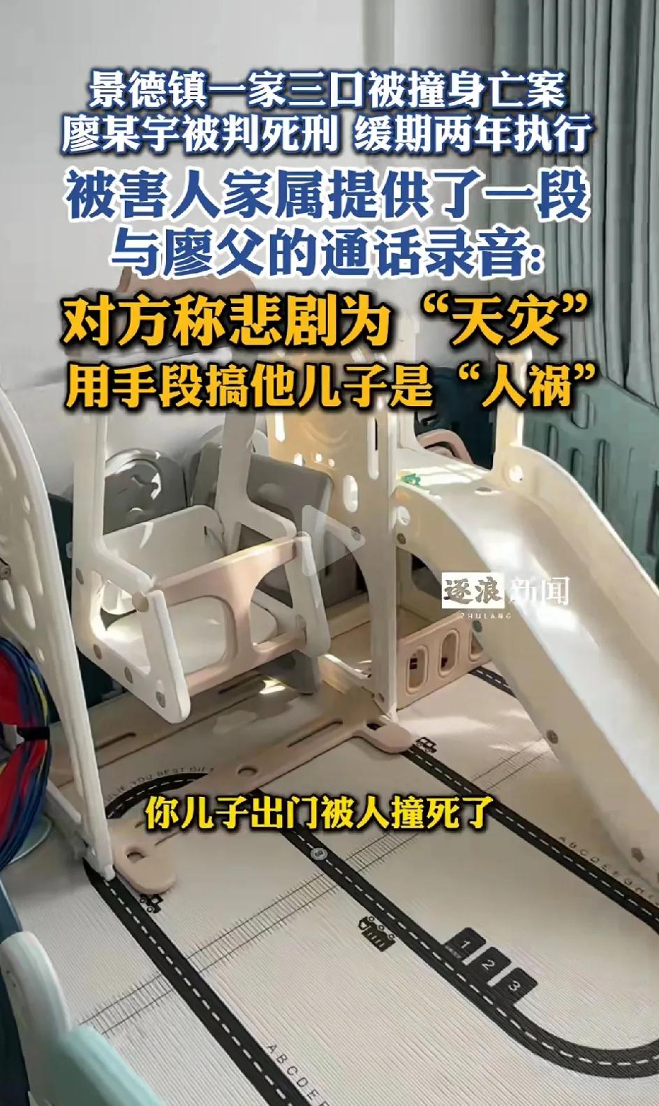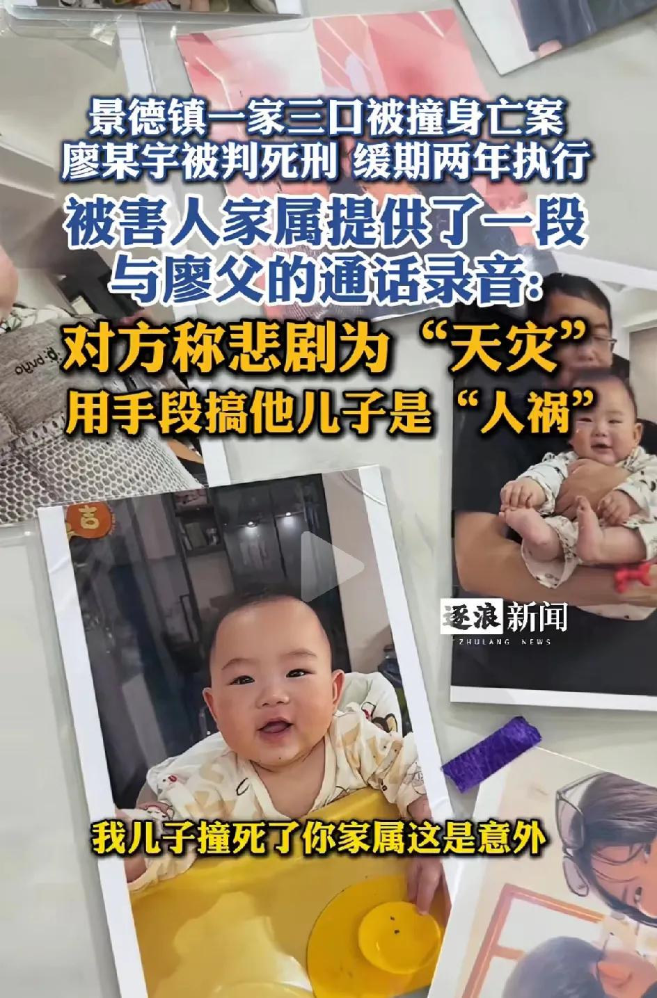景德镇,肇事者撞死一家三口,判死缓。”网友们都是意难平啊,三条人命换来一个肇事者不用死。 受害者的父亲罕见露面,他说我平常都没有露面,是因为我们家人都很低调平和。不想把矛盾扩大化,我不想说什么,只等待法律公平公正的判决。可是在庭审现场,肇事者的父亲居然冲撞受害者请的律师,质问为什么要这样搞他的儿子。 害了别人一家三口,居然没有一点悔过,没有一点内疚。还能反过来指责对方。 如此的冷血自私。 受害者家属还放出了肇事者父亲的电话录音。讲的话简直毁人三观。我儿子撞死了你们家人,这是意外, 。你们儿子出门让人撞死了,能怪到我吗?现在来搞我儿子。 听了,让人悲愤又难过。