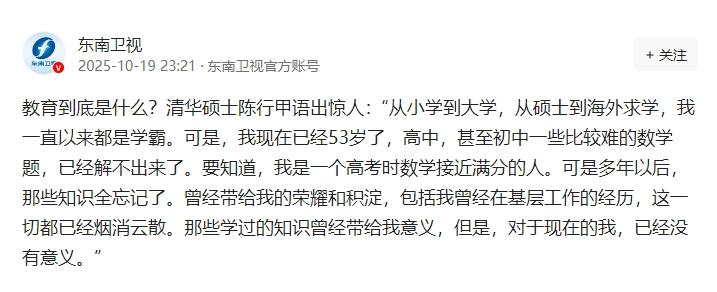 教育到底是什么?清华硕士陈行甲语出惊人:“从小学到大学,从硕士到海外求学,我一直以来都是学霸。可是,我现在已经53岁了,高中,甚至初中一些比较难的数学题,已经解不出来了。要知道,我是一个高考时数学接近满分的人。可是多年以后,那些知识全忘记了。曾经带给我的荣耀和积淀,包括我曾经在基层工作的经历,这一切都已经烟消云散。那些学过的知识曾经带给我意义,但是,对于现在的我,已经没有意义。”   咱们的大脑啊,特像个精明的管家,它会定期检查家里的东西,那些你天天用、经常摸的,它会擦得锃亮,放在最顺手的地方。   而那些好久不动、压箱底的知识,它就会觉得占地方,慢慢打包收起来,塞到犄角旮旯里,直到你彻底想不起来。   一个学心理学的,要是后来专门做市场分析,那大学里背的那些临床诊断标准,自然也就慢慢模糊了。   当然,这也不是说就忘得一干二净,有研究发现,就算是毕业25年的医生,那些基础医学知识虽然会忘掉一些,但底子还在,比普通人强得多,这说明,有些东西,还是刻进去了。   所以,问题的关键可能不在于我们忘了什么,而在于我们的教育,从一开始就太看重“记住”这件事,很多人把咱们过去的教育模式叫做“工厂流水线”   它诞生在工业时代,目标很明确,就是培养出守规矩、听指挥、能上螺丝的标准化人才,在这条流水线上,学生是“毛坯”,教材是“模具”,考试是“质检”。   这种模式最擅长训练记忆和服从,但却很少鼓励你去提问,去挑战,去创造。   结果就是,很多人拿着漂亮的成绩单走出校门,却不知道怎么理财,怎么处理亲密关系,怎么面对工作中的复杂人际,一下子就懵了。   但现在,时代早就变了,在AI能帮你写代码、搜索引擎能一秒告诉你答案的今天,光会背书,价值真的不大。   你背东西再快,快得过电脑吗?现在的老板招人,也越来越不只看成绩单了,有调查显示,不到四成的美国公司还把绩点当成主要的筛选标准。   他们真正想要的,是那些机器干不了的活儿,是所谓的“软实力”,将近九成的老板都认为,最重要的能力是解决问题的本事,其次是团队合作、沟通、积极性和职业素养。   这些“本事”,才是现在职场上真正的硬通货。   真正的教育,是把你这个人给“点亮”,是促进你全面的成长,让你成为一个自信、善良、有好奇心,并且能独立思考的人。   它不只发生在教室里,也发生在你读的每一本书、经历的每一件事、与人交往的每一个瞬间。   教育最终要给你的,不是那些早晚会忘掉的具体答案,而是在寻找答案的过程中,锻炼出的那一套思维方式和底层能力。   这套能力,才是教育给我们最宝贵的、谁也拿不走的东西,它是你看到一个复杂问题时,懂得抽丝剥茧、分析利弊的批判性思维。   它是你面对一个全新的领域时,有勇气和方法去学习、去适应的成长型心态,它是你能清晰地表达自己的观点,也能耐心地倾听别人,和团队一起把事情做成的协作能力。   这些能力,就像是我们人生的“操作系统”,不管外界怎么变化,你都能不断迭代,稳定运行。 信息来源:东南卫视