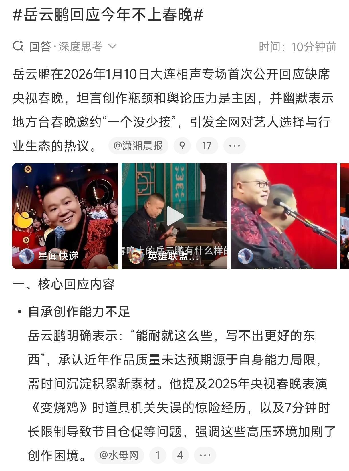 1月10号,大连的相声专场,岳云鹏摘了眼镜,没抖包袱,撂了句实在话:今年不上春晚了,以自己现在的能耐,写不出更好的东西。这话听着诚恳,可下一句就变了味——“地方台的春晚,该接的一个没少接。” 现场哄堂大笑,网友却吵翻了天。 有人说,这是实在人说了实在话。央视春晚那舞台,谁上谁知道。7分钟,就给你7分钟,还得过二十多轮审查,每个包袱都得政治正确,笑料得收着。 去年那个《变烧鸡》,道具出了岔子,台下还有观众直接喊“建议别上春晚了”,这话像根刺,扎心了。 他后来说,每次春晚结束,大半年都睡不好,网上骂声能把他淹了,压力大到植物神经紊乱。 这回主动退出,算保命。 可也有人算账:一边说着能力不足要沉淀,另一边地方台邀约照单全收,这不矛盾吗?江苏、湖南、东方卫视……一个没落。 网友挺尖刻:“说白了,地方台真给钱,要求也松,央视又严又挨骂,傻子才选。” 这话刺耳,但点出了门道。地方台能给15分钟,让你慢慢铺,在央视,还没热身就得谢幕。岳云鹏这些年,笑场、忘词、嘴瓢,把“能耐”说成“耐能”,扇子藏小抄还被抓拍,失误确实不少。可根儿不在他一人身上。 连续九年,春晚相声几乎被他包场。新人上不来,老人不敢来,他成了唯一的“安全牌”。可安全牌打多了,就成了套路:调侃孙越体重,穿插老梗,最后唱首歌收尾。观众腻了,他也累了。 这次他说“写不出更好的”,听着像认输,我倒觉得是种清醒。承认瓶颈,比硬撑着装高手强。地方台成了他的避风港,也是试验田。在那里,他能喘口气,试试新活儿,找回说相声的乐子。 说到底,这事儿撕开了春晚语言类节目的伤疤。审查严、时间短、期待高,创作者在夹缝里求生。岳云鹏的转身,不是落幕,是给行业提了个醒:当舞台变成刑场,再好的演员也会枯萎。与其硬撑,不如退一步,守住自己能守的地盘。 相声是让人乐的,不是让人拧巴的。这话,他算说透了。