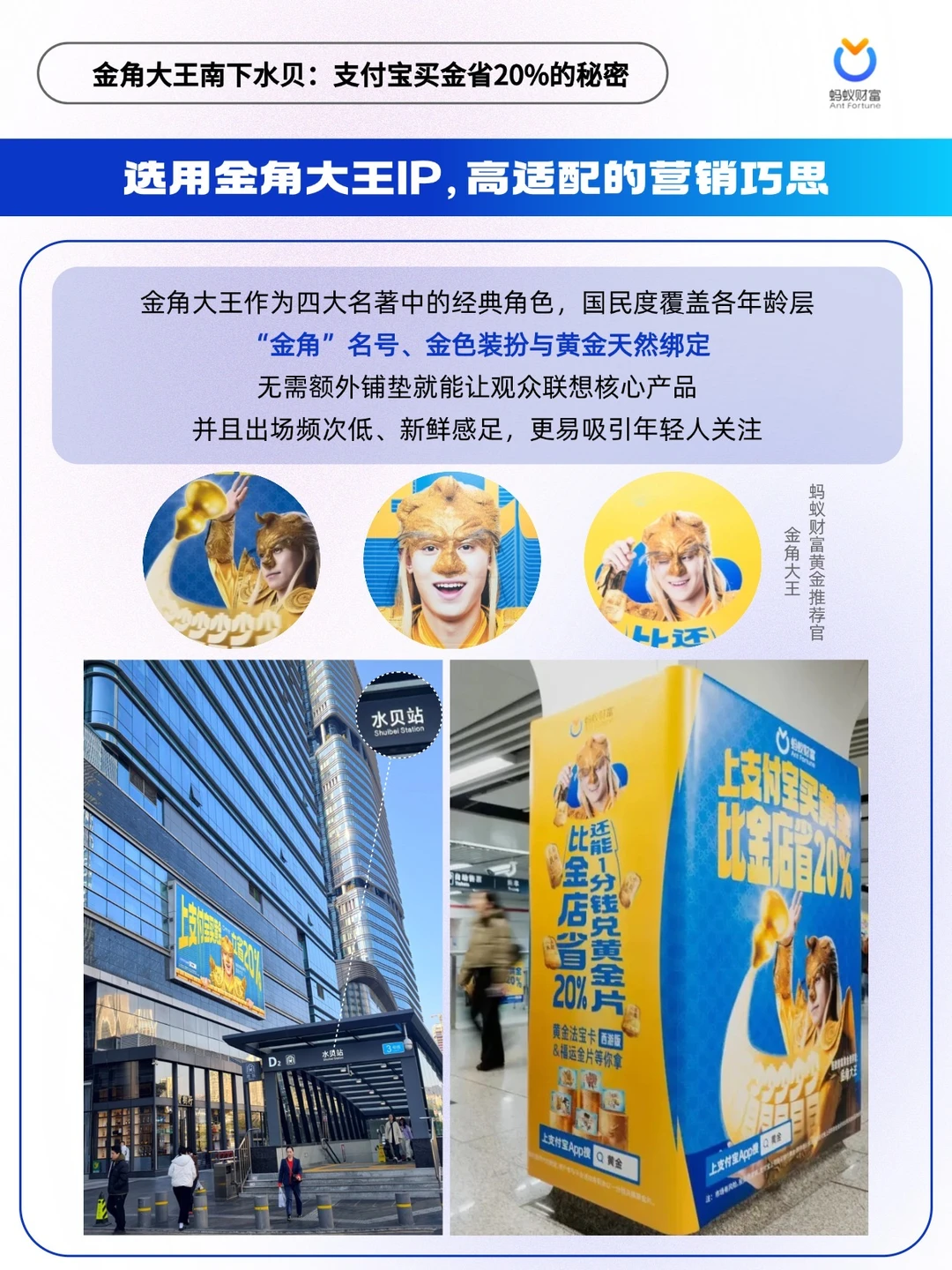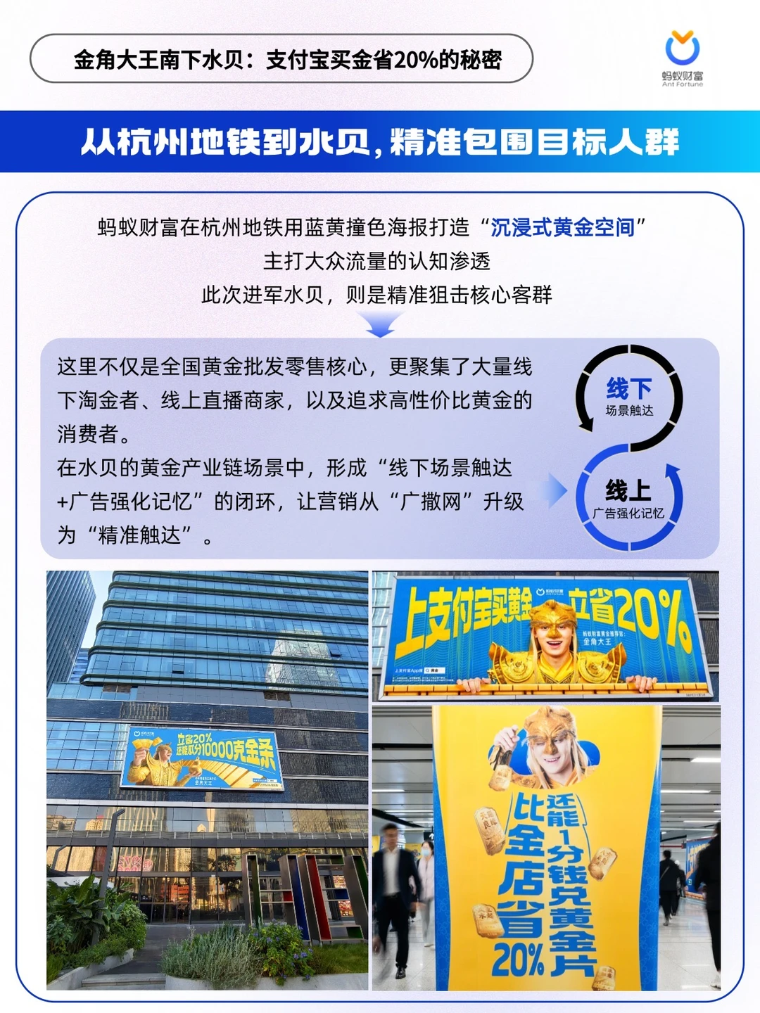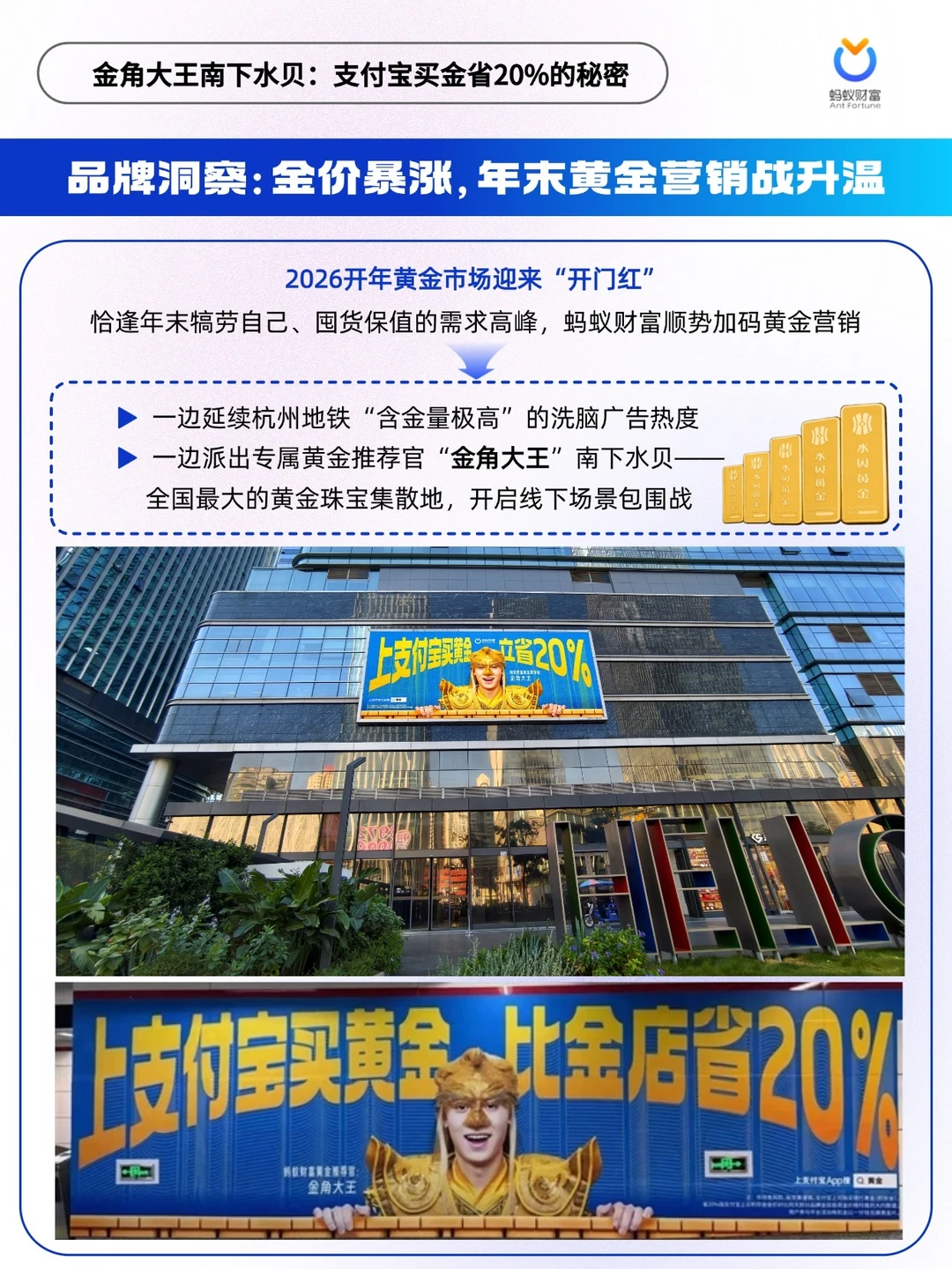 2026 开年金价走高📈,年末囤金热潮来袭,蚂蚁财富携“金角大王”IP 打响黄金营销战。从杭州地铁🚇沉浸式洗脑广告,到精准布局水贝黄金核心集散地,完成从大众认知渗透到核心客群狙击的闭环。