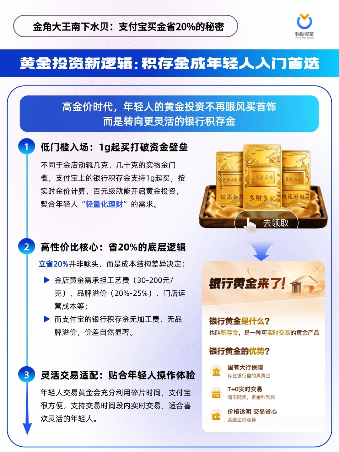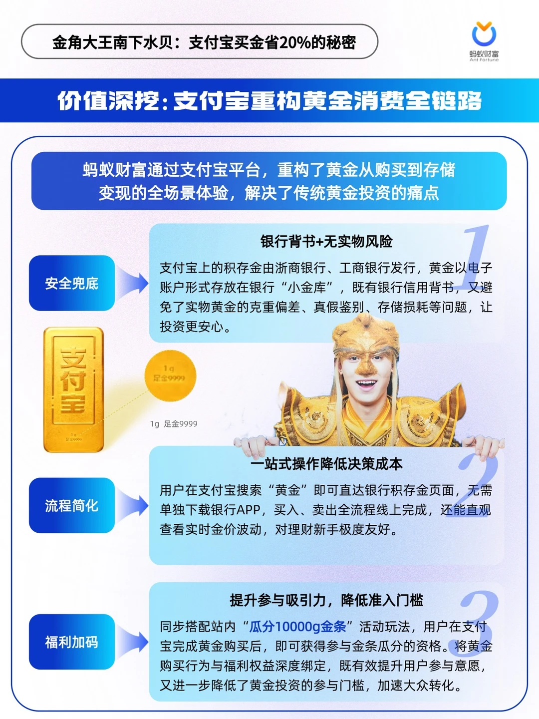 ✅金角大王凭借国民度与黄金强关联属性,以情怀撬动传播,精准吸引年轻群体。蚂蚁财富主推的银行积存金,以1g起买低门槛、立省20%高性价比、T+0 灵活交易,适配年轻人轻量化理财需求。