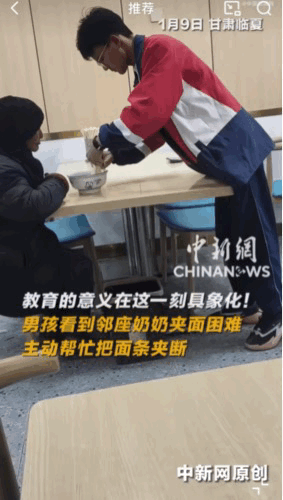感动。甘肃临夏一老人去面馆吃饭,由于年纪大了导致吃面困难。邻座的一位上高二年级的男生主动帮忙把老人碗里的面夹短,好让老人方便食用。 他小心的把面挑起来,神情专注的把面一点点夹断。 给人的感觉他们不是素不相识的陌生人,而是孙子在陪着奶奶吃饭。 这一幕恰好被同来吃饭的一位顾客看到了,就用手机拍了下来并发到了网络上,不想竟引来了400万人次观看,有超过4万人点赞了这一视频。 网友们有的说,教育的意义在这一刻体现出来了。有的说,少年自有少年强,他用行动诠释了善良。 这位同学的善意之举告诉了我们,“00”后的年轻人也是有担当有爱心的一代人。
