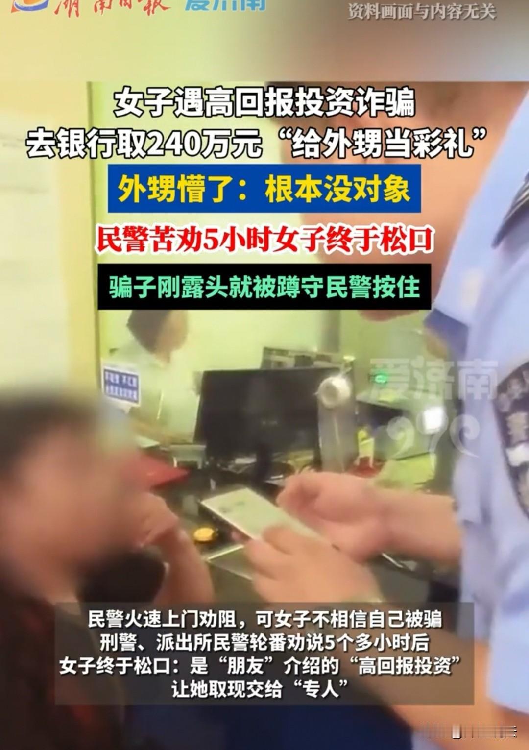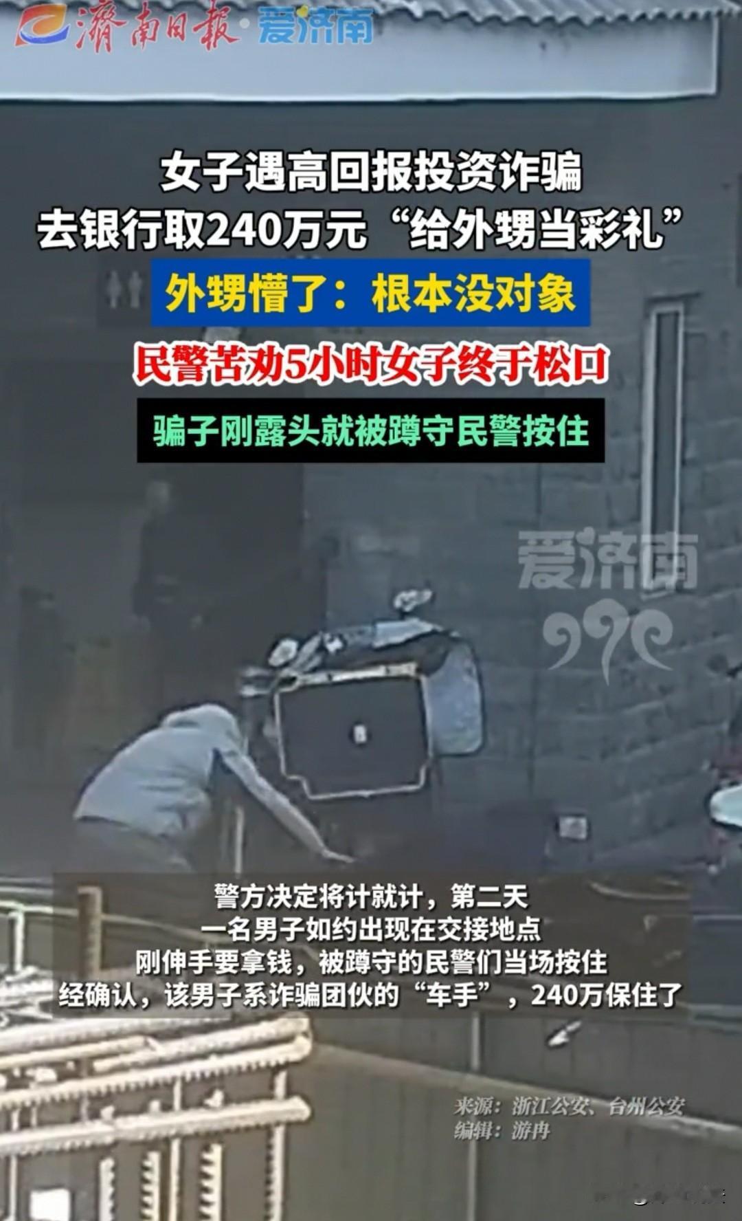 浙江台州,女子急匆匆到银行预约提取240万现金,坚称要给外甥当订婚彩礼,谁知民警一通电话核实,远在杭州的外甥在电话里直接懵了,直呼“我连对象都没有,哪来的彩礼”。民警结合外甥的反馈,苦劝女子5小时终戳穿高回报投资诈骗骗局,随后将计就计抓获嫌疑人,成功保住240万钱款。 (来源:浙江公安、台州公安,2026年1月11日) 2026年年初,浙江台州天台某银行的柜台前,一名女子神色焦灼地提出要预约提取240万元现金。 面对银行工作人员的询问,她语气笃定地表示,这笔钱是给远在杭州的外甥准备的订婚彩礼,还不停催促工作人员尽快办理,言语间透着一股不容置疑的急切。 可女子的说法,让银行工作人员察觉出诸多反常:当地订婚彩礼的数额远达不到240万的水平,且外甥在杭州订婚,彩礼却要特意回天台大额取现再转交,这完全不符合常理。 察觉到不对劲的工作人员,立刻将这一预警信息上报给了市县两级反诈警银专班。 警方接到消息后,第一时间拨通了女子外甥小杨的电话,想要核实订婚彩礼的情况。 电话那头的小杨刚听到民警的问题,瞬间懵在原地,语气满是诧异和不解:“彩礼?民警同志,我连对象都没谈,哪来的订婚一说啊?我姨妈从来没跟我提过这事,这肯定是搞错了!” 小杨还告诉民警,自己近期一直在杭州工作,根本没有回老家订婚的计划,对姨妈要取240万给彩礼的事毫不知情。 挂了电话,民警立刻赶往银行找到这名女子,将外甥的说法如实告知,同时提醒她大概率遭遇了诈骗。 可面对民警的反诈提醒,女子却始终执迷不悟,一口咬定就是给外甥准备彩礼,还觉得民警和银行工作人员是多管闲事,对民警的劝说表现出强烈的抵触情绪,执意要完成取现操作,嘴里还反复念叨着“我这是为了外甥好,你们别拦着”。 为了不让女子的血汗钱落入诈骗分子手中,刑警和派出所民警轮番上阵,开始了长达5个小时的劝说。 民警从常见的“高回报投资”诈骗套路讲起,拆解诈骗分子虚构投资项目、要求大额取现保密的惯用手段,又结合当地真实的反诈案例,分析此类骗局的危害性。 女子起初始终油盐不进,慢慢的,在民警细致的分析和耐心的劝导下,她的态度逐渐松动,眼神里也露出了犹豫。 最终,女子的心理防线被彻底攻破,她瘫坐在银行的椅子上,终于说出了实情:这笔钱根本不是给外甥的彩礼,而是她经“朋友”介绍,参与了一个所谓的“高回报保密投资项目”。 对方告诉她,只要将大额现金取出交给指定人员,就能获得数倍的收益,还反复叮嘱她这事绝对不能告诉任何人,否则投资就会泡汤。 她一时被高回报的噱头冲昏了头脑,又怕被家人阻拦,才编造了给外甥准备彩礼的借口。得知自己差点被骗走240万血汗钱,女子又悔又怕,忍不住红了眼眶。 了解真相后,警方决定将计就计,让女子按照诈骗分子的要求前往约定的交接地点,同时安排警力在周边提前布控蹲守。 第二天,当诈骗团伙负责转移资金的“车手”如约现身,刚伸手准备接过钱款时,埋伏在周围的民警立刻行动,当场将该男子抓获。 经核查,这名男子是诈骗团伙的核心成员之一,专门负责转移诈骗资金。目前,涉案男子已被警方依法控制,女子的240万元钱款被成功保住,相关案件正在进一步侦办中。 而远在杭州的小杨得知整个过程后,也特意致电民警表达感谢,同时在电话里反复叮嘱姨妈,今后遇到陌生的投资邀约一定要先和家人核实,切勿再轻信他人。 本案中诈骗团伙及涉案“车手”的行为已构成诈骗罪,且涉案金额240万元属于《刑法》规定的“数额特别巨大”范畴,量刑标准极为严苛。 根据《刑法》第266条规定,诈骗公私财物,数额特别巨大或者有其他特别严重情节的,处十年以上有期徒刑或者无期徒刑,并处罚金或者没收财产。 被抓获的“车手”虽未直接实施话术诱导,但其参与诈骗资金转移的关键环节,属于诈骗团伙的共犯,与主犯构成共同犯罪,同样应以诈骗罪定罪处罚,法院后续会根据其在共同犯罪中所起作用大小,作出相应量刑。 此外,银行工作人员的及时预警和警方的快速联动处置,是此次成功避免财产损失的关键。 大家身边还遇到过哪些以“投资”为幌子的诈骗套路?欢迎在评论区留言。